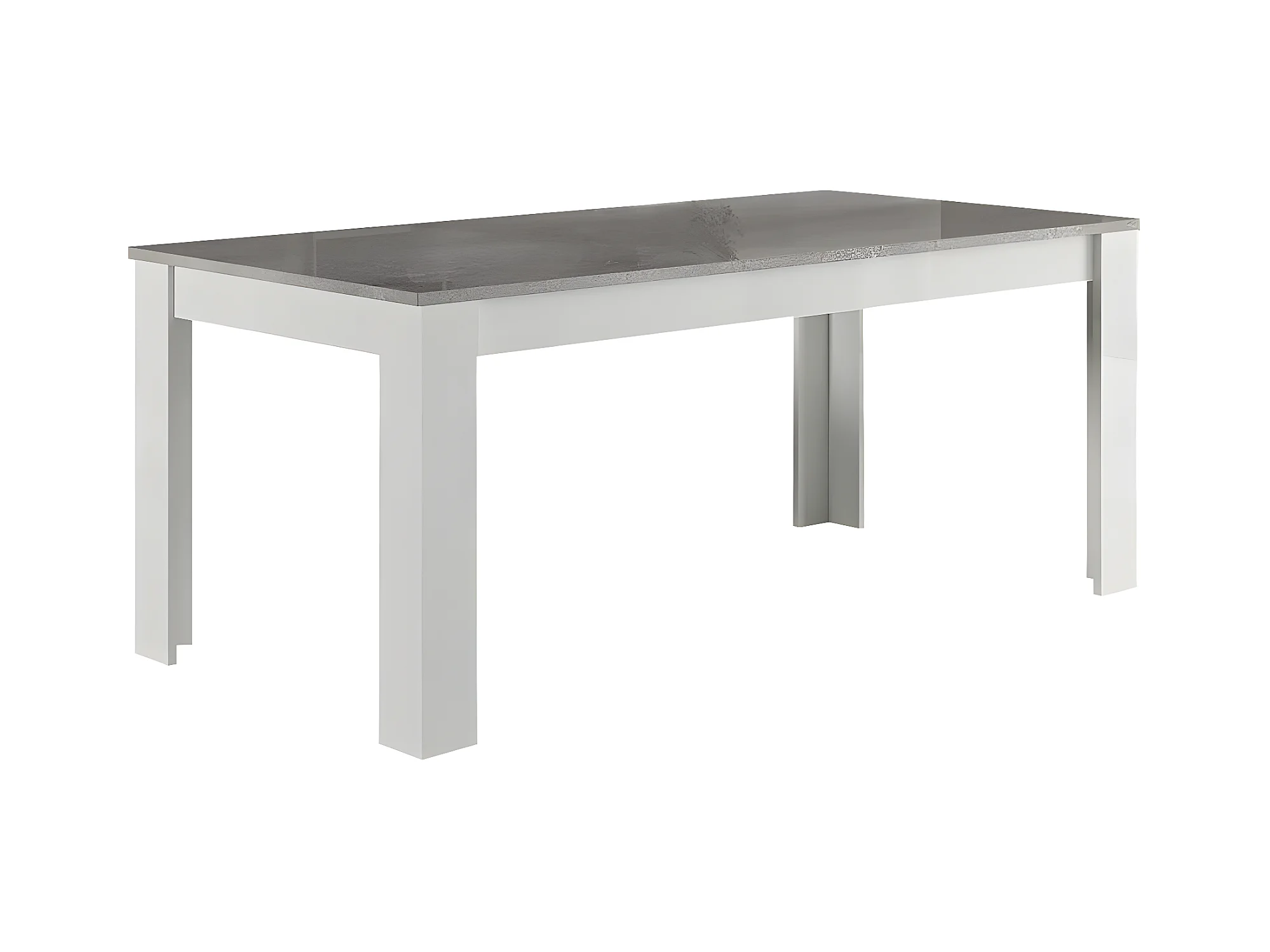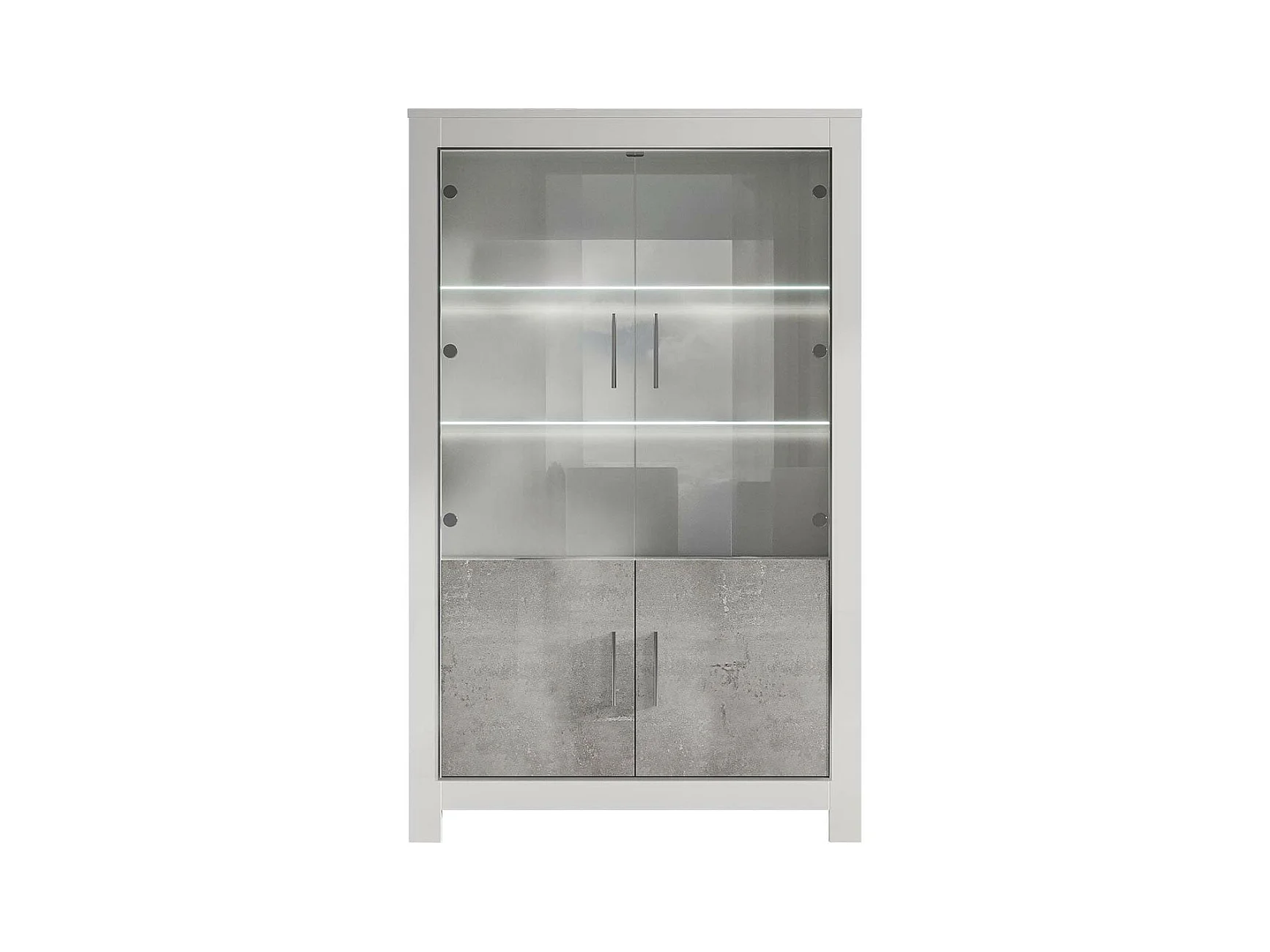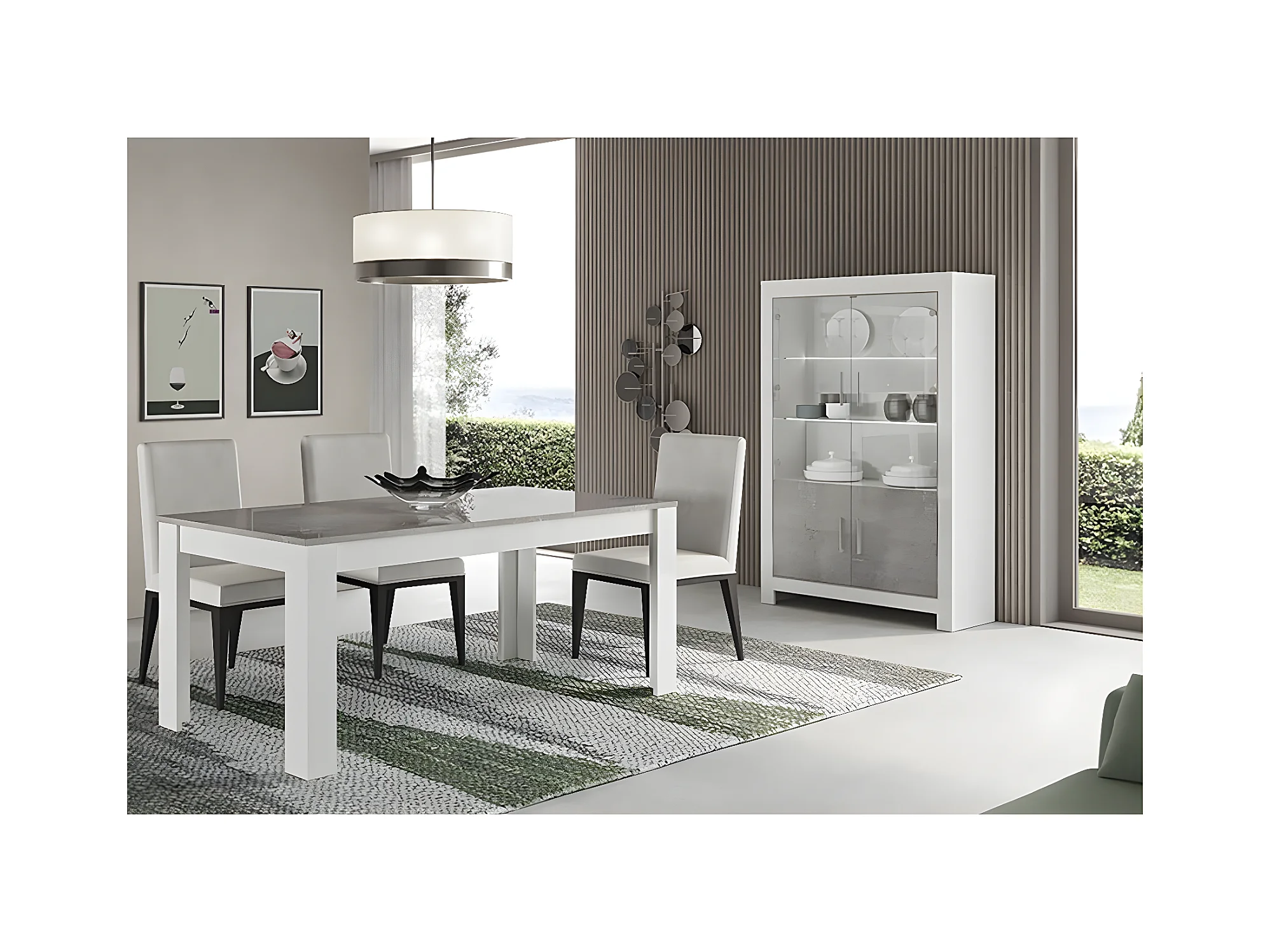 DENAE - Ensemble Séjour Blanc et Gris Marbré Table 160cm + Vitrine 4 Portes avec Leds