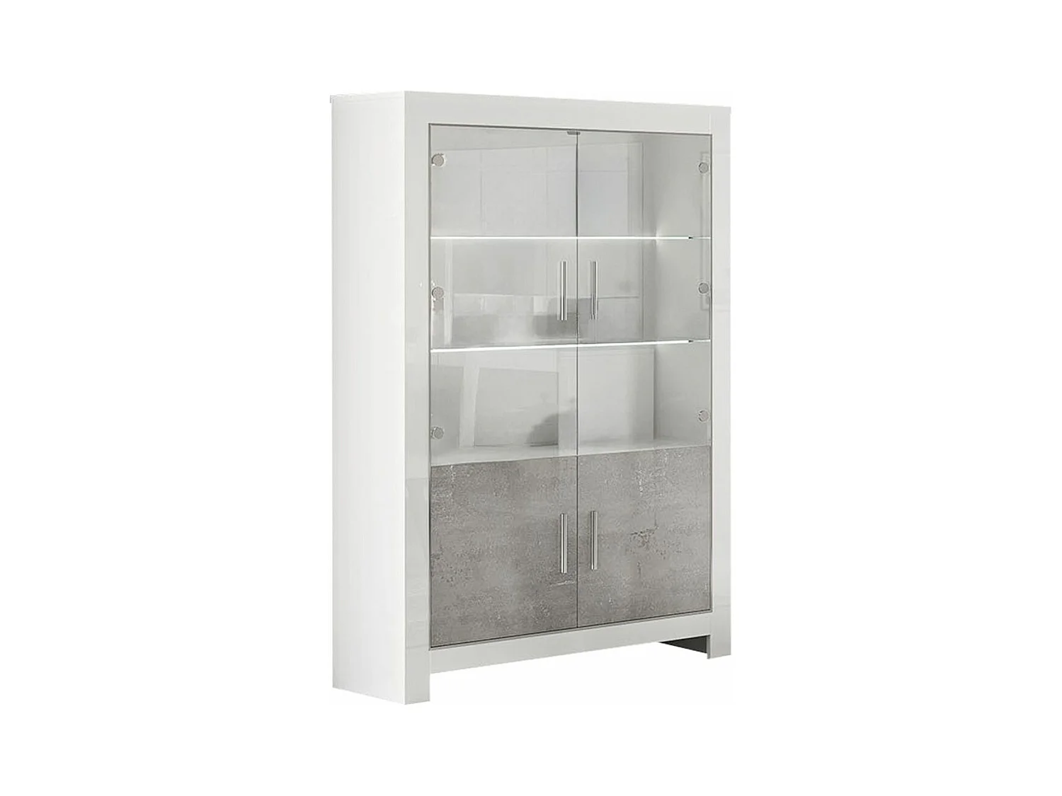 DENAE - Vitrine 4 Portes Laquée Blanc Brillant et Gris Marbré avec Leds