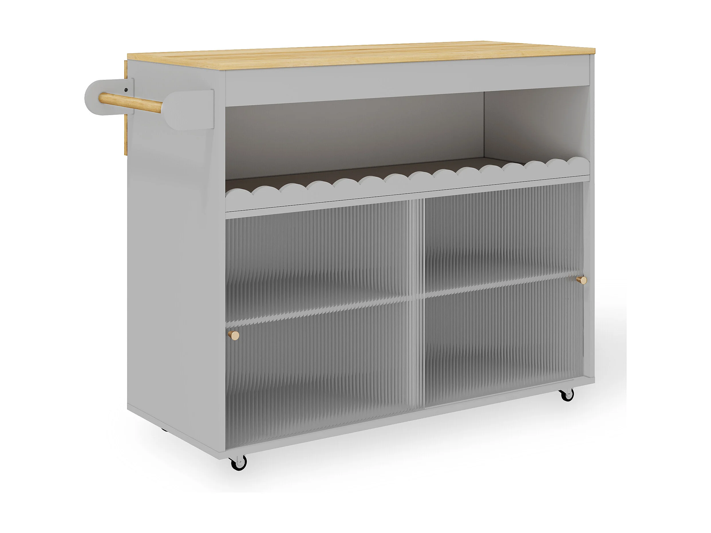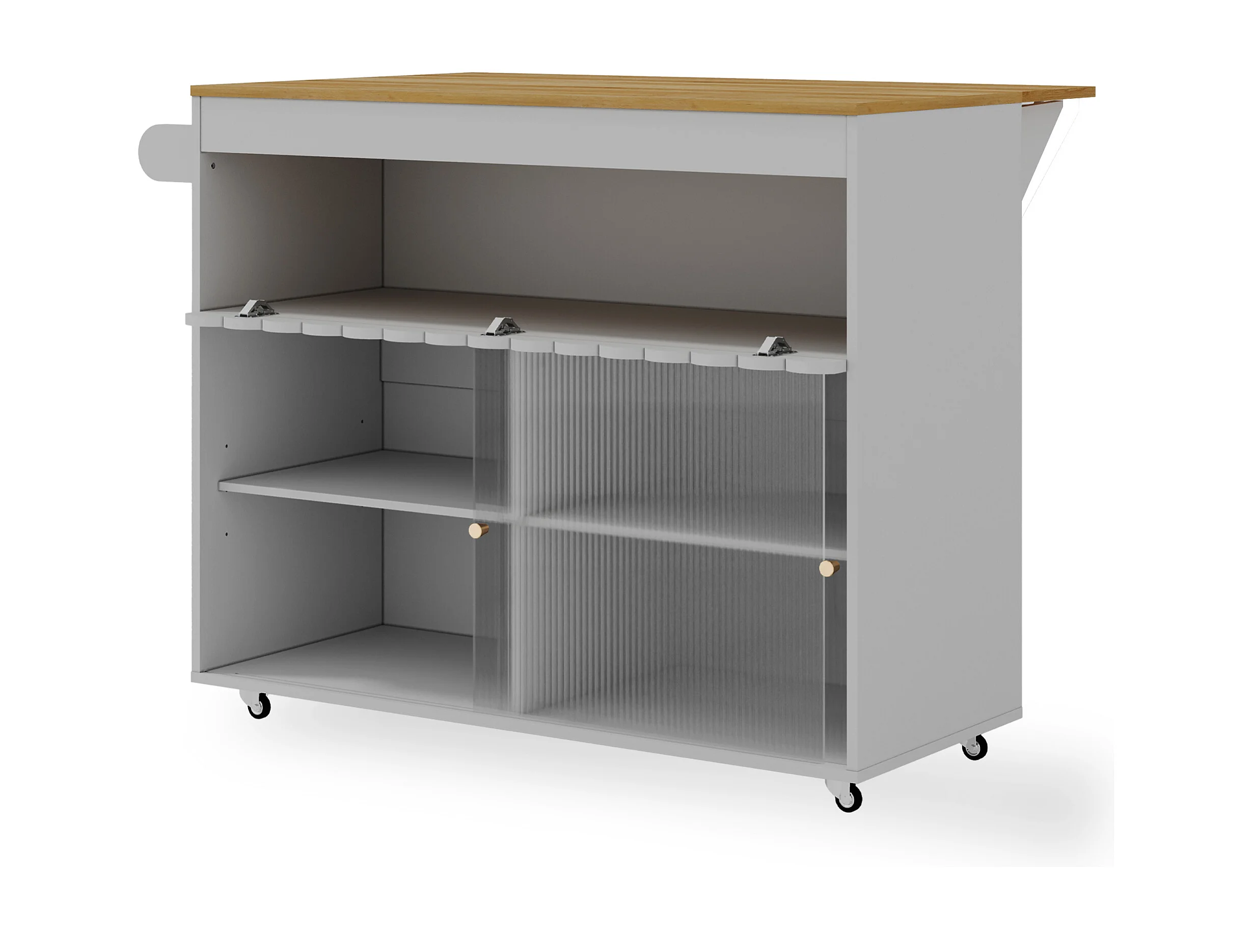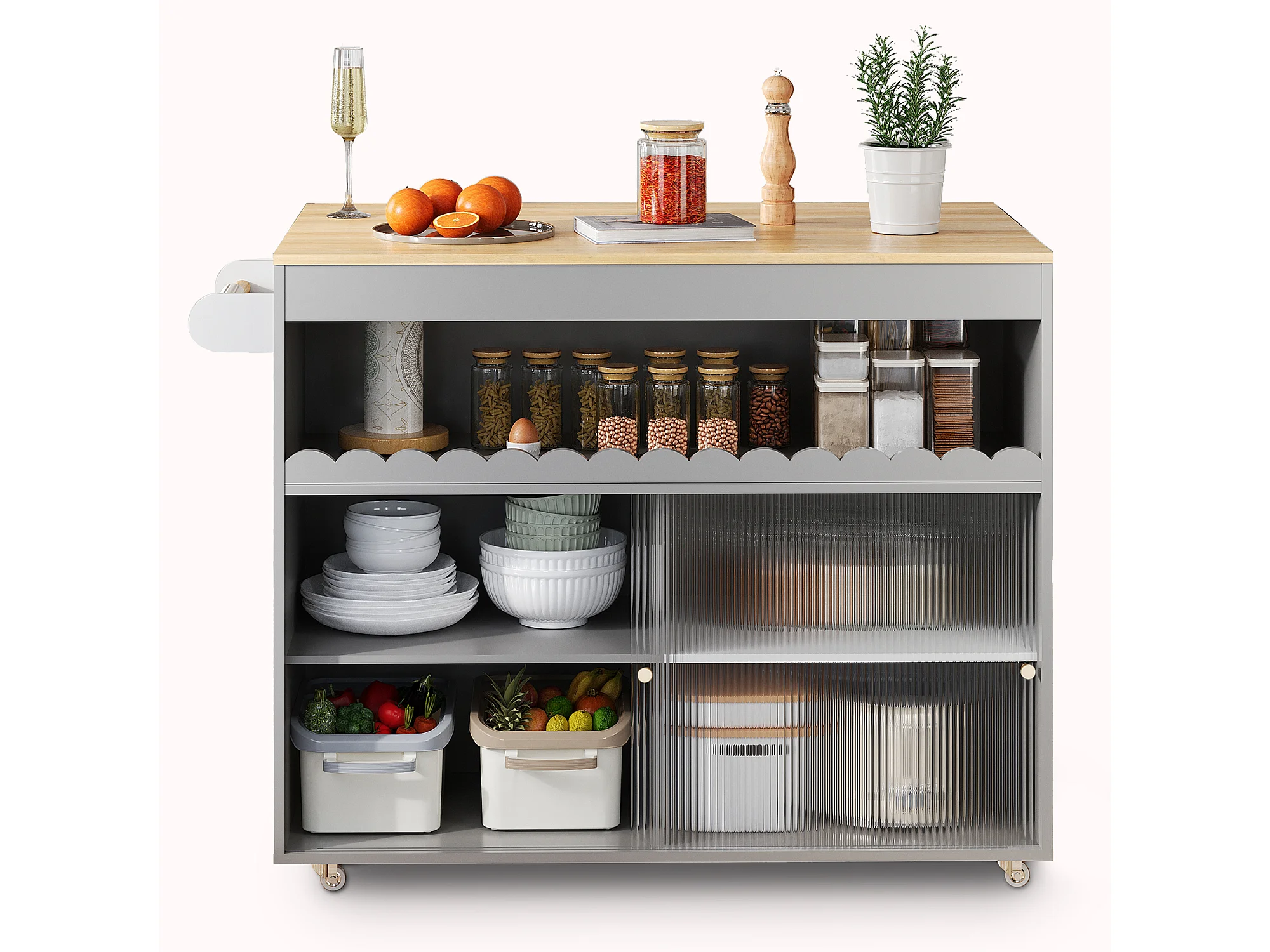 Desserte de cuisine gris avec plateau extensible, 2 portes coulissante en verre trempé et étagères ajustables-122x69x91cm