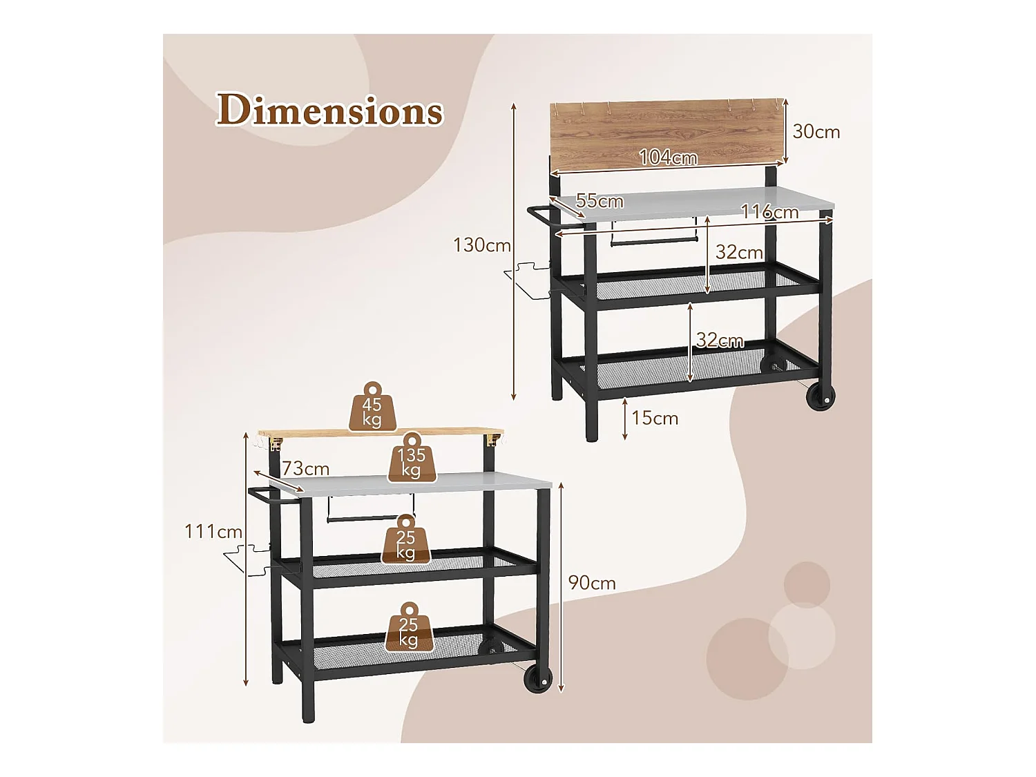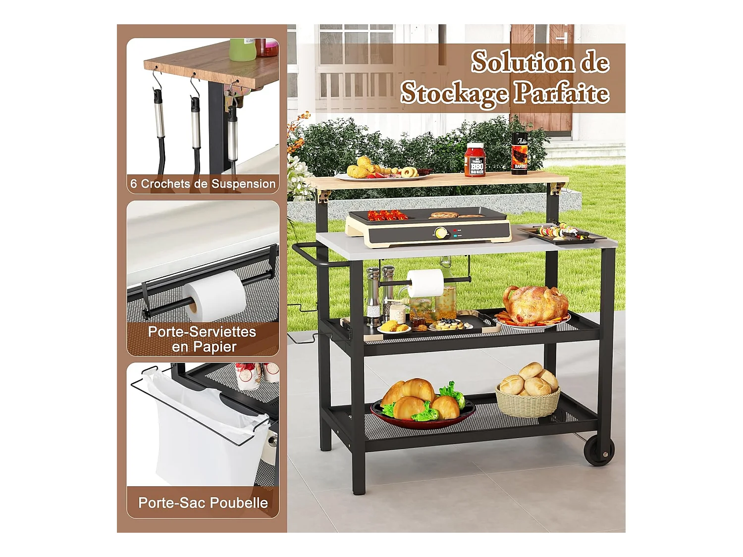 Desserte à roulettes avec Table Rabattable, Chariot Service de Cuisine à 3 Étagères avec Crochets Porte-Serviettes Support de Sac Poubelle