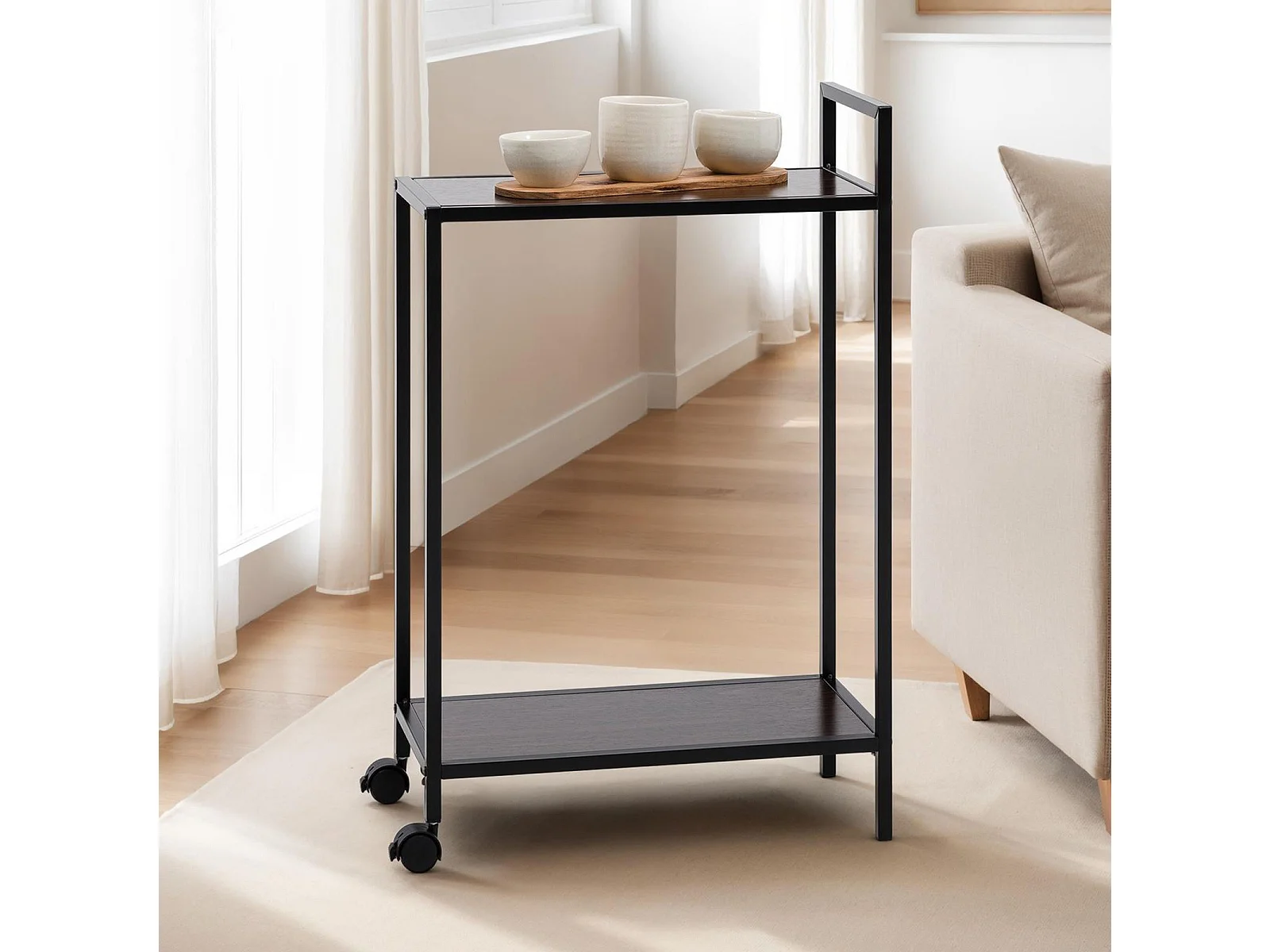 Desserte à roulettes RIVO, chariot de service pour cuisine, structure en métal et plateau en bois couleur noir et noyer