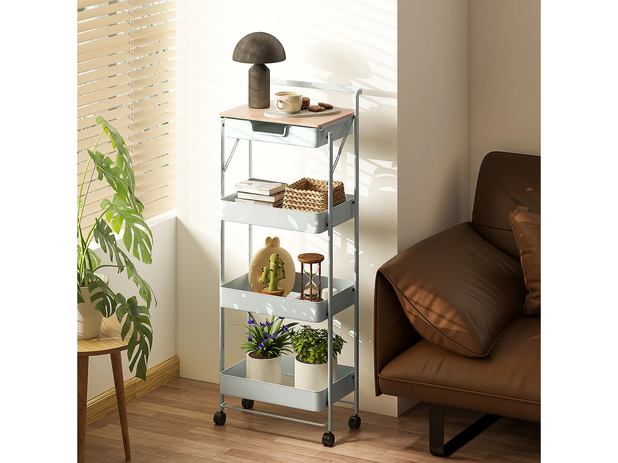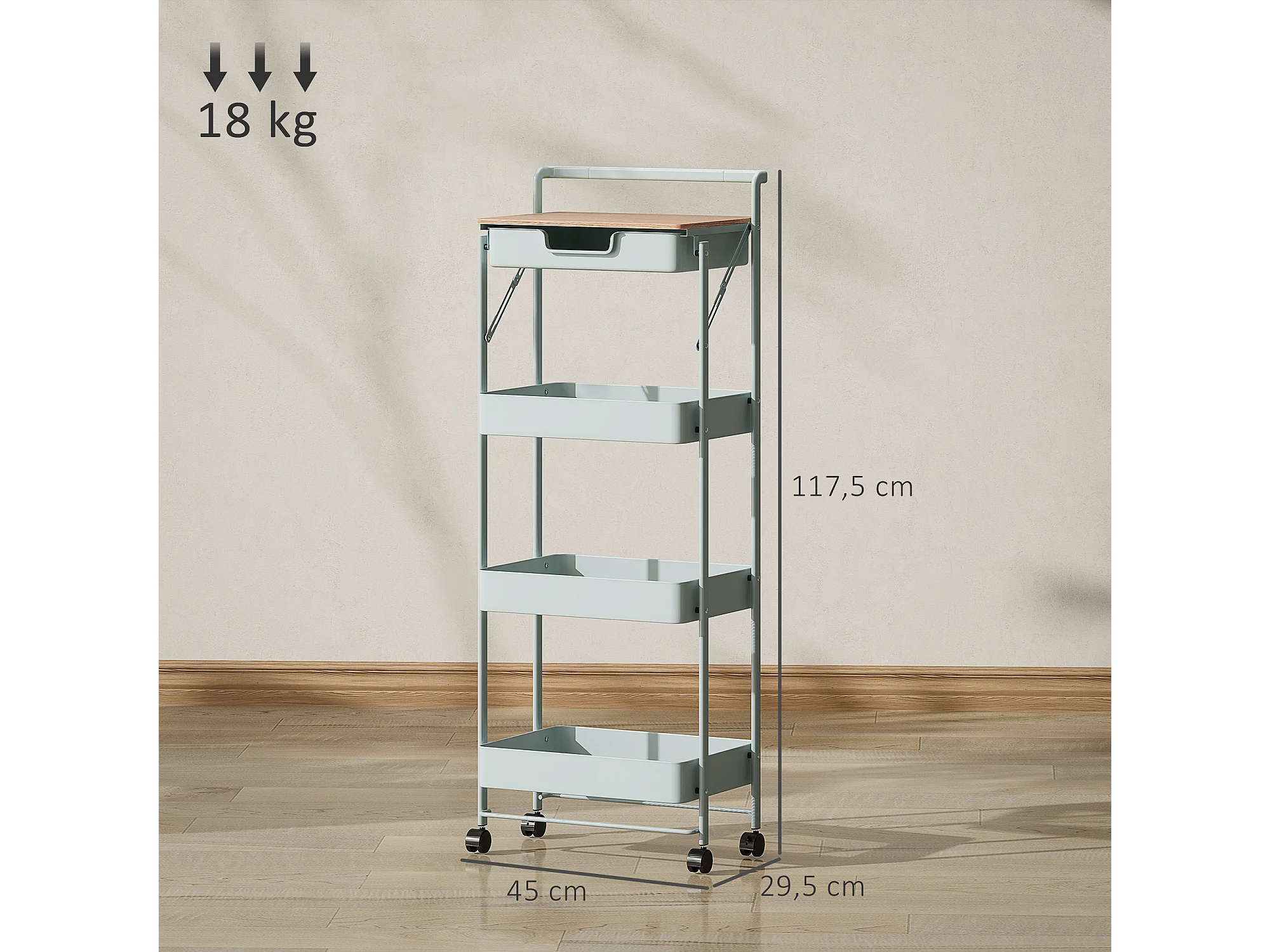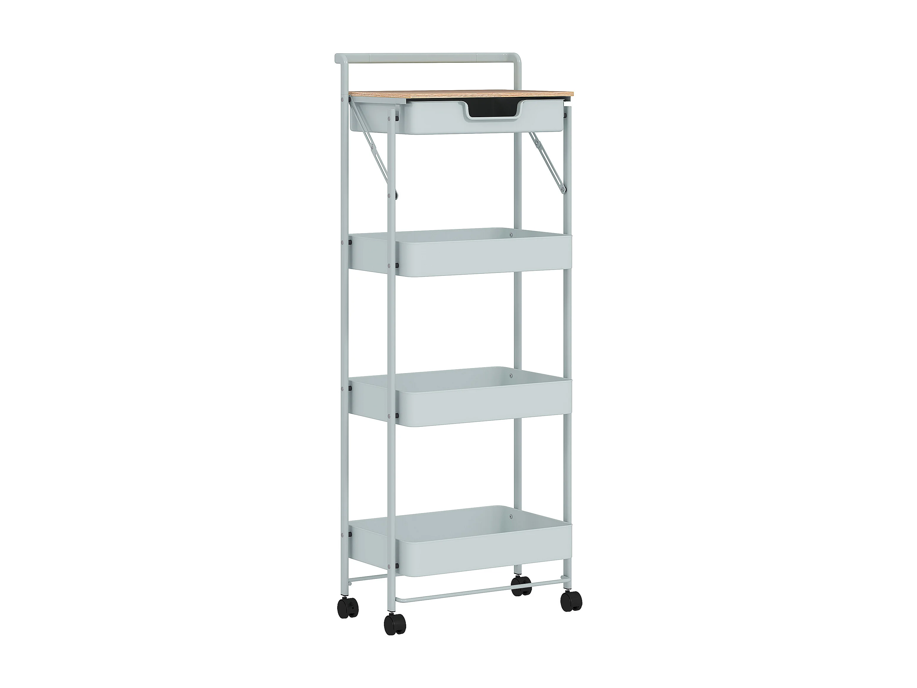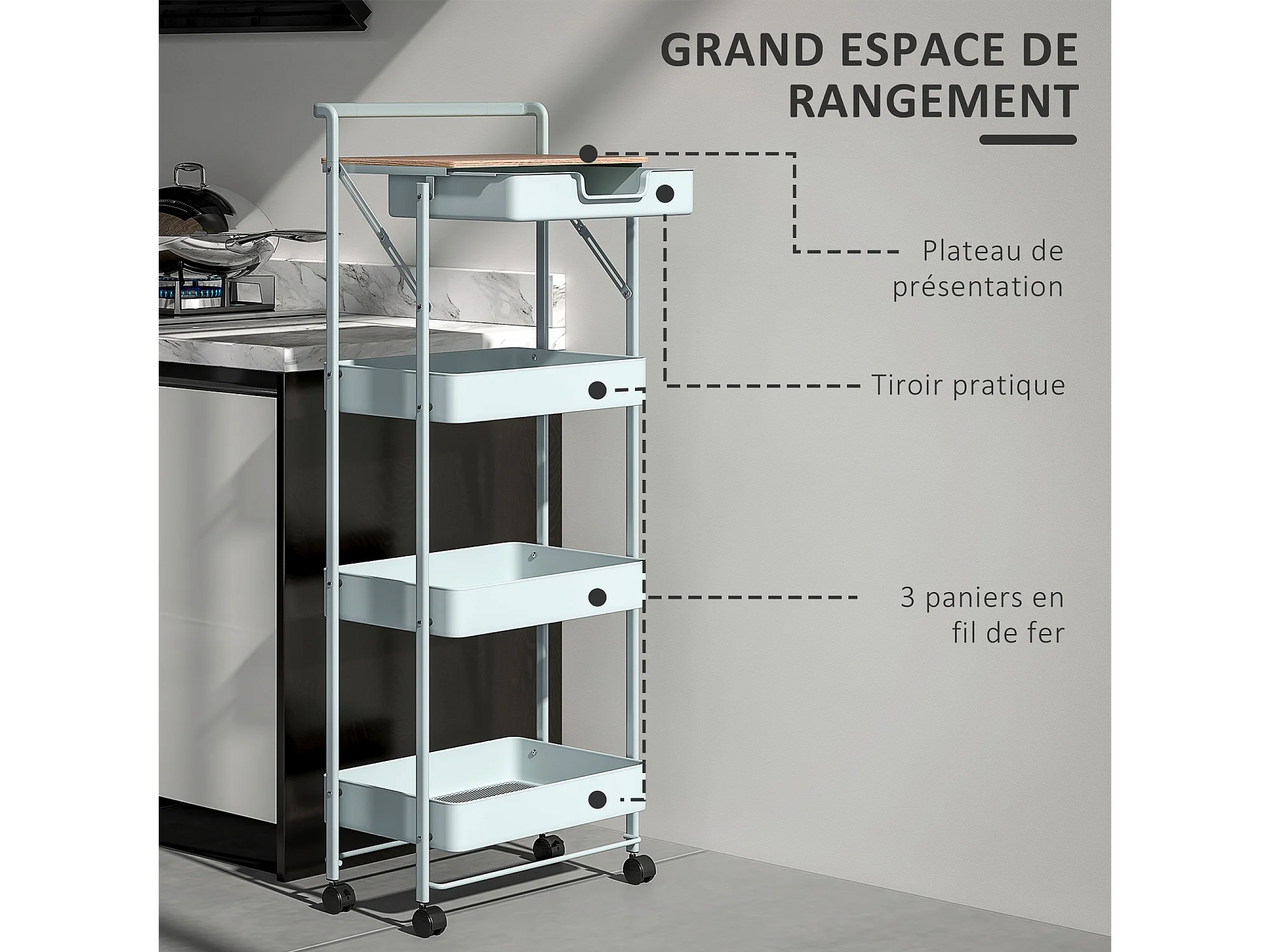Desserte chariot de rangement 3 paniers tiroir plateau - 4 roulettes, poignée - métal vert d'eau effet bois clair