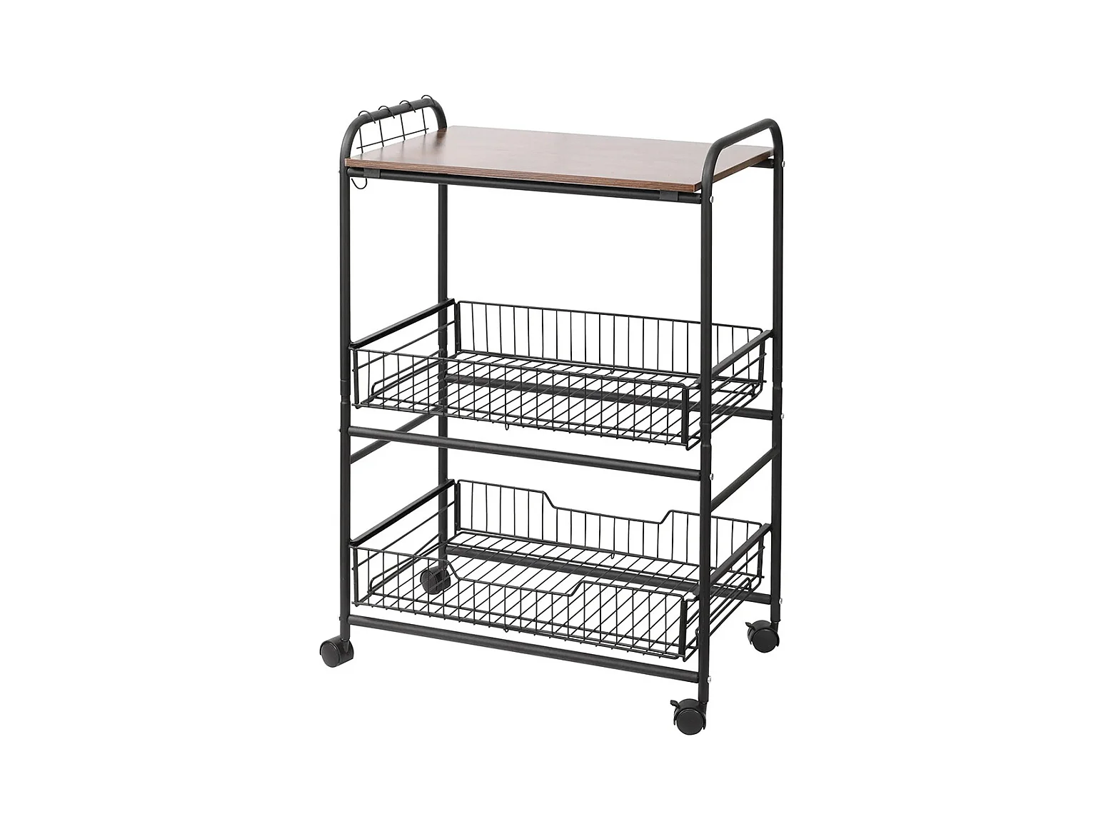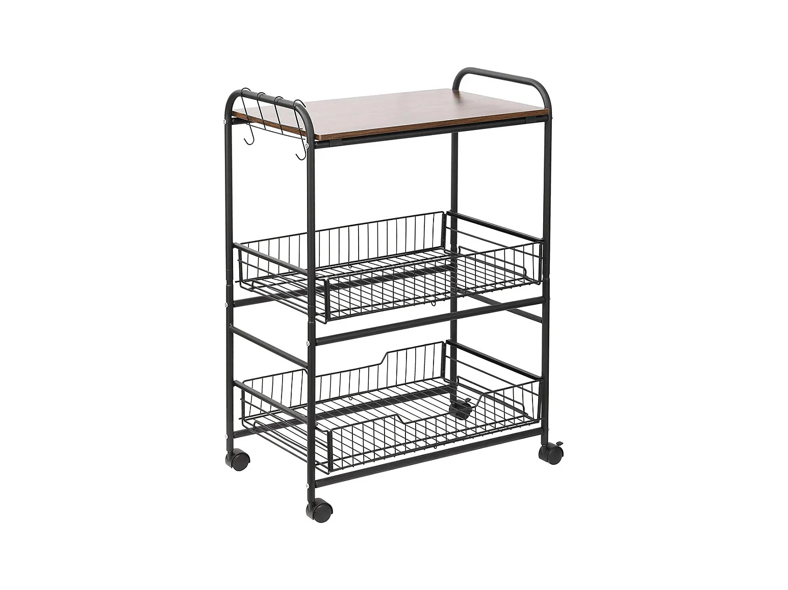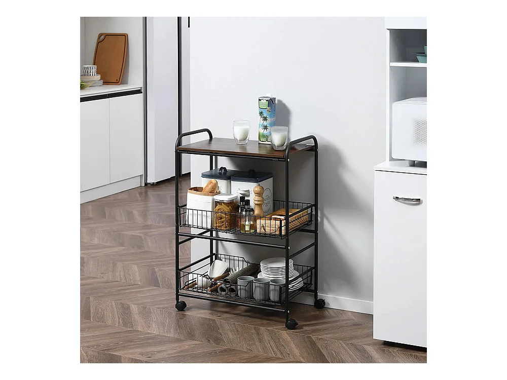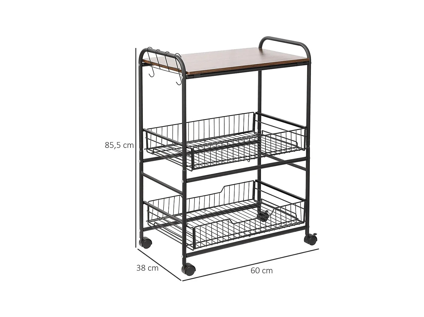 Desserte cuisine 3 niveaux, chariot de service, chariot de rangement à roulettes avec 2 paniers extractibles, étagère et crochets latéraux, 60 x 38 x 85,5 cm, noyer