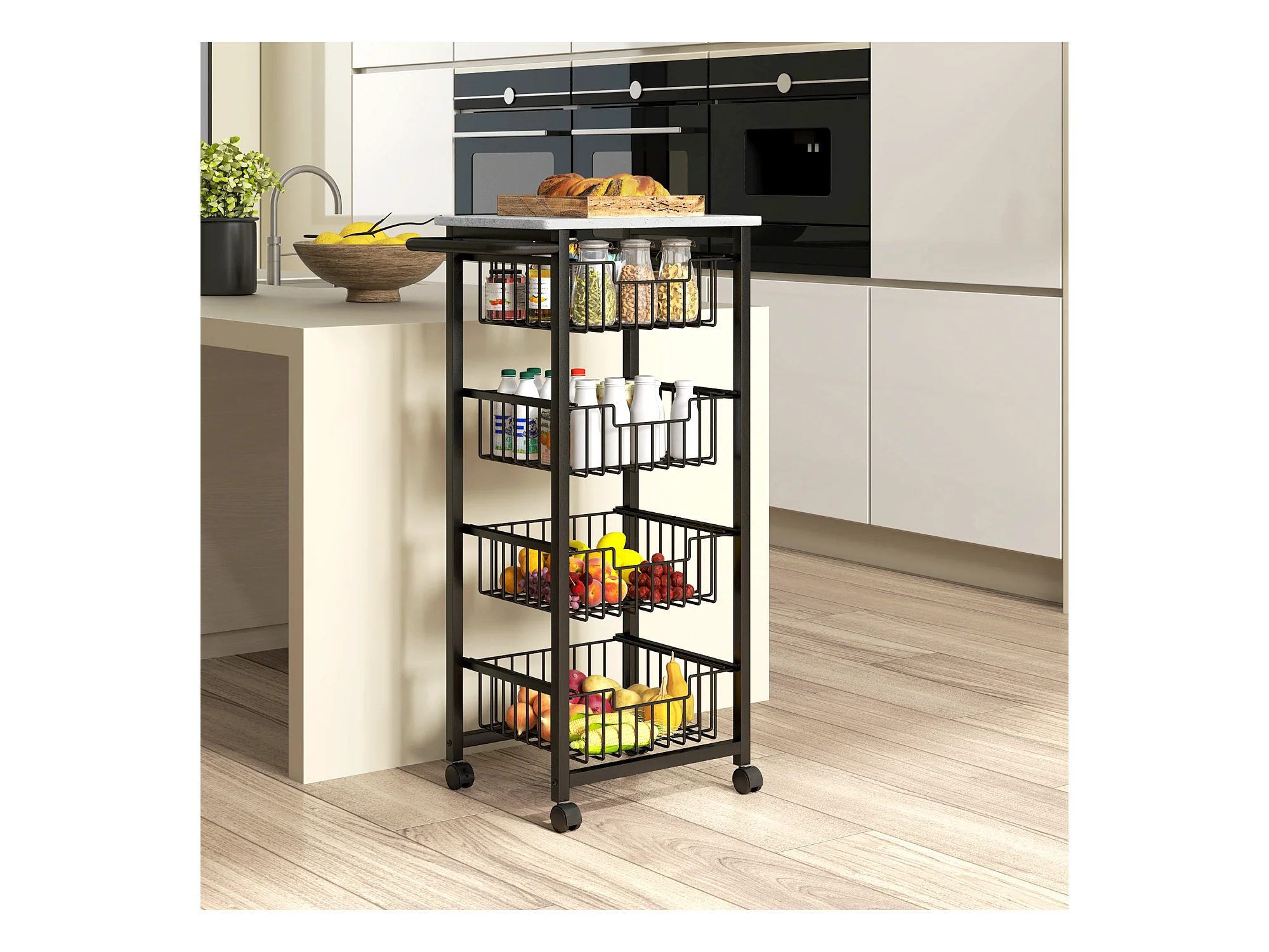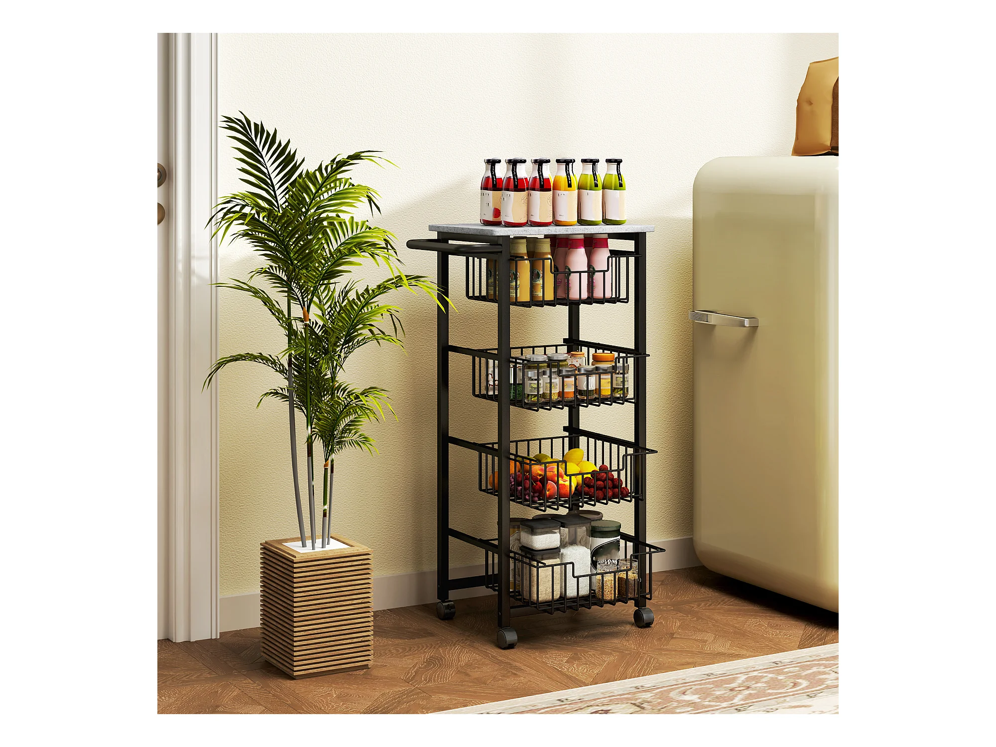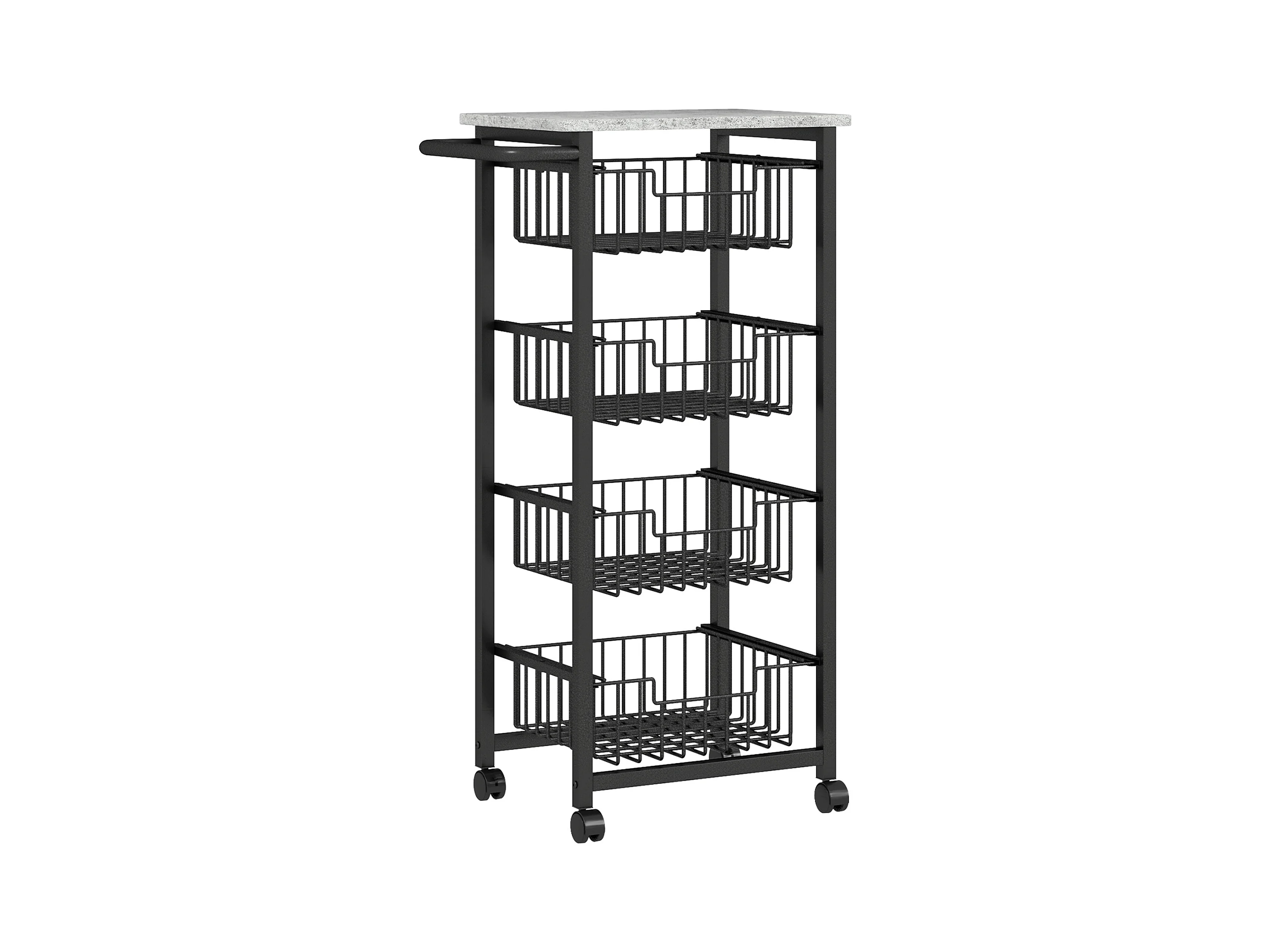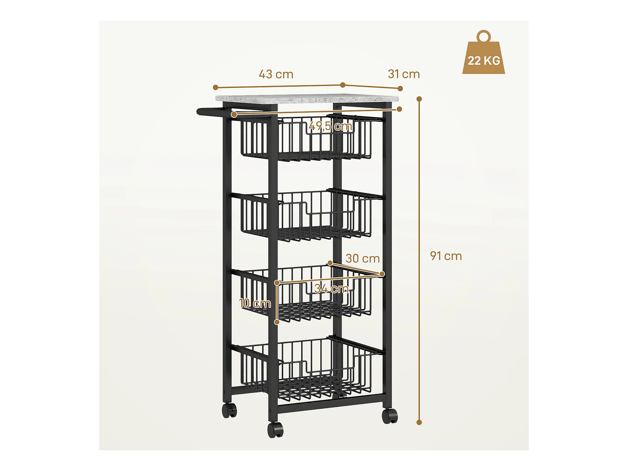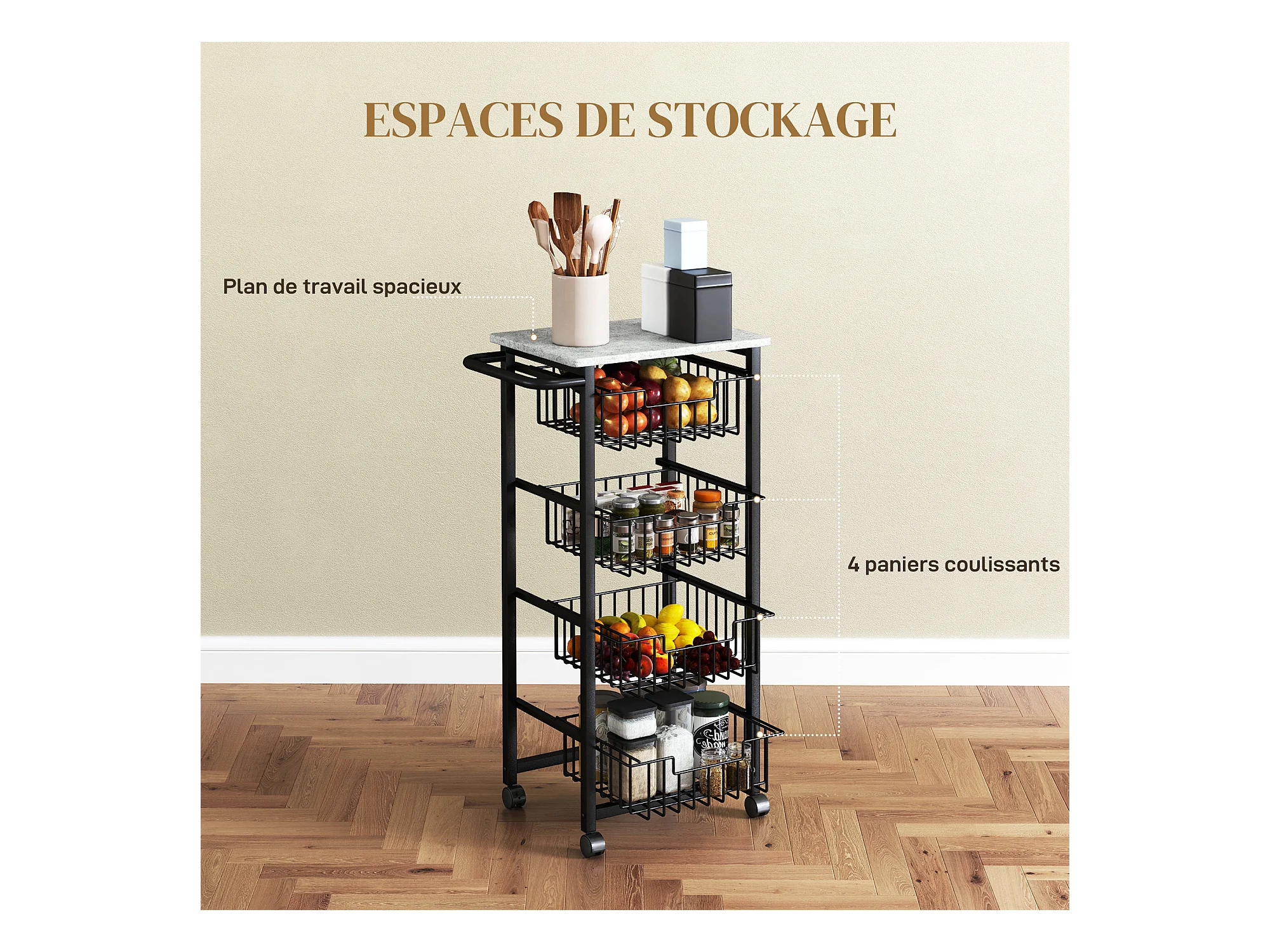 Desserte cuisine 4 paniers 4 roulettes pivotantes poignée acier noir plateau effet pierre gris clair