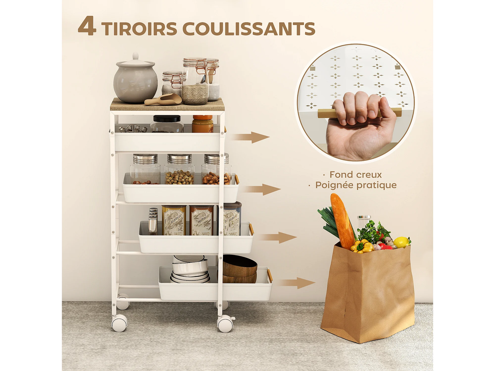 Desserte cuisine 5 niveaux 4 tiroirs coulissants métal PP blanc effet bois clair