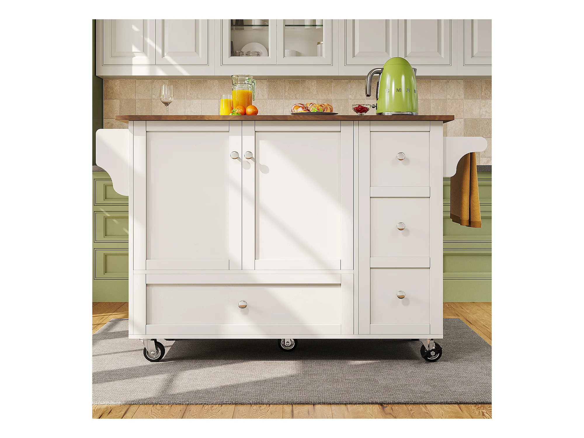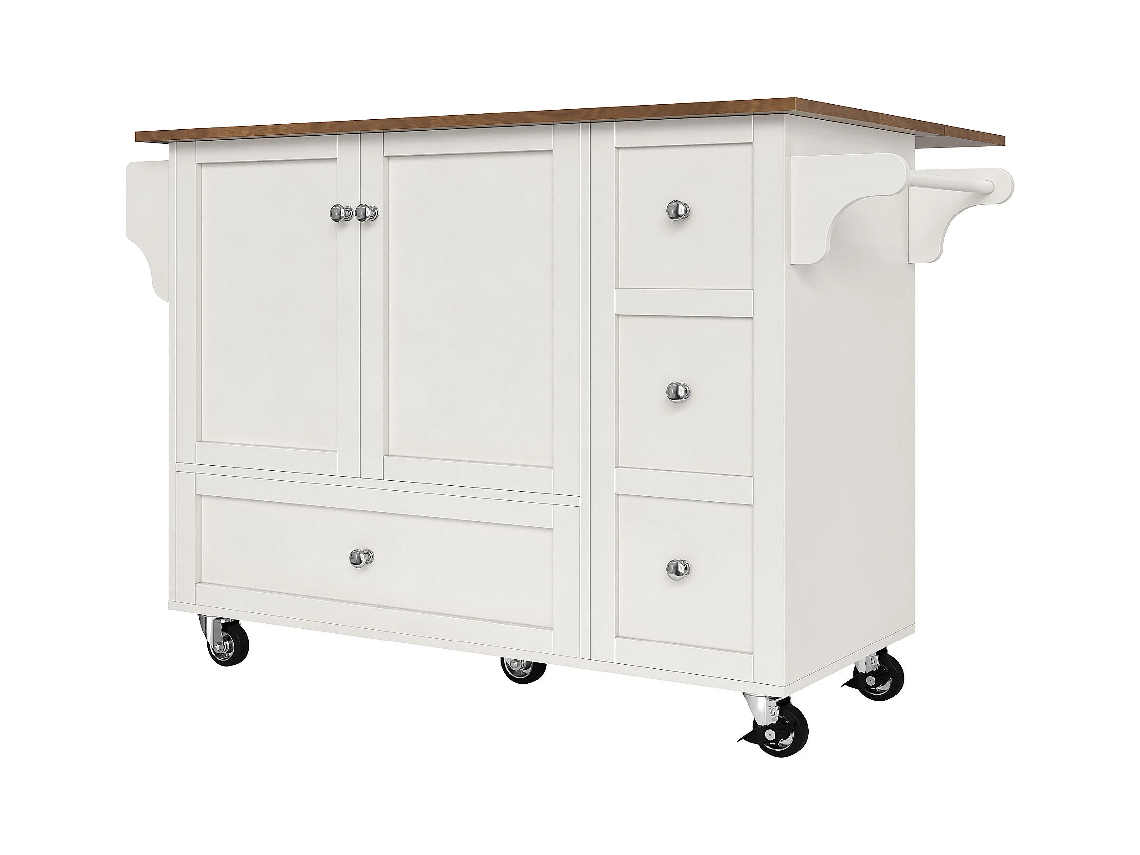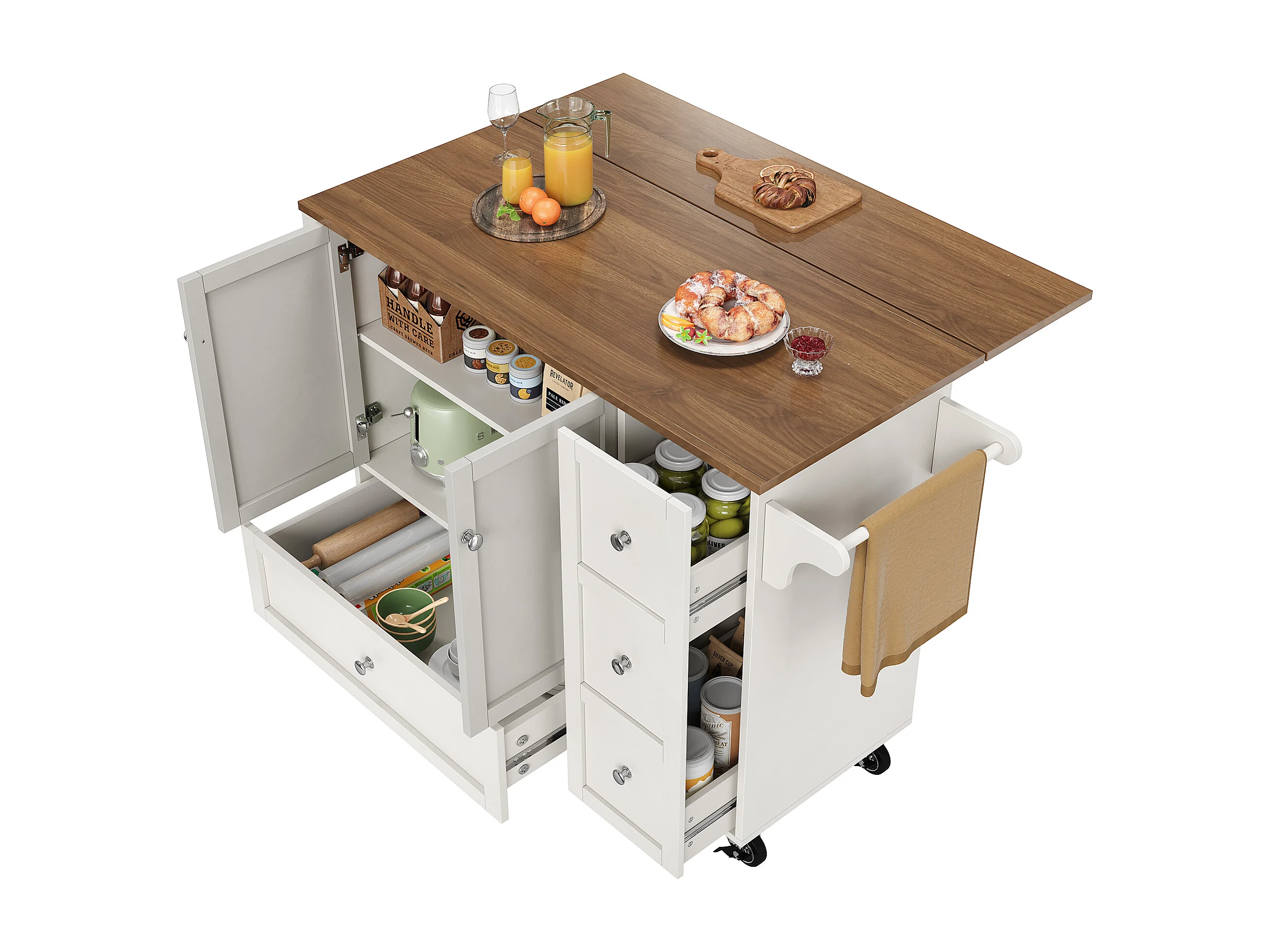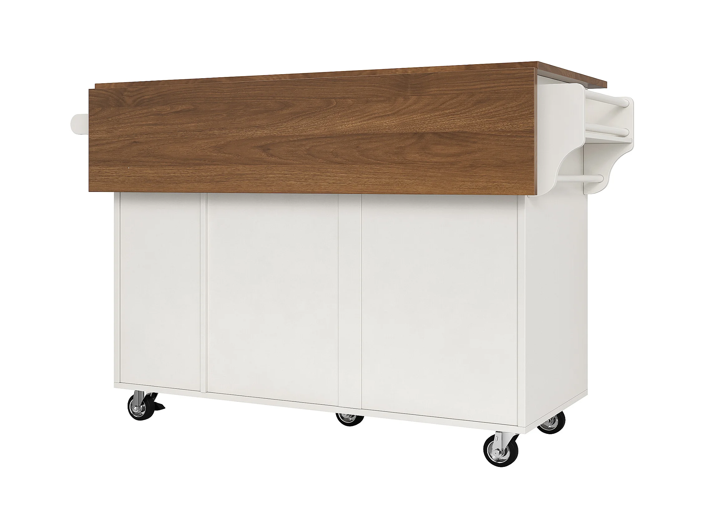 Desserte de cuisine(128×40×92,5 cm)pliante avec rangements, roulettes, étagères ajustables et plan de travail extensible