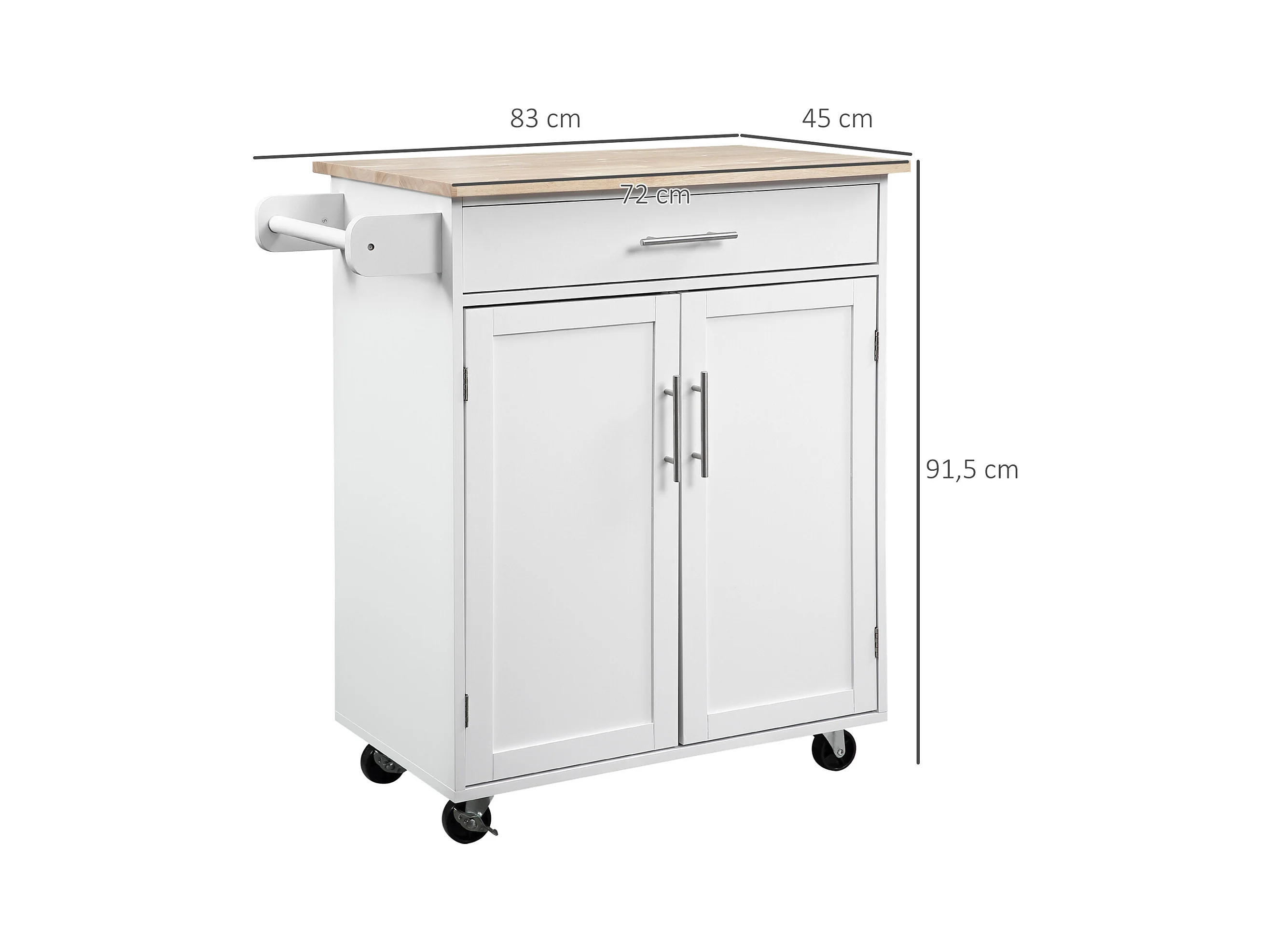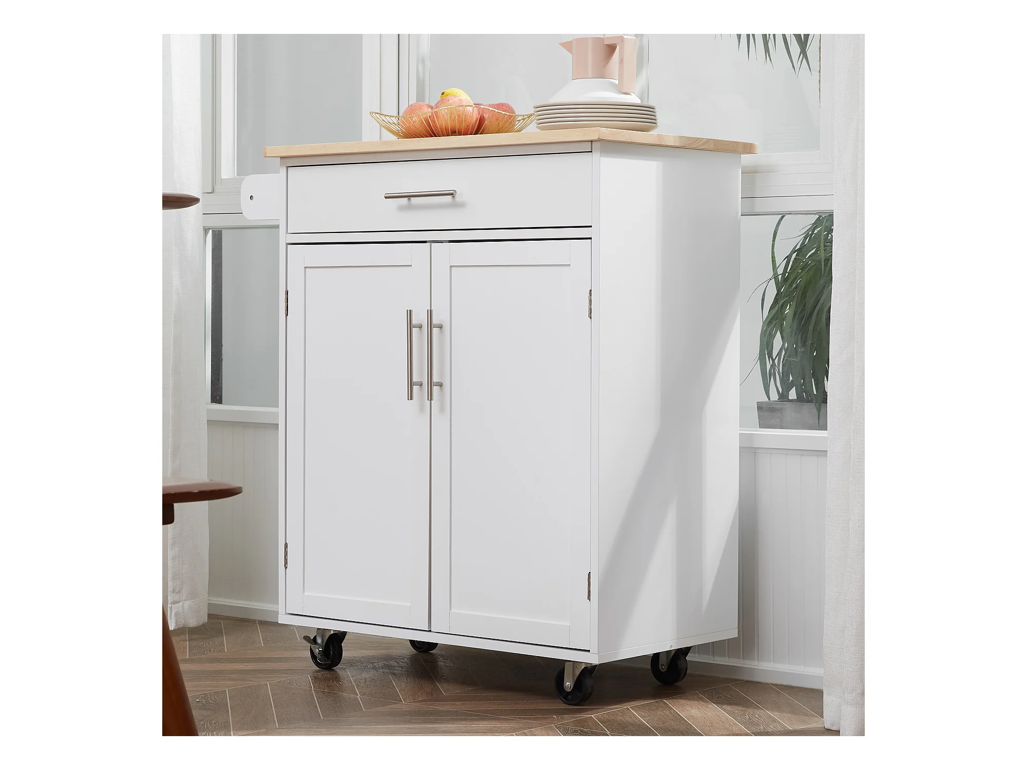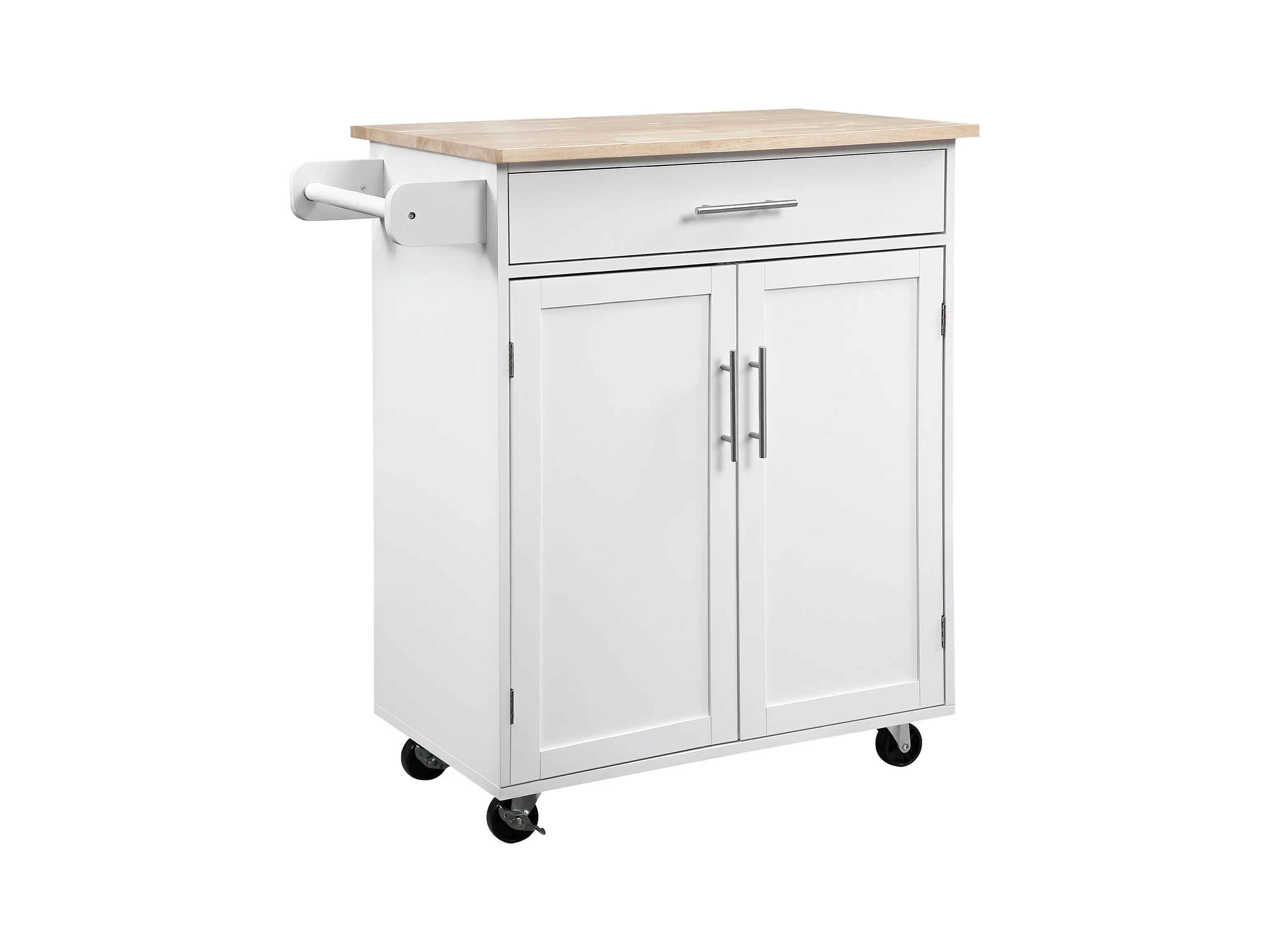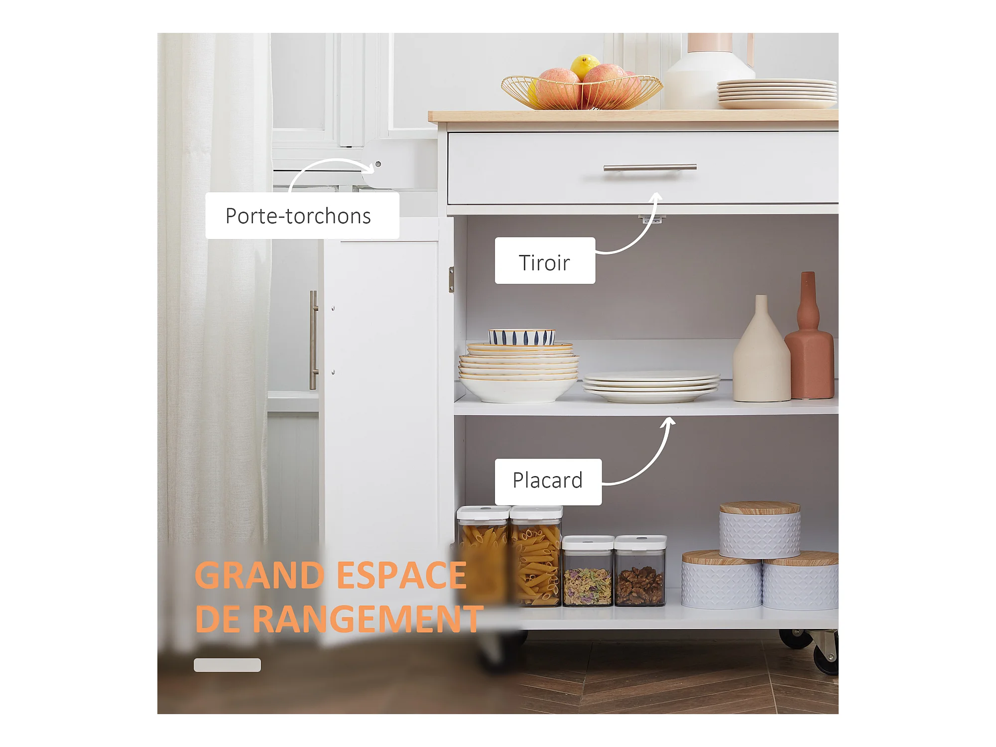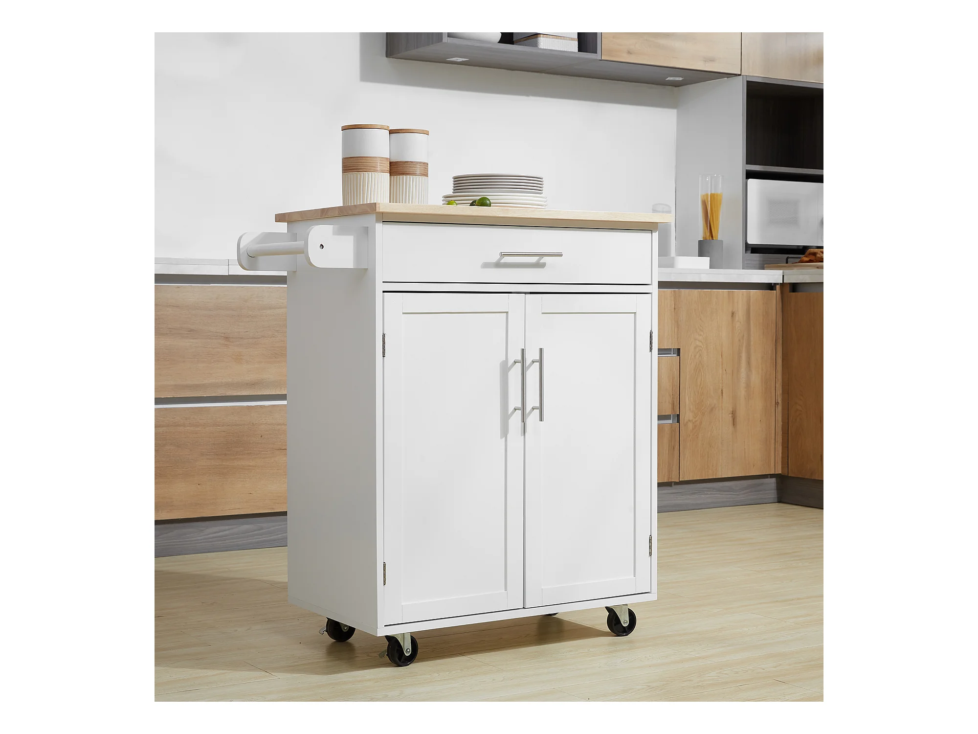 Desserte de cuisine à roulettes - tiroir, placard, porte-serviette - MDF blanc plateau bois hévéa