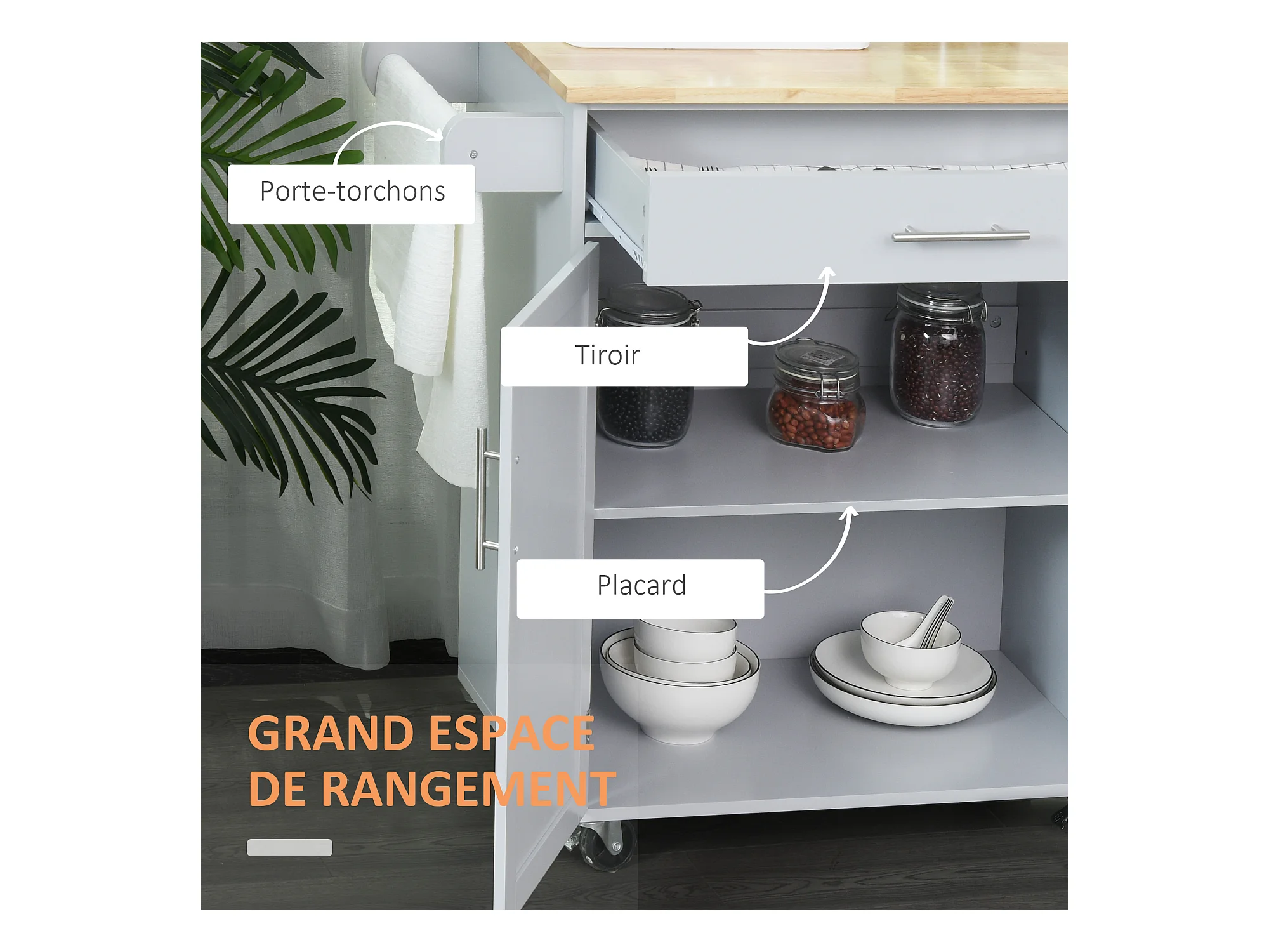 Chariot de service desserte de cuisine à roulettes 2 étagères + plateau amovible + tiroir bois de pin MDF gris chêne clair
