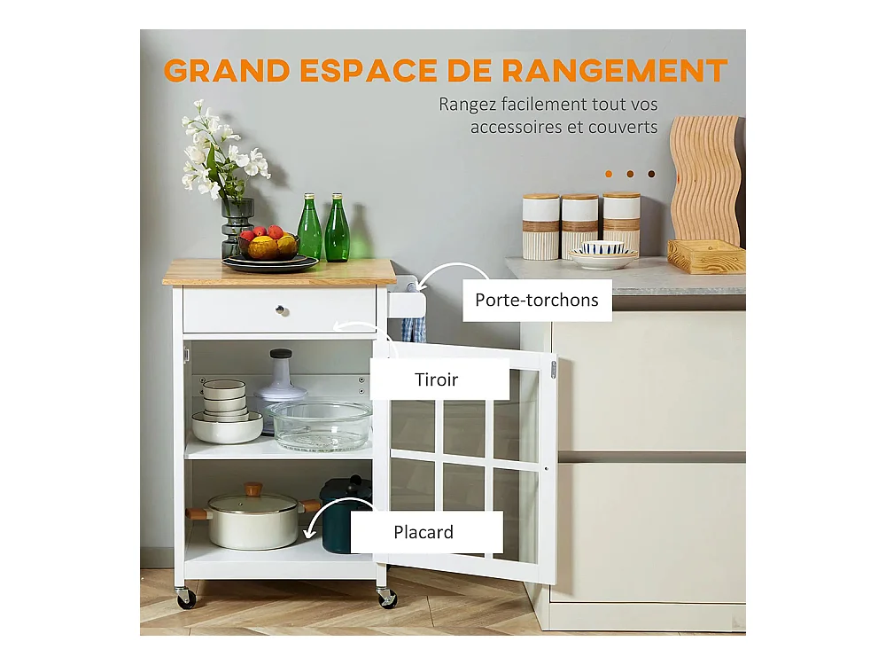 Desserte de cuisine à roulettes multi-rangement - placard porte vitrée avec étagère réglable, tiroir, porte-torchon - blanc aspect chêne clair