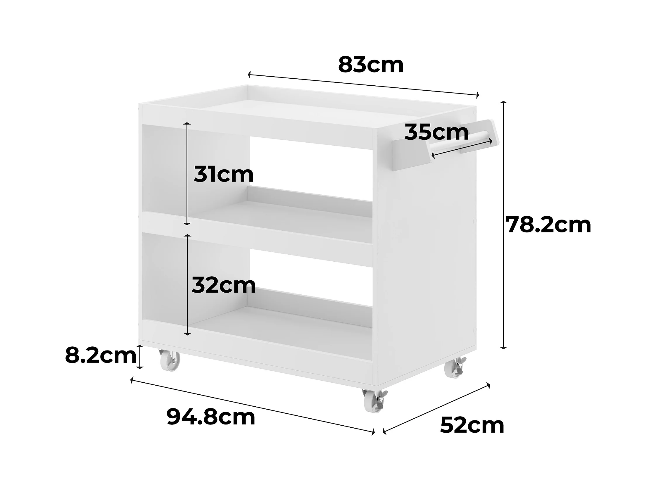 Desserte de cuisine à roulettes avec 3 tiroirs, 3 étagères, plateau bois, MDF blanc (67x37x84cm)