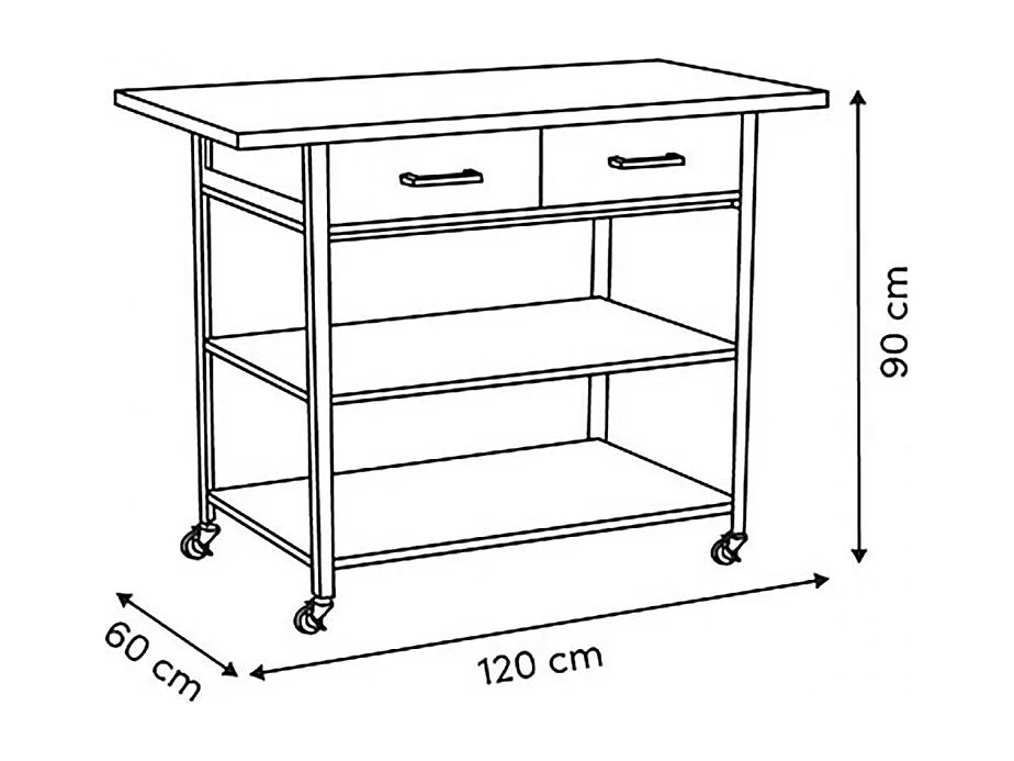 Desserte de cuisine avec roulettes, deux tiroirs et deux étagères, coloris marron/blanc - Longueur 90 x Profondeur 60 x Hauteur 120 cm
