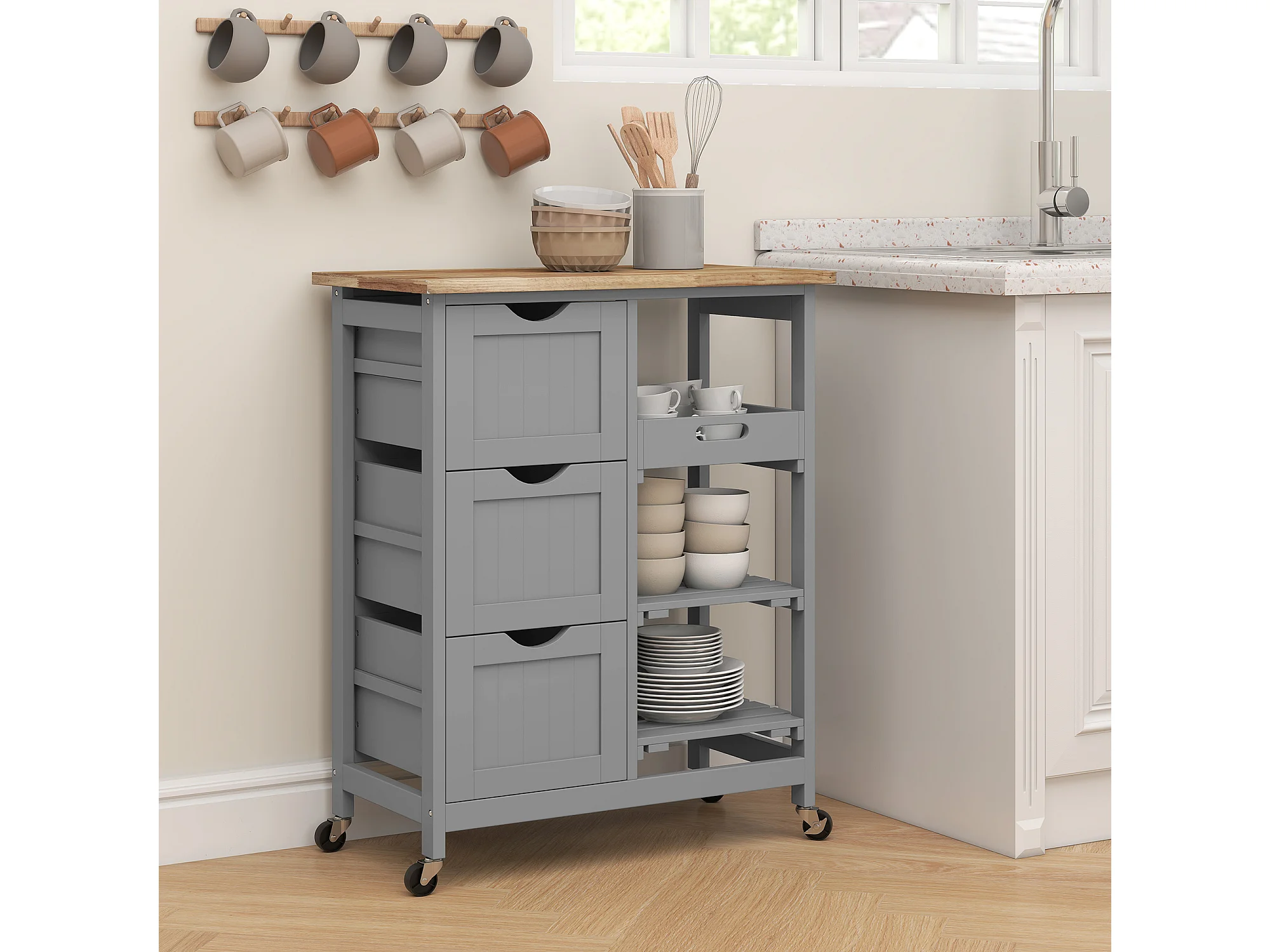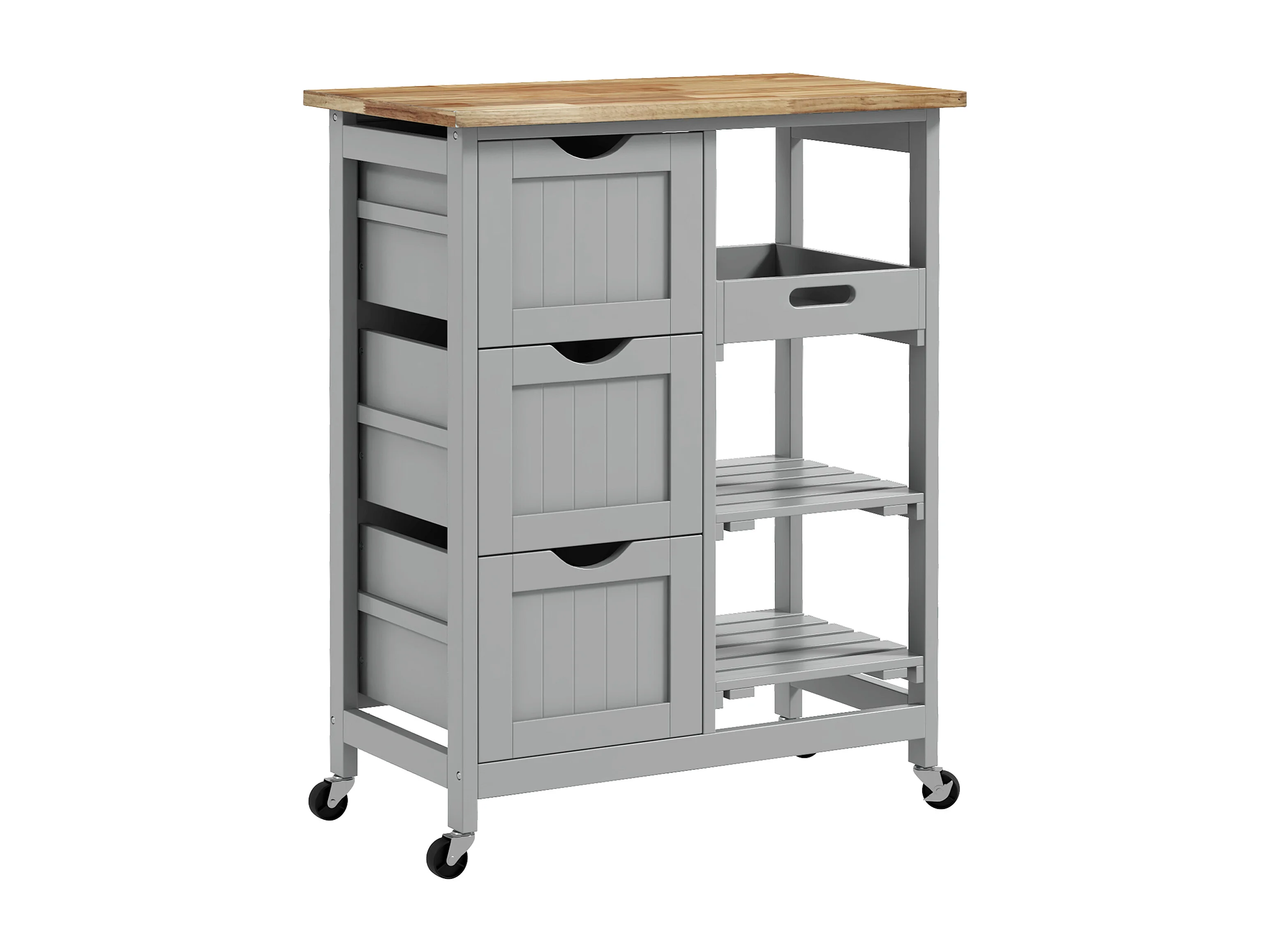 Desserte de cuisine multi-rangement - 3 tiroirs, 2 étagères, plateau amovible - bois hévéa MDF gris