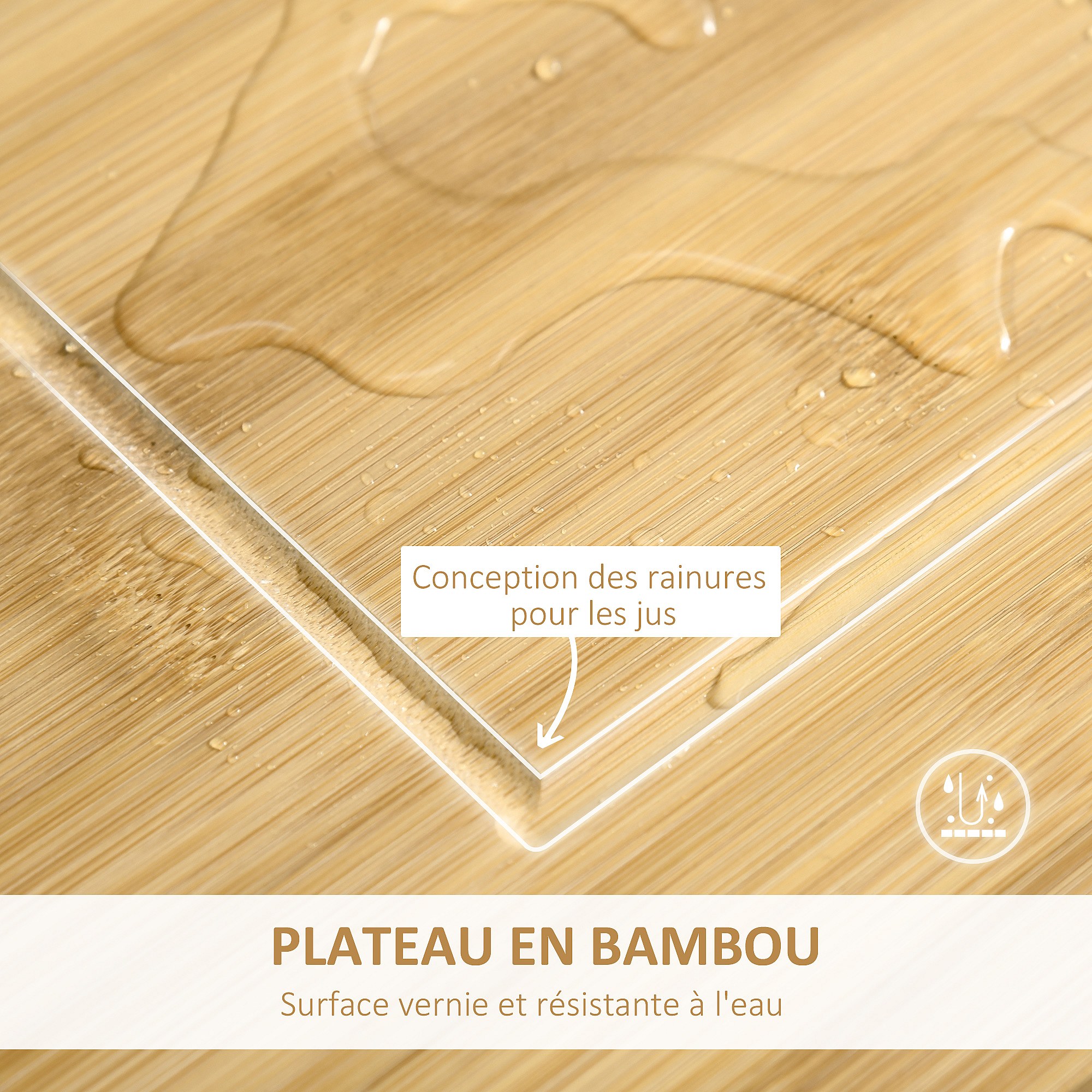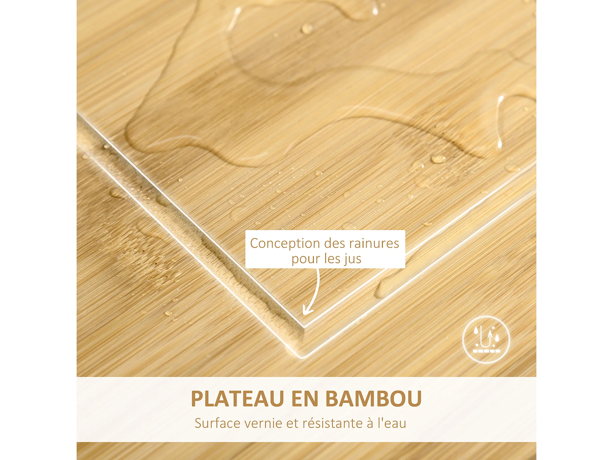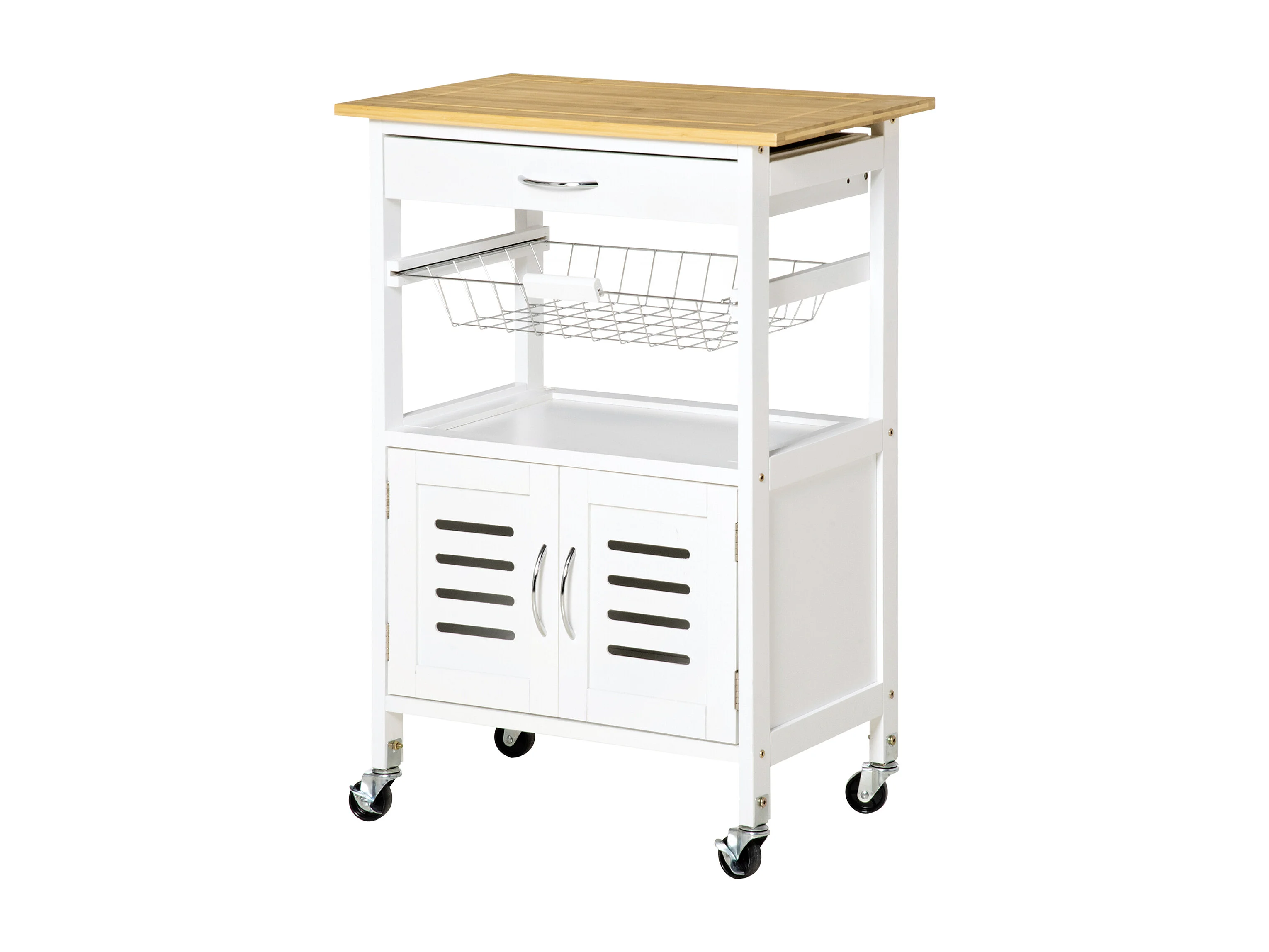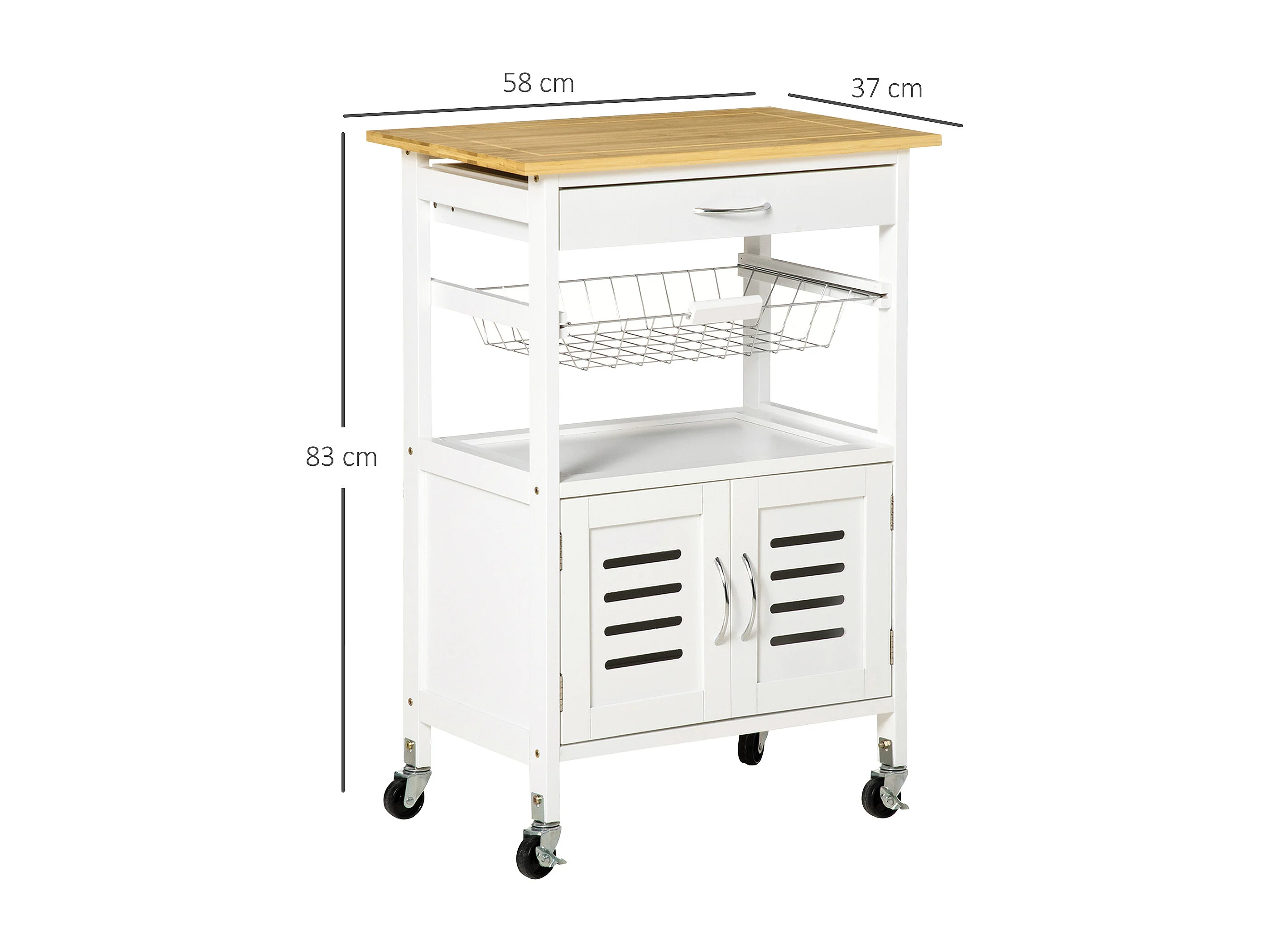 Desserte de cuisine multi-rangement - dim. 58L x 37l x 83H cm - 2 portes, étagère, panier, tiroir - poignées métal MDF blanc plateau bois bambou verni