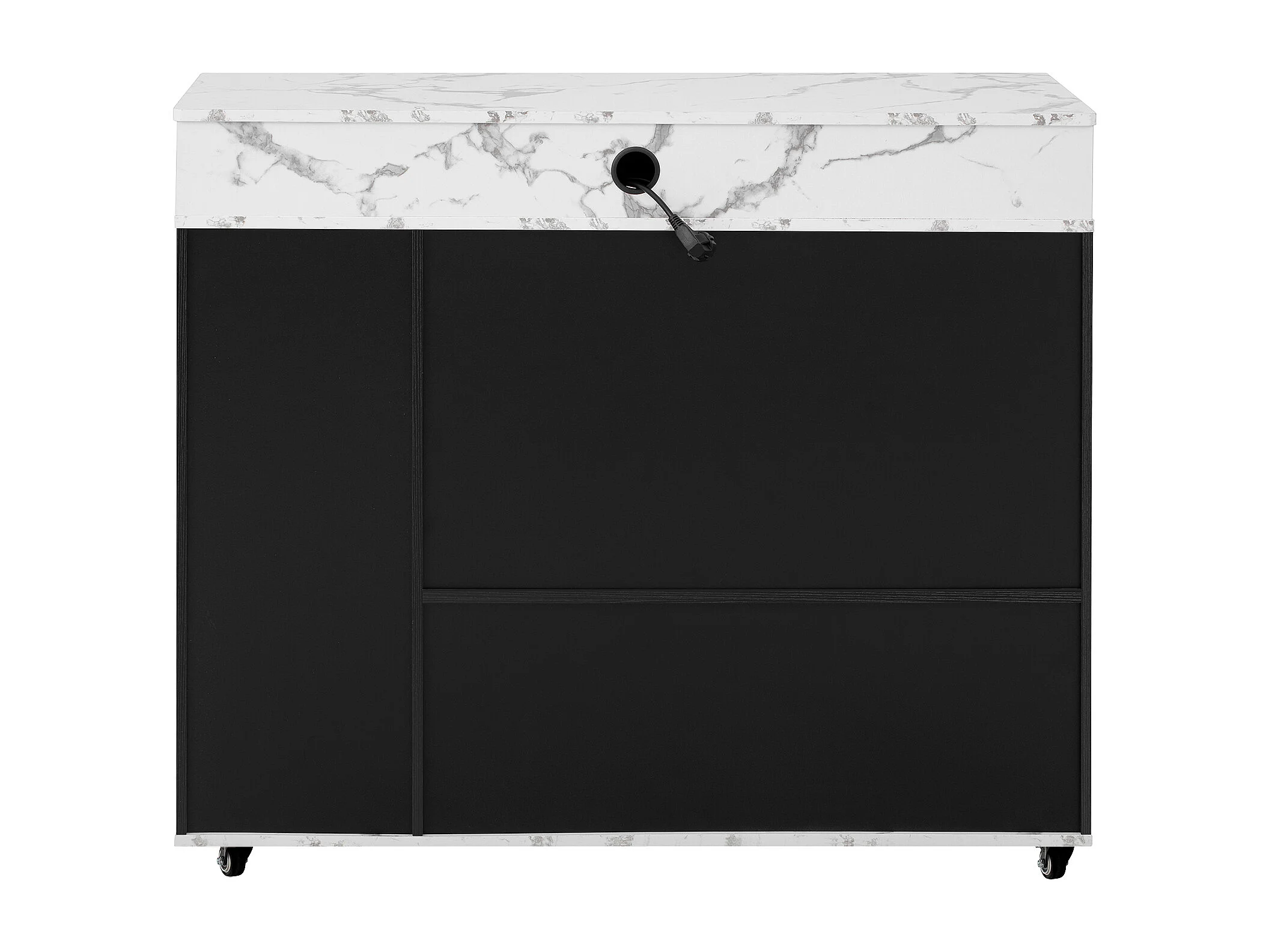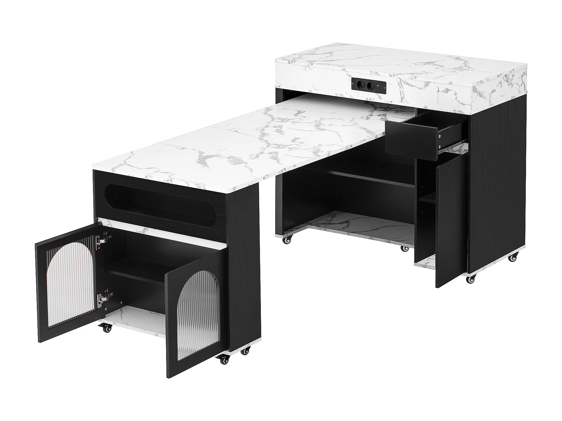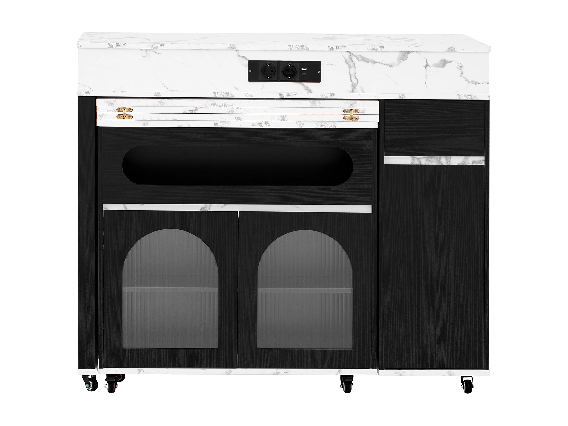 Desserte de cuisine noir avec prises et portes vitrées - Plateau effet marbre