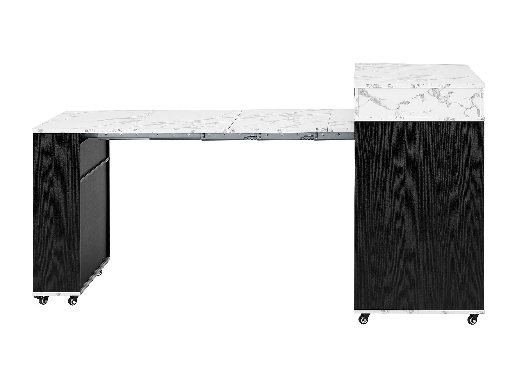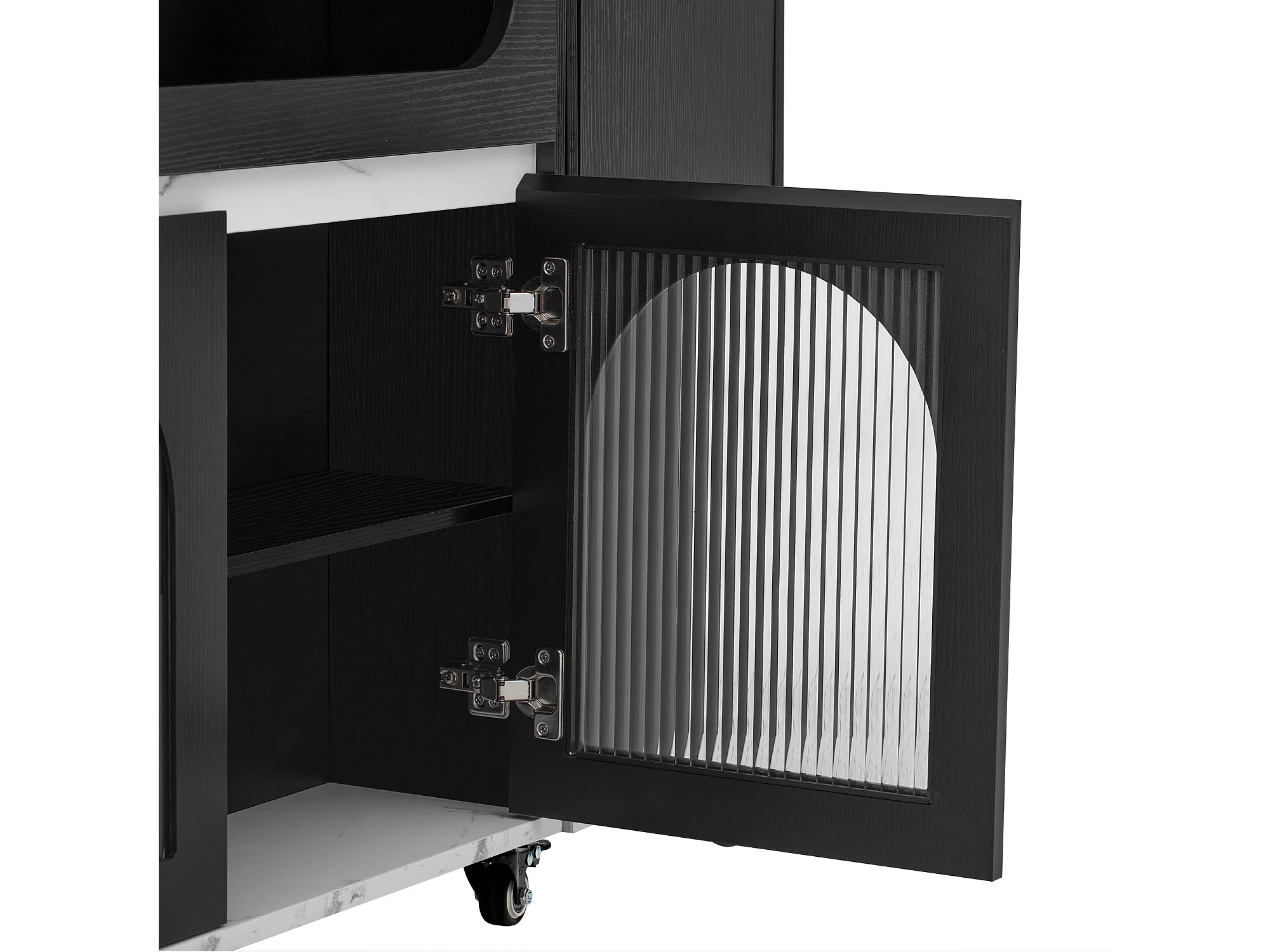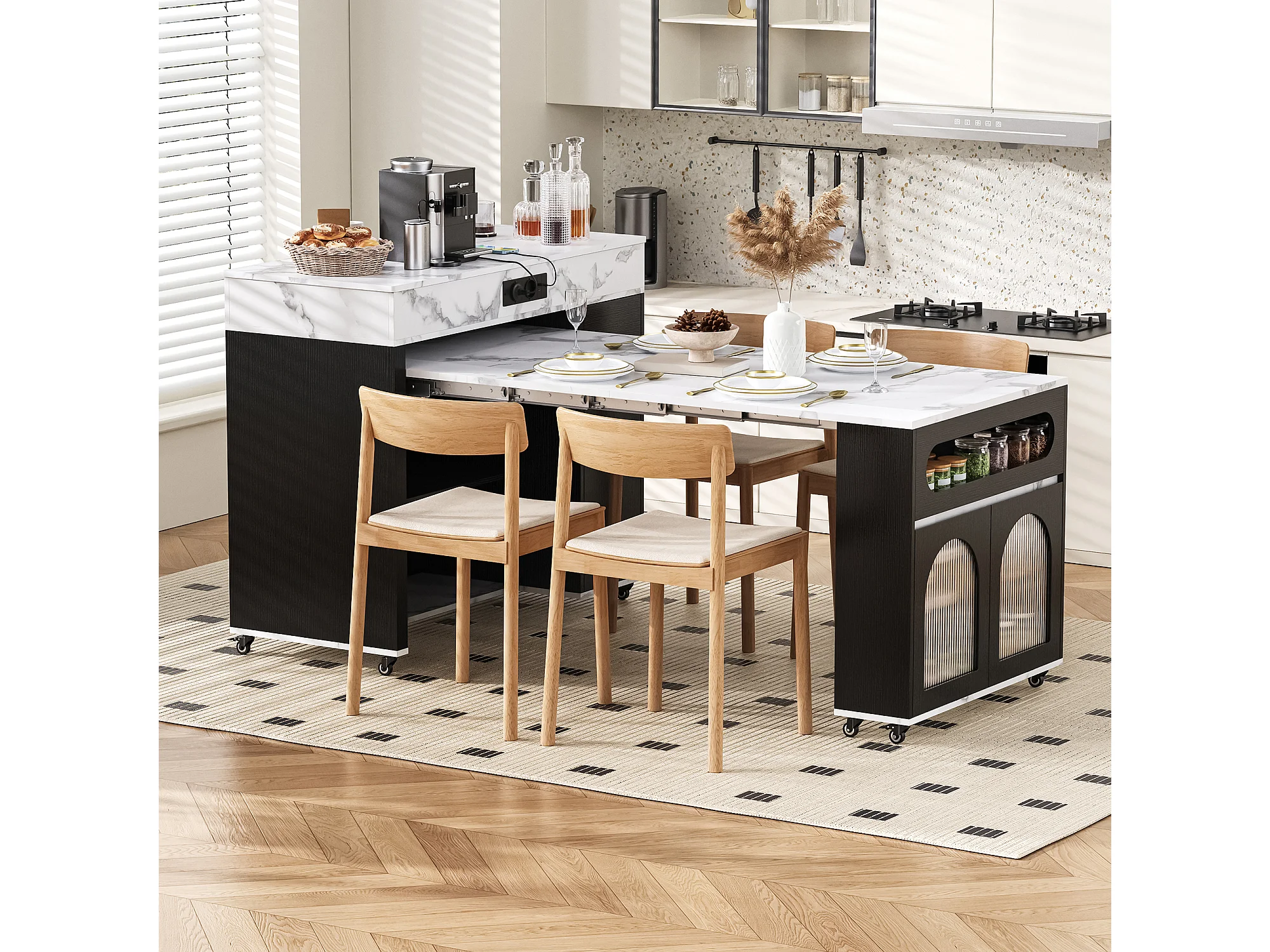 Desserte de cuisine noir avec prises et portes vitrées - Plateau effet marbre