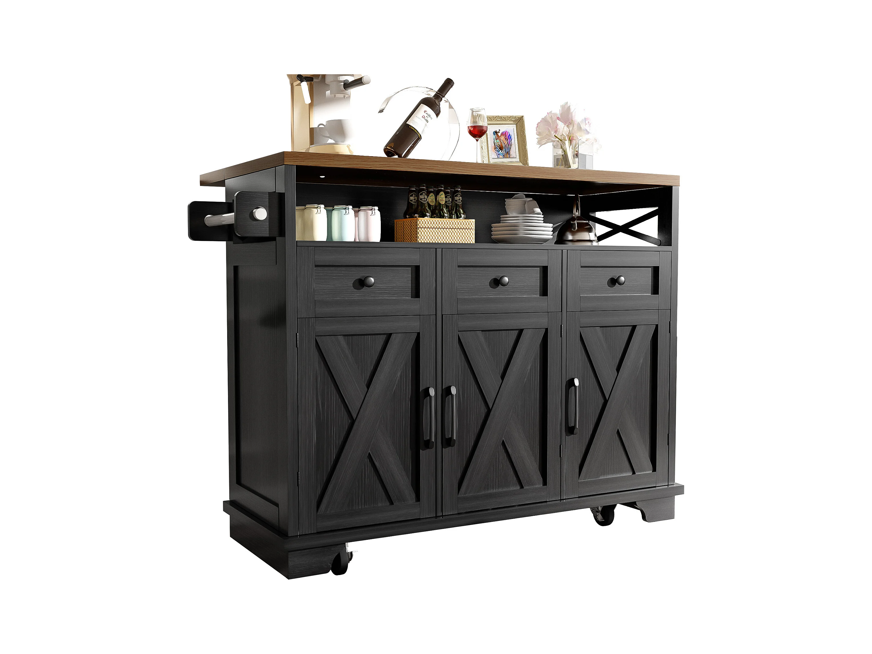 Desserte de cuisine noire (118×43×98 cm), avec roulettes, plateau bois, rangements modulables et porte-serviette