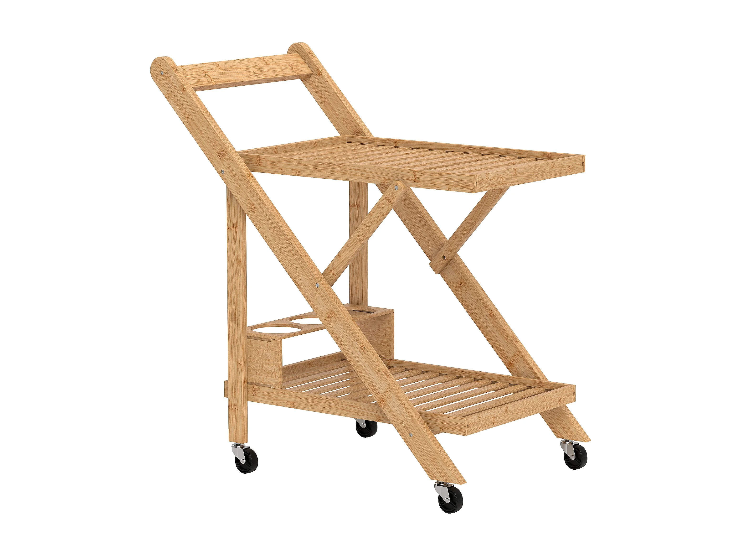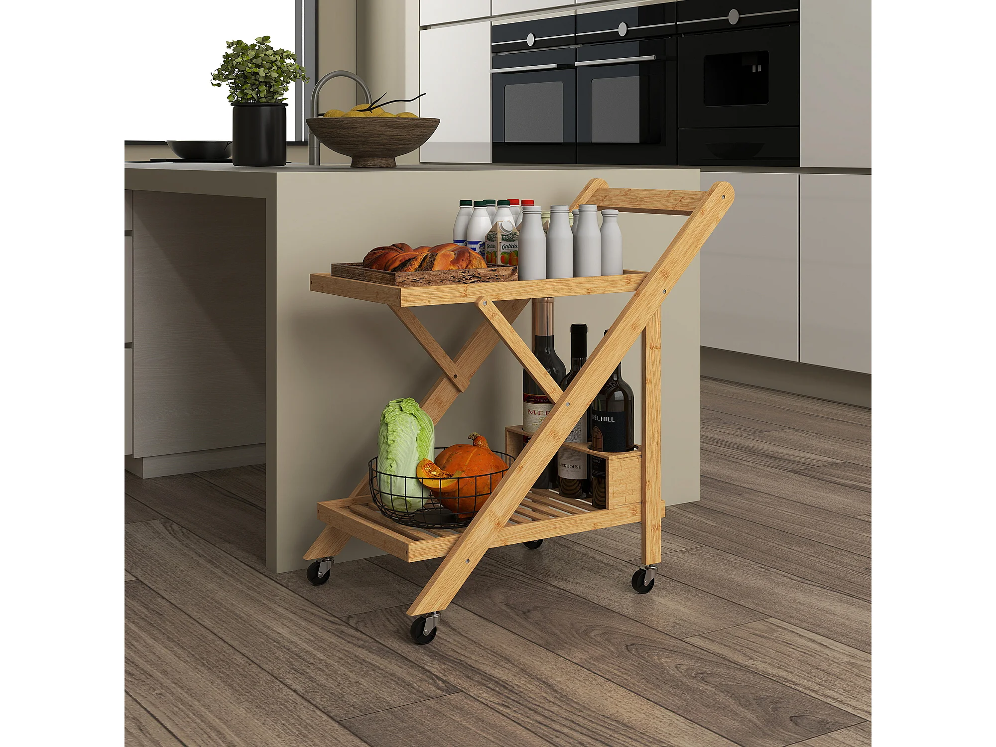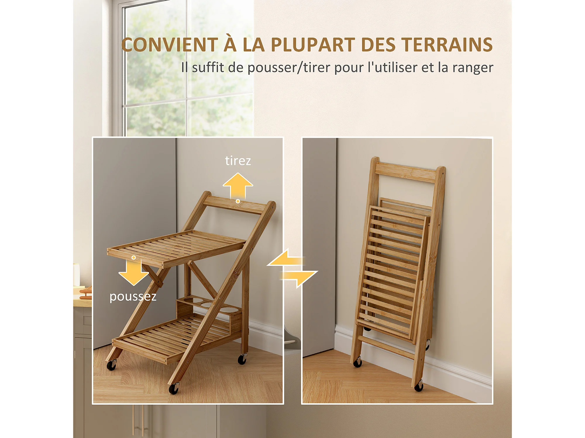 Desserte de cuisine pliable en bambou 2 plateaux, 4 roues, 3 casiers à vin