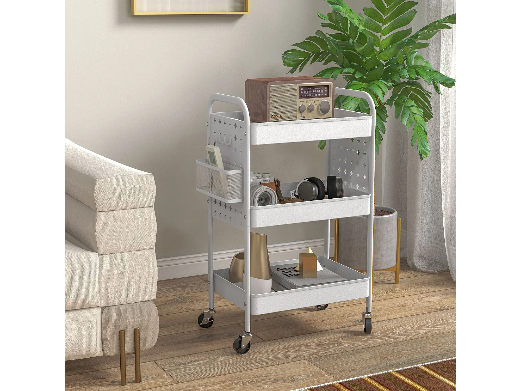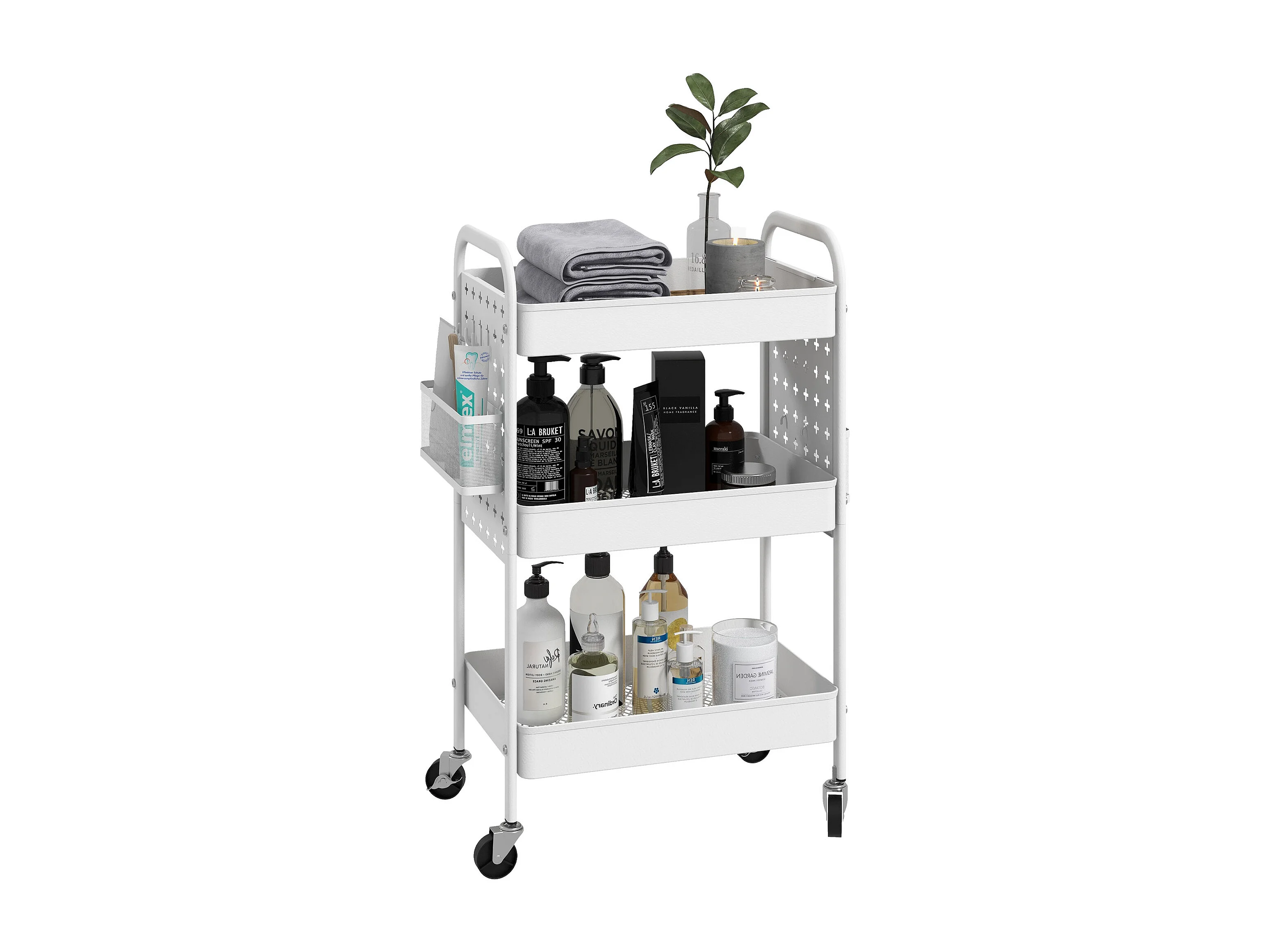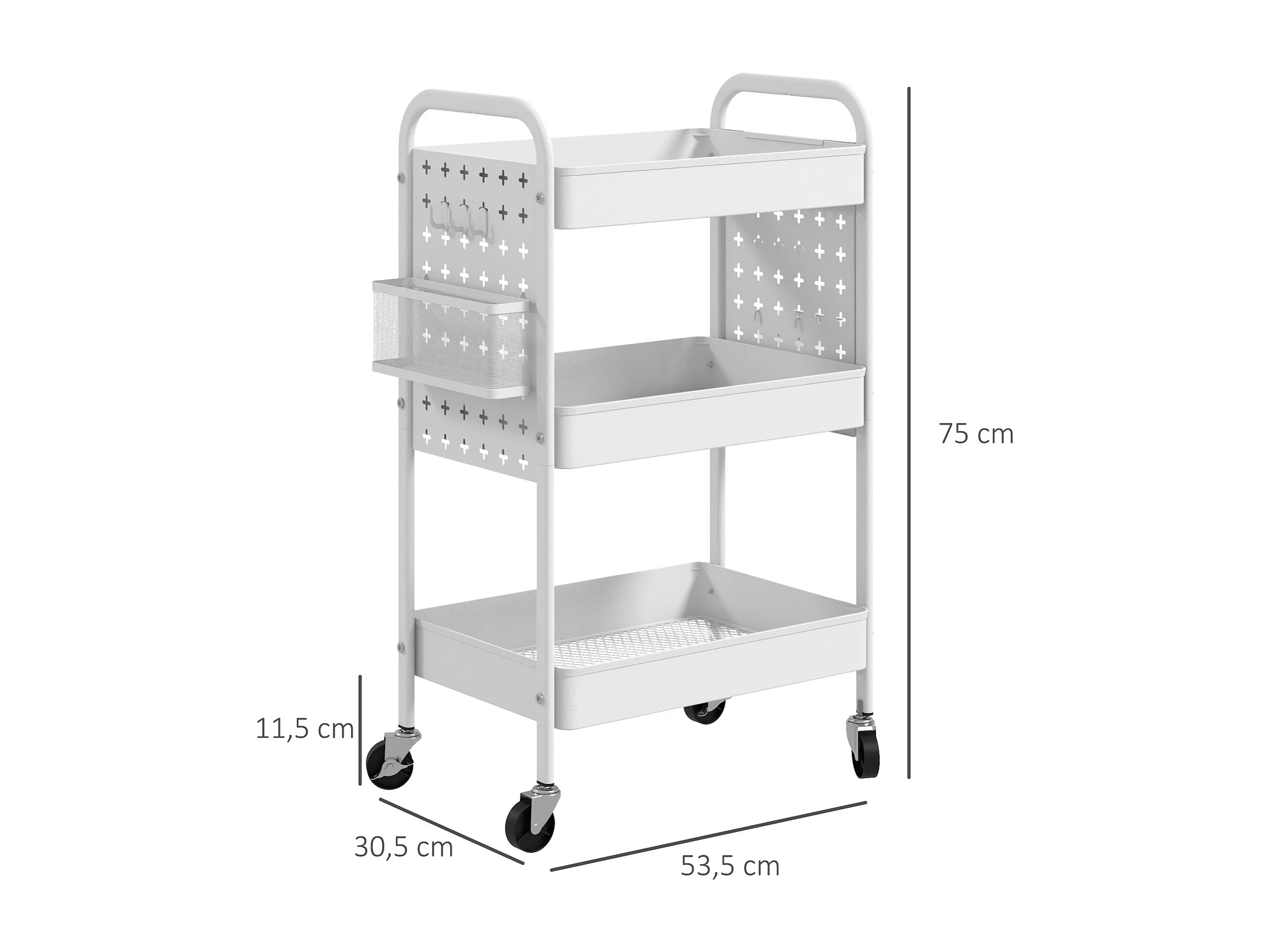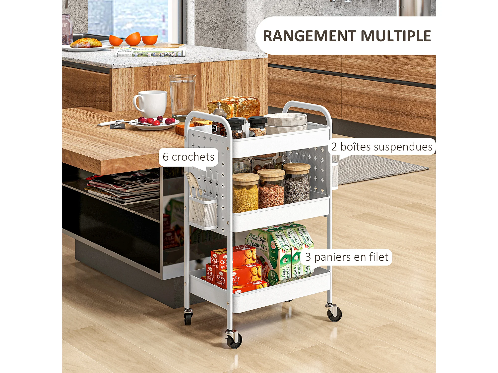 Desserte de cuisine style néo-rétro - 3 étagères, 2 paniers, 6 crochets - acier blanc
