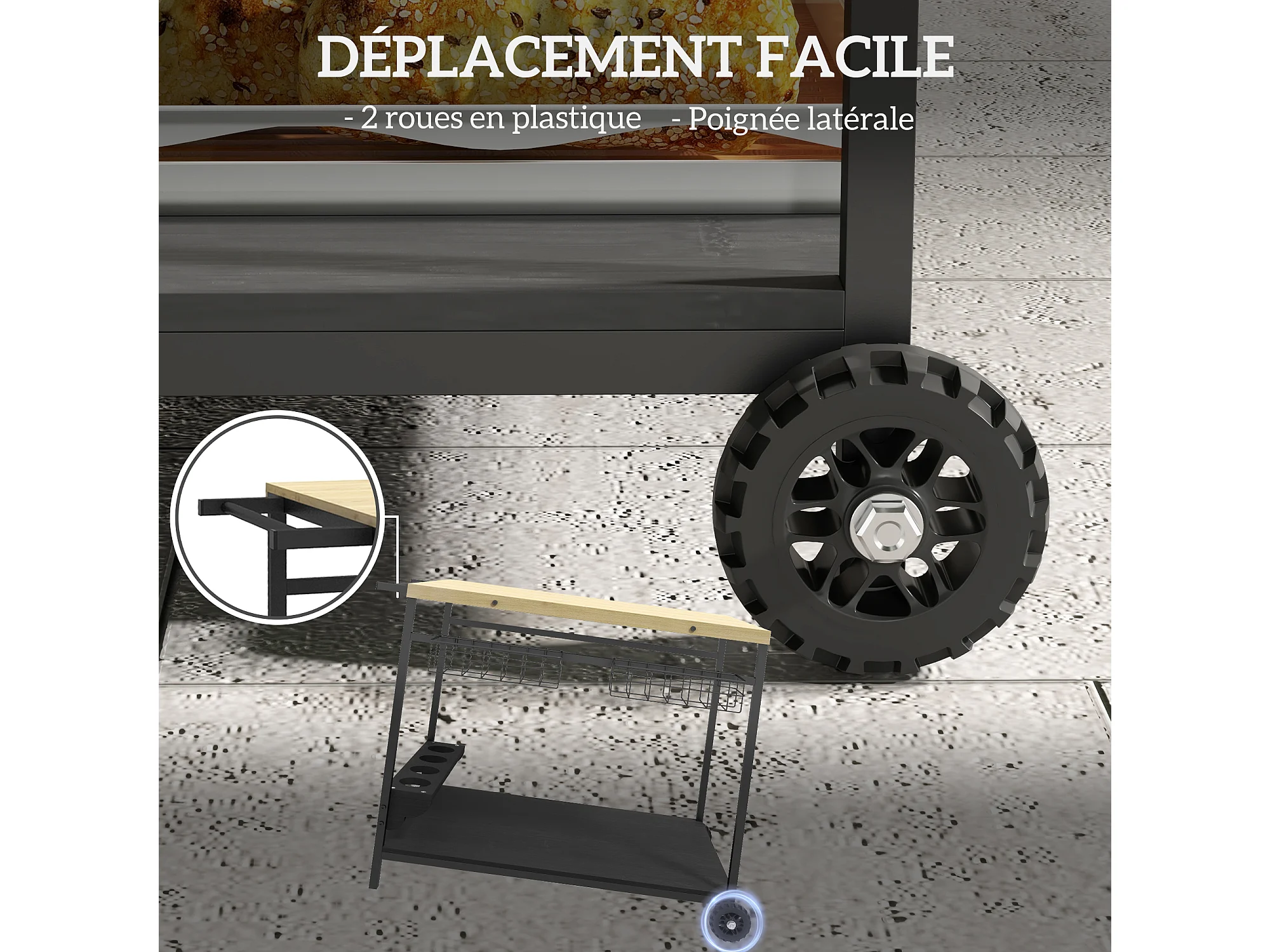 Desserte de jardin chariot pour plancha barbecue en bois et métal avec poignée 2 plateaux 2 paniers et porte-bouteilles