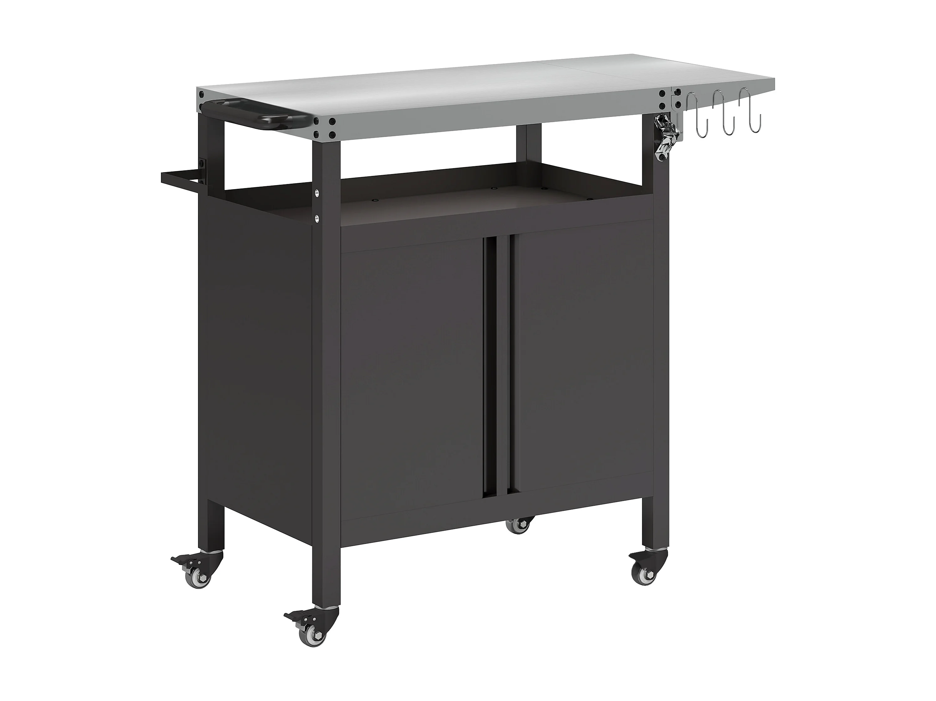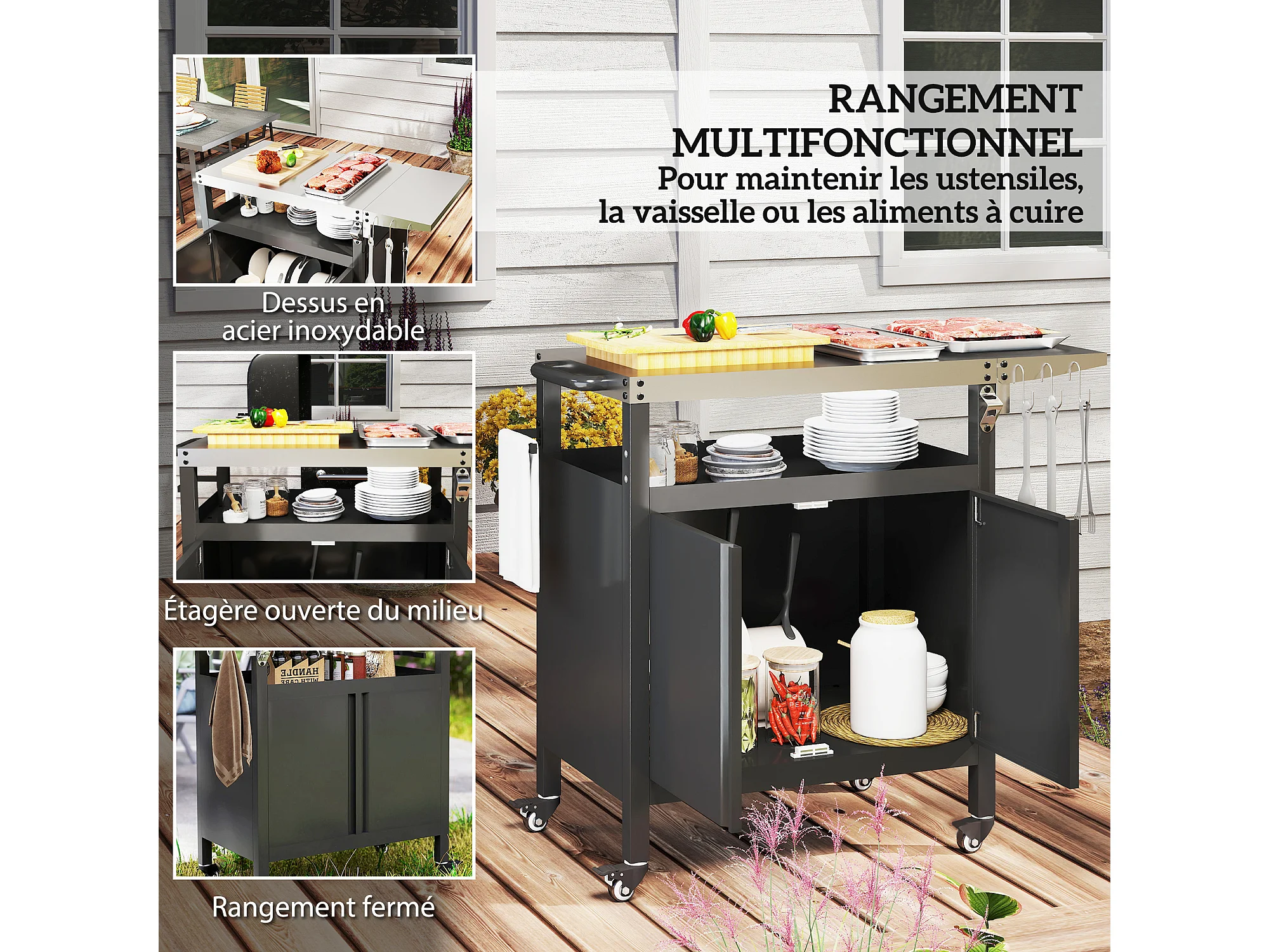 Desserte de jardin desserte plancha barbecue - 2 portes, tablette pliable, 3 crochets - acier noir acier inox
