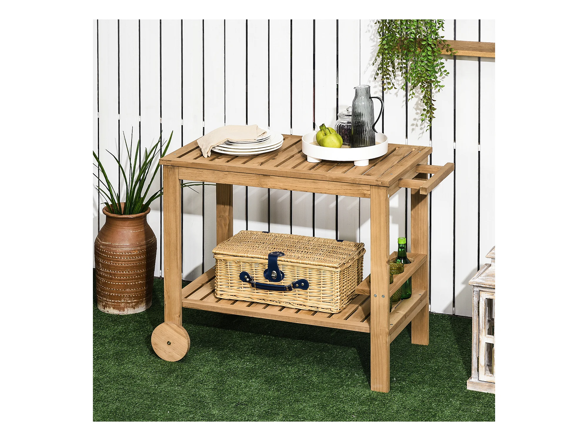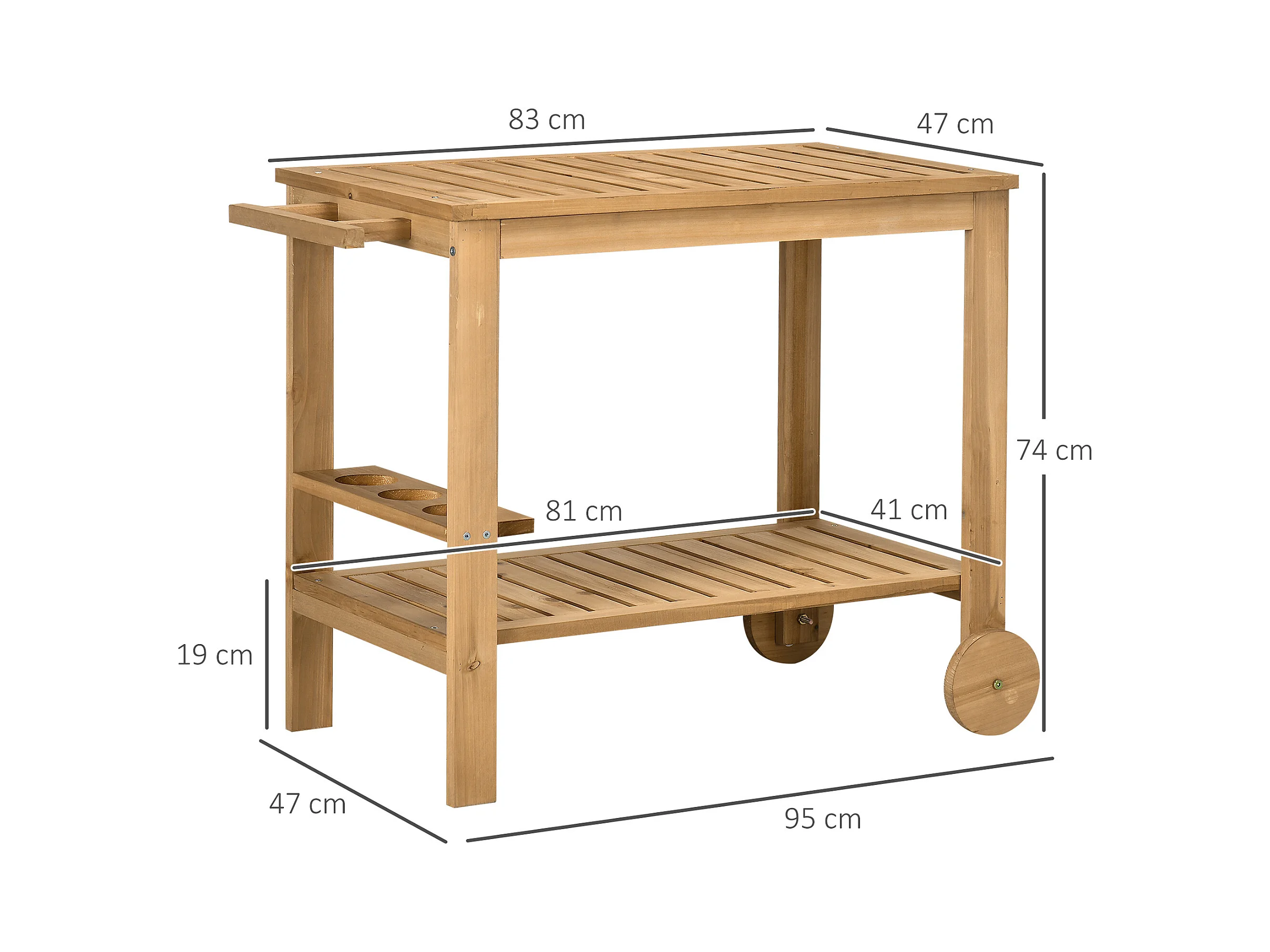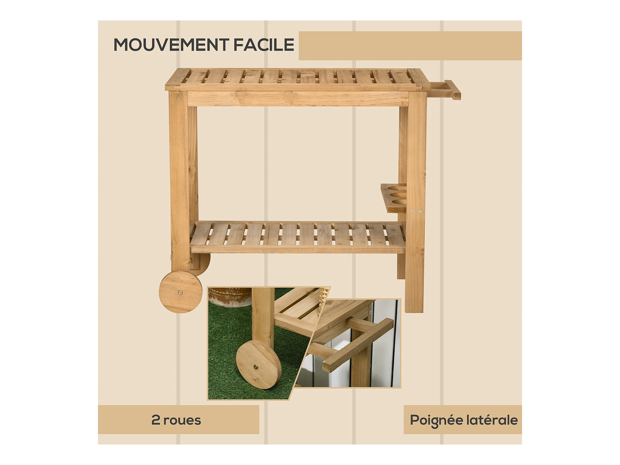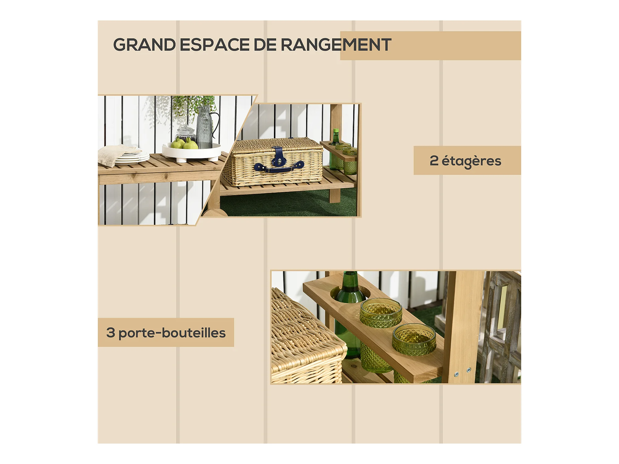 Desserte de jardin - desserte pour plancha - étagère, 3 porte-bouteilles, 2 roues, poignée - bois sapin pré-huilé