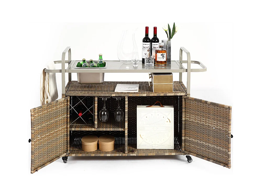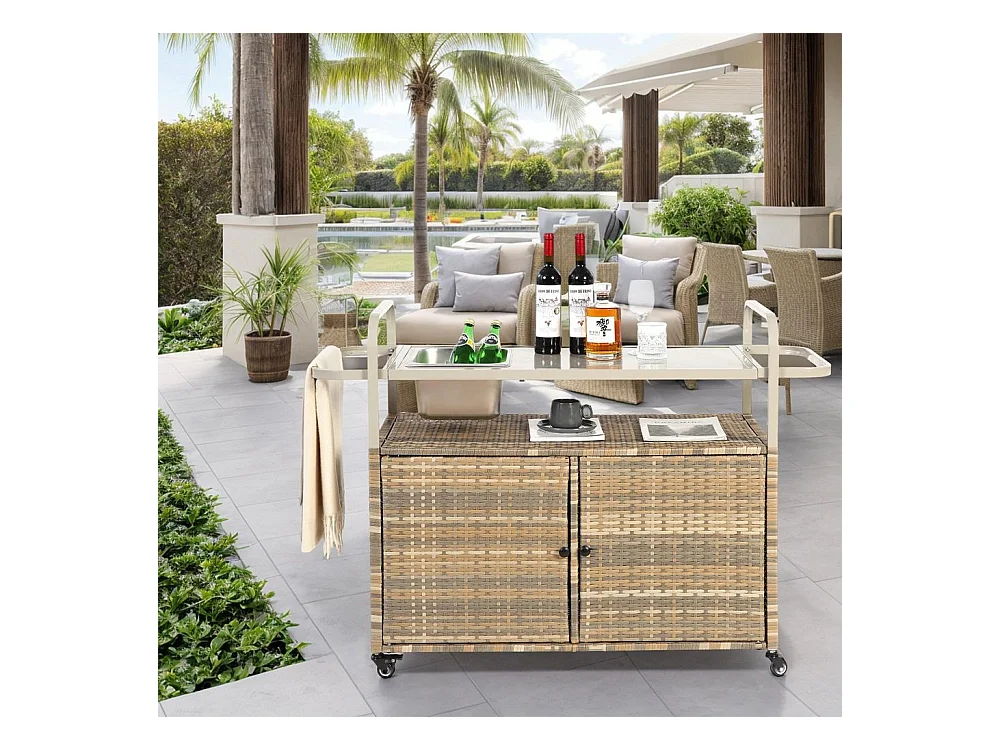 Desserte table de bar d'extérieur chariot de bar en osier avec armoire avec plateau en acier et un seau à glace roues verrouillables beige