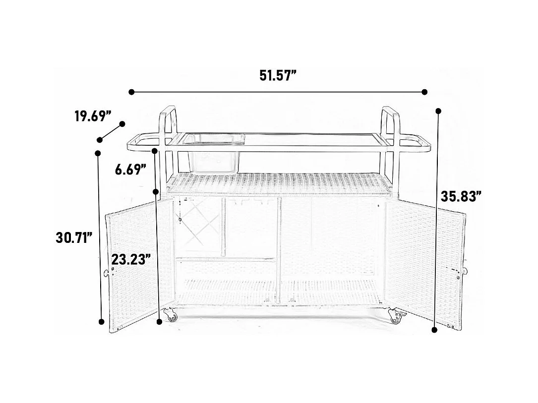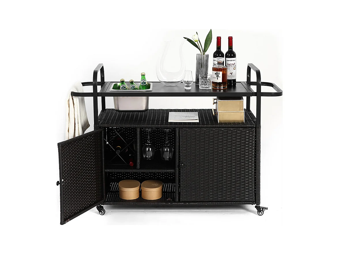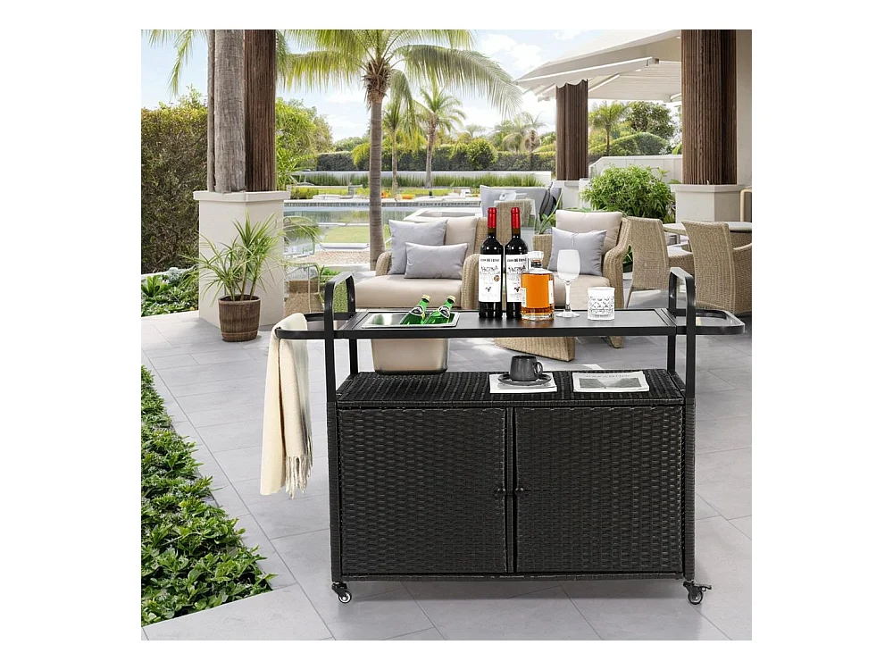 Desserte table de bar d'extérieur chariot de bar en osier avec armoire avec plateau en acier et un seau à glace roues verrouillables noir