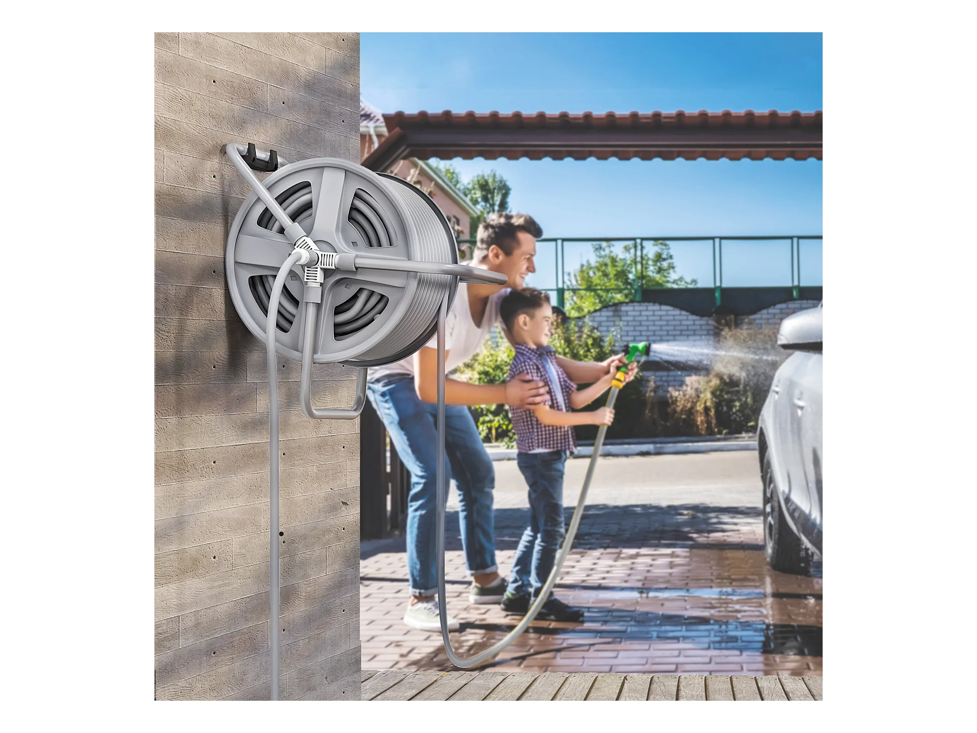 Dévidoir mural enrouleur automatique pivotant 180° tuyau 25 + 2 m avec lance arrosage 7 modes support mural intégré gris clair bleu