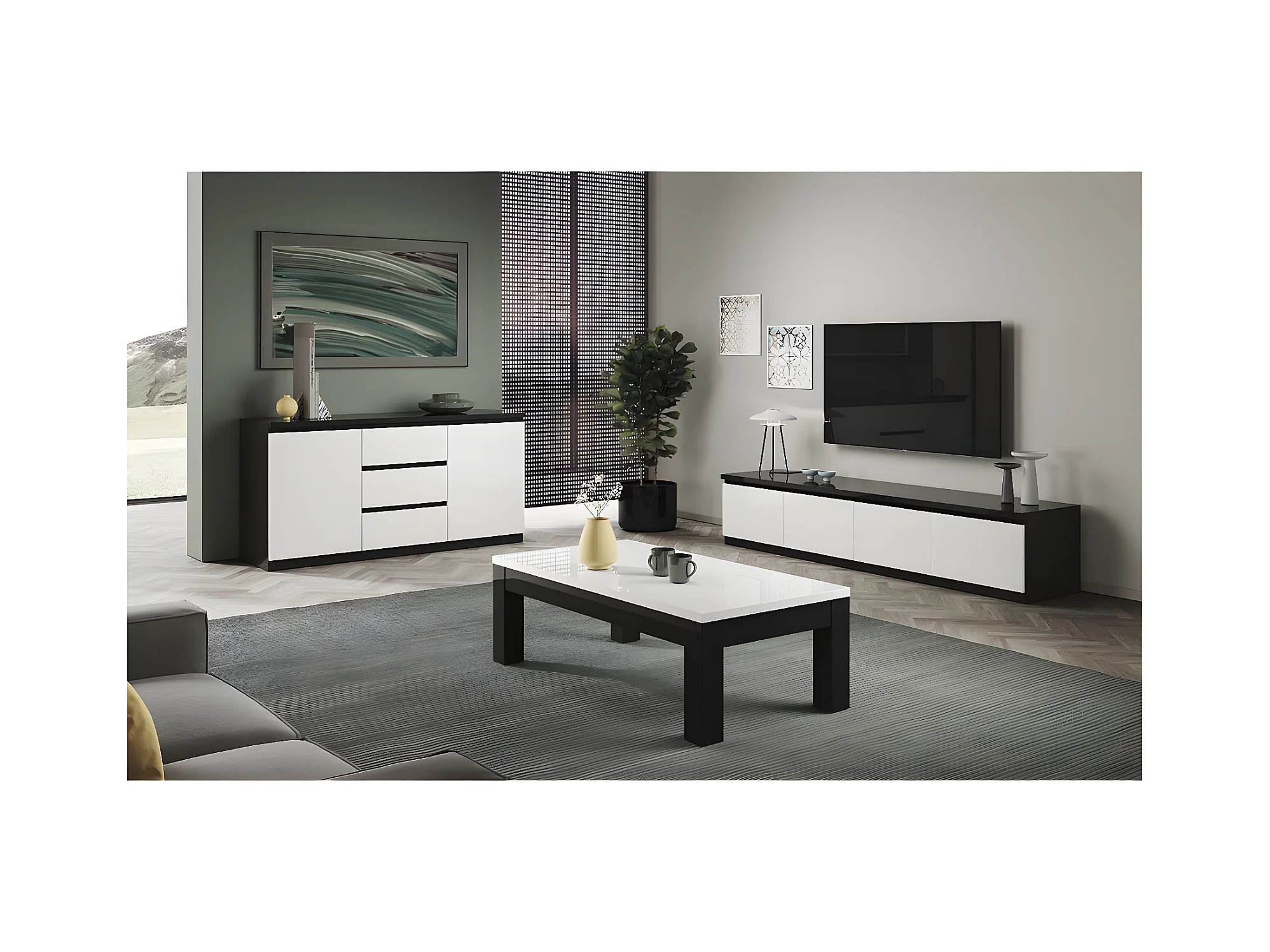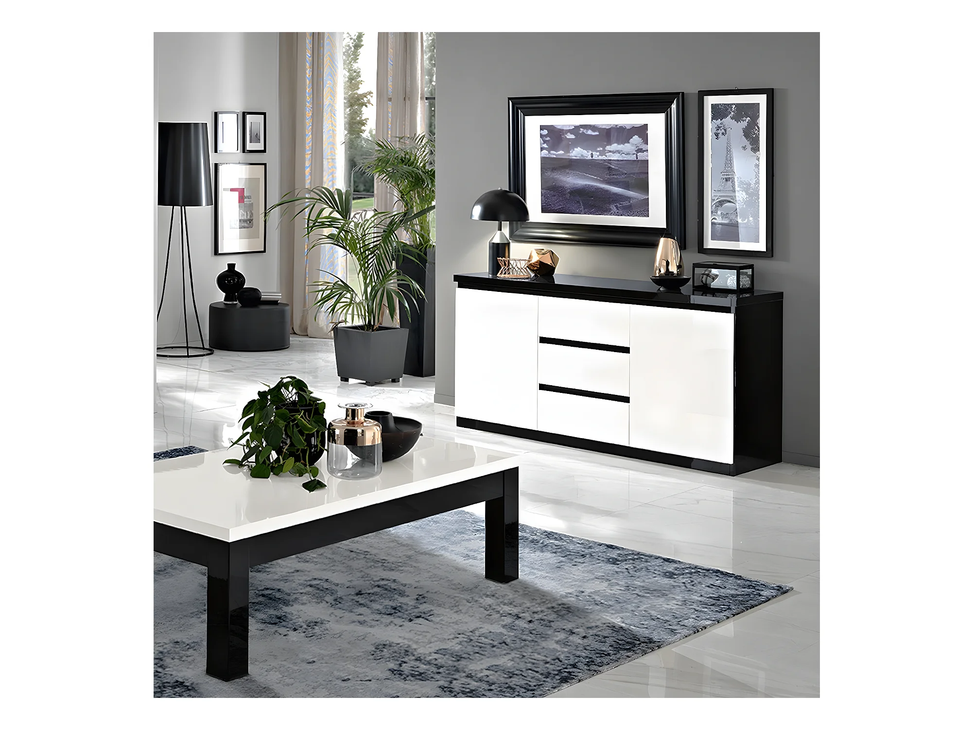 DEYTON - Buffet 2 Portes 3 Tiroirs Laqué Noir et Blanc Brillant