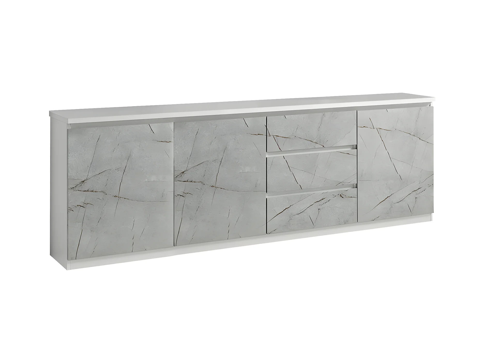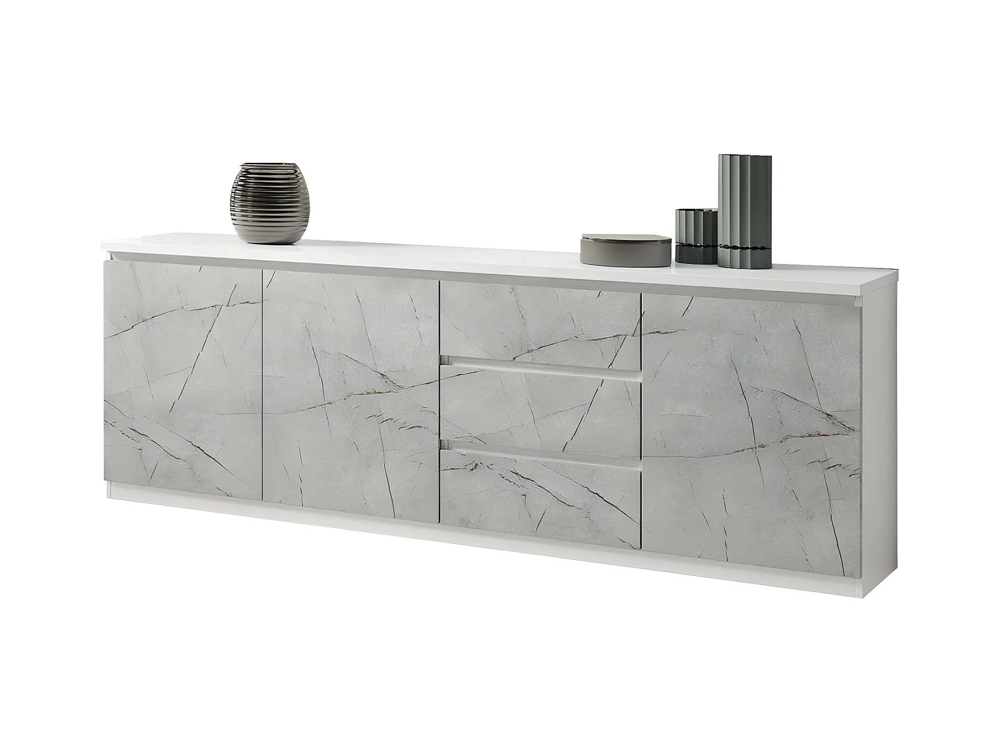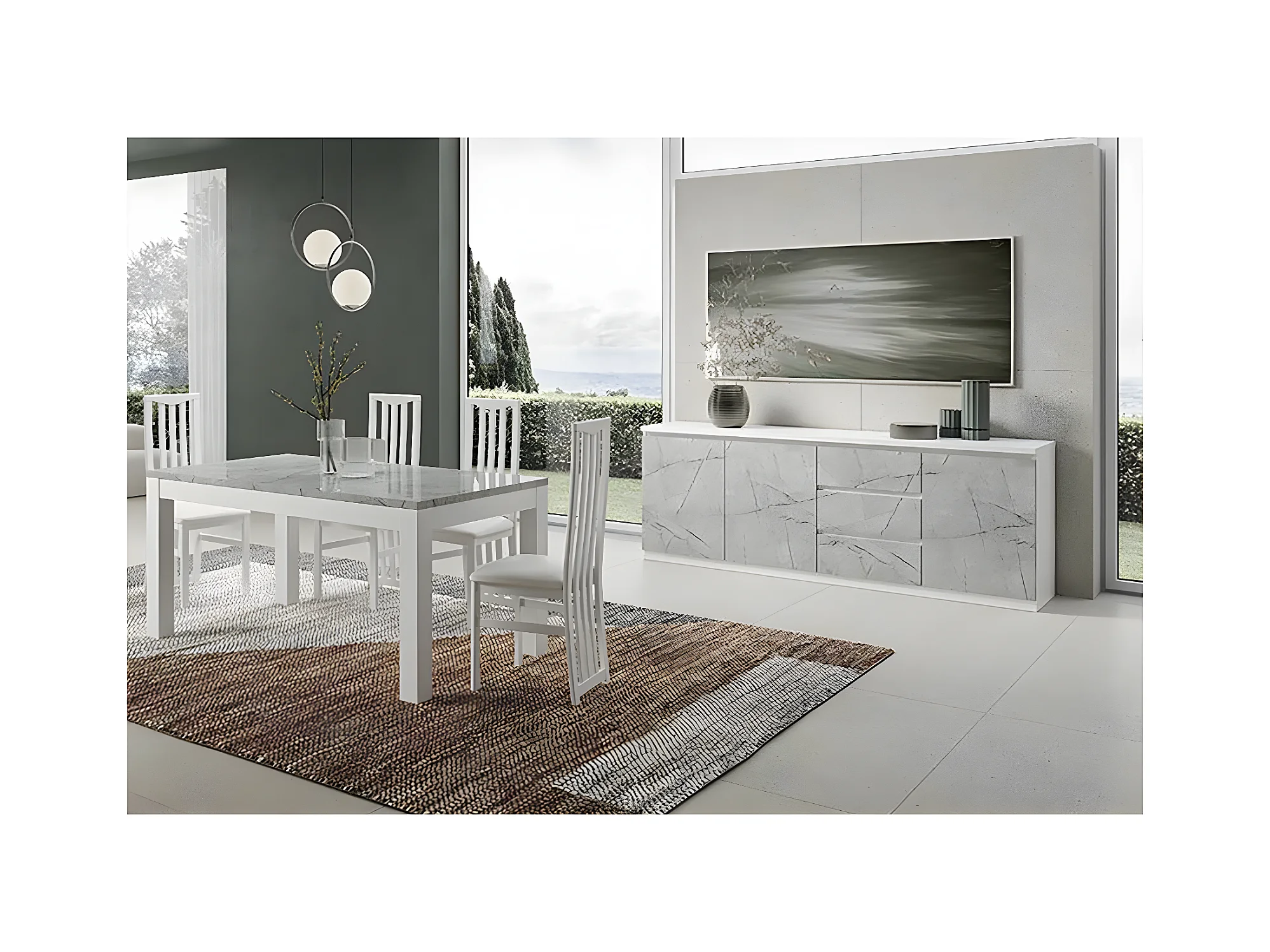 DEYTON - Ensemble Séjour Blanc et Gris Marbré Table 190cm + Buffet 3 Portes