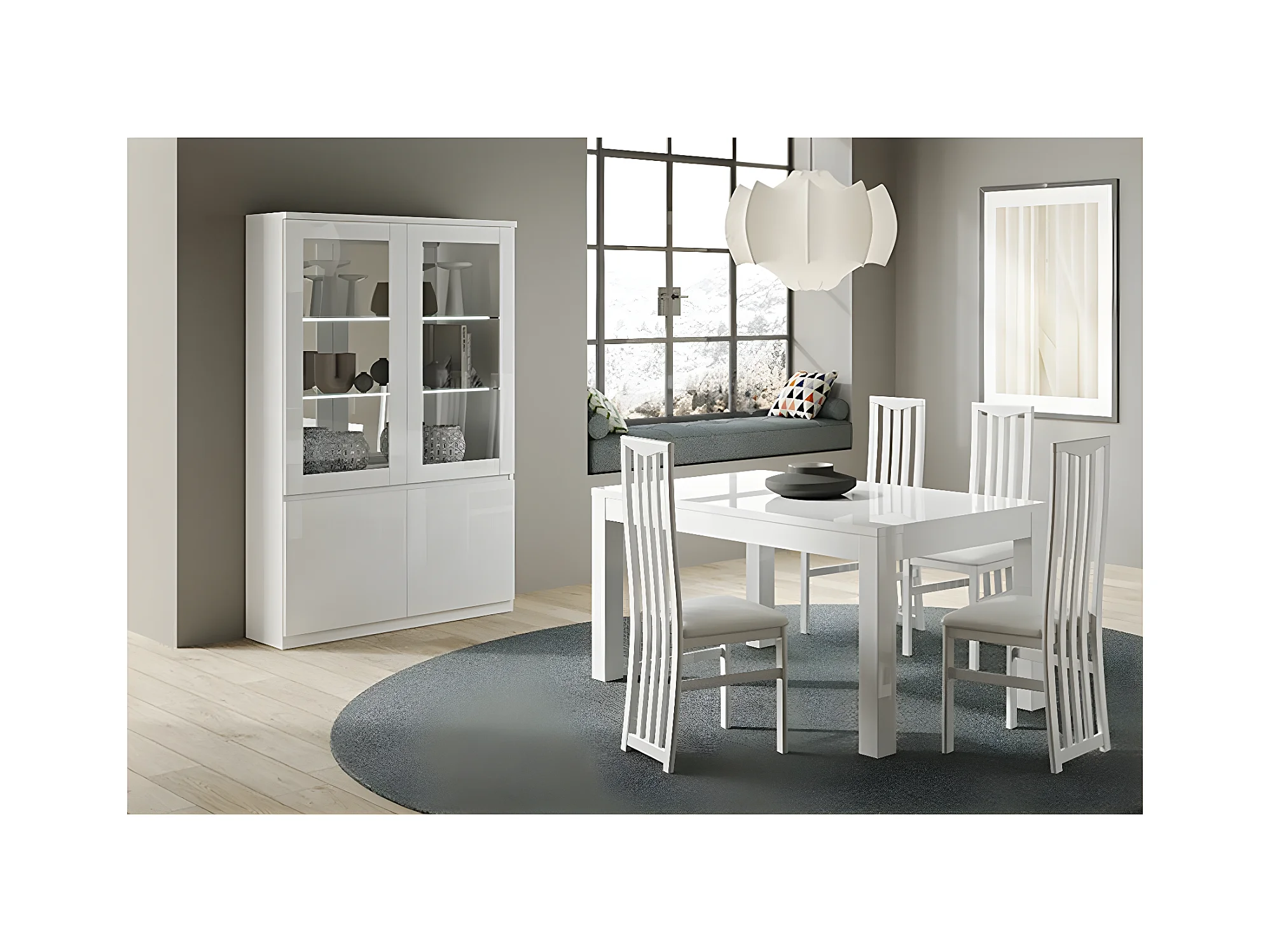 DEYTON - Ensemble Séjour Laqué Blanc Table 190cm + Vitrine avec Leds