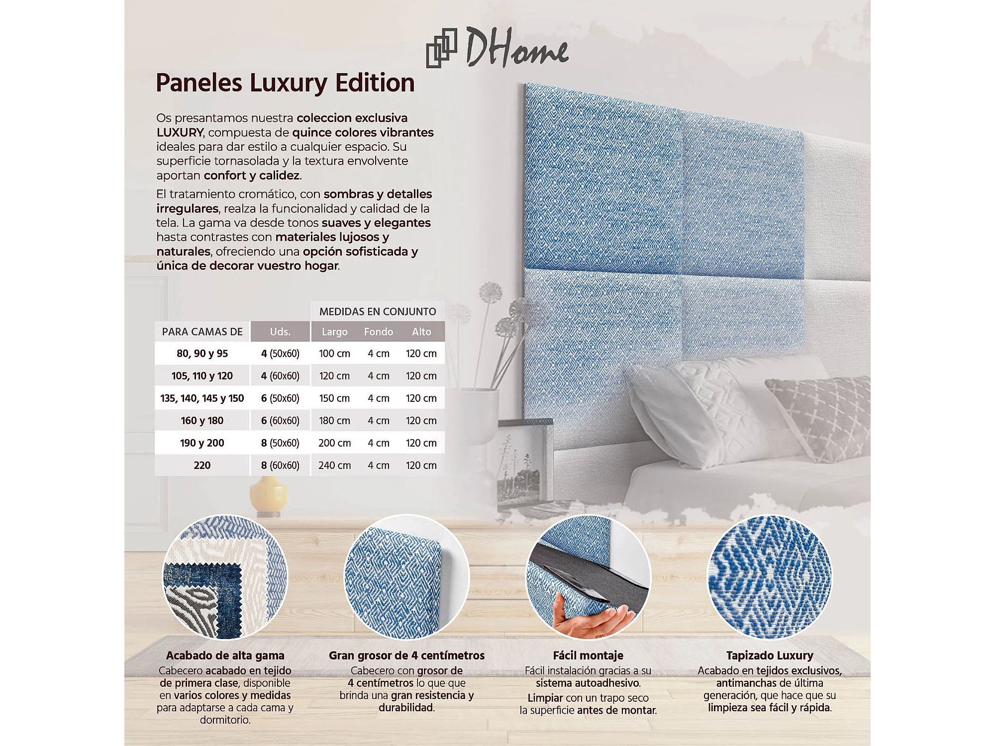DHOME Panneaux Tapissés Exclusifs Série Luxury Edition Autoadhésifs pour Mur Acoustiques Absorbants Protection Chocs (Épis Azul, 50x30cm)