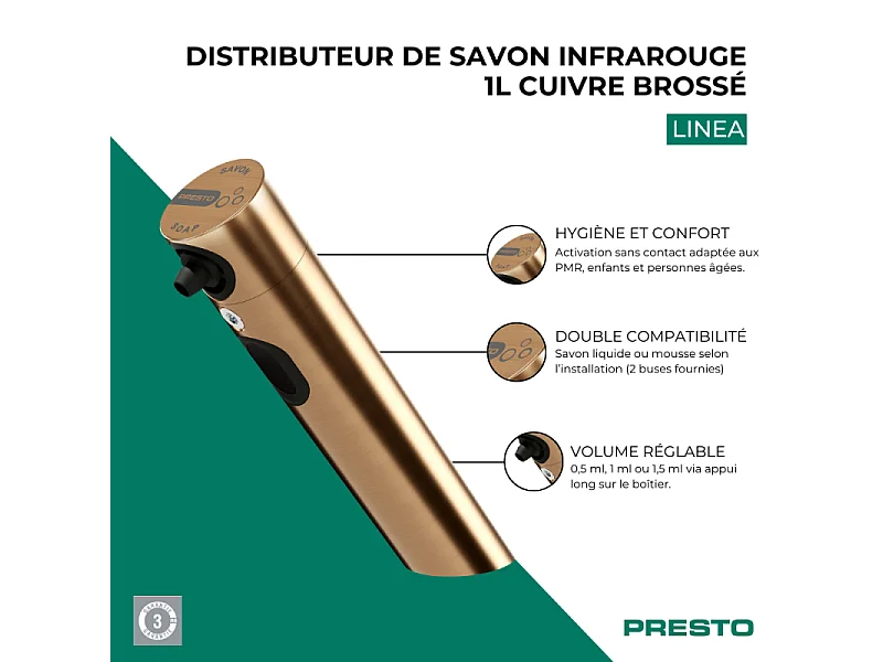 Distributeur de savon infrarouge 1L PRESTO Linea cuivre brossé