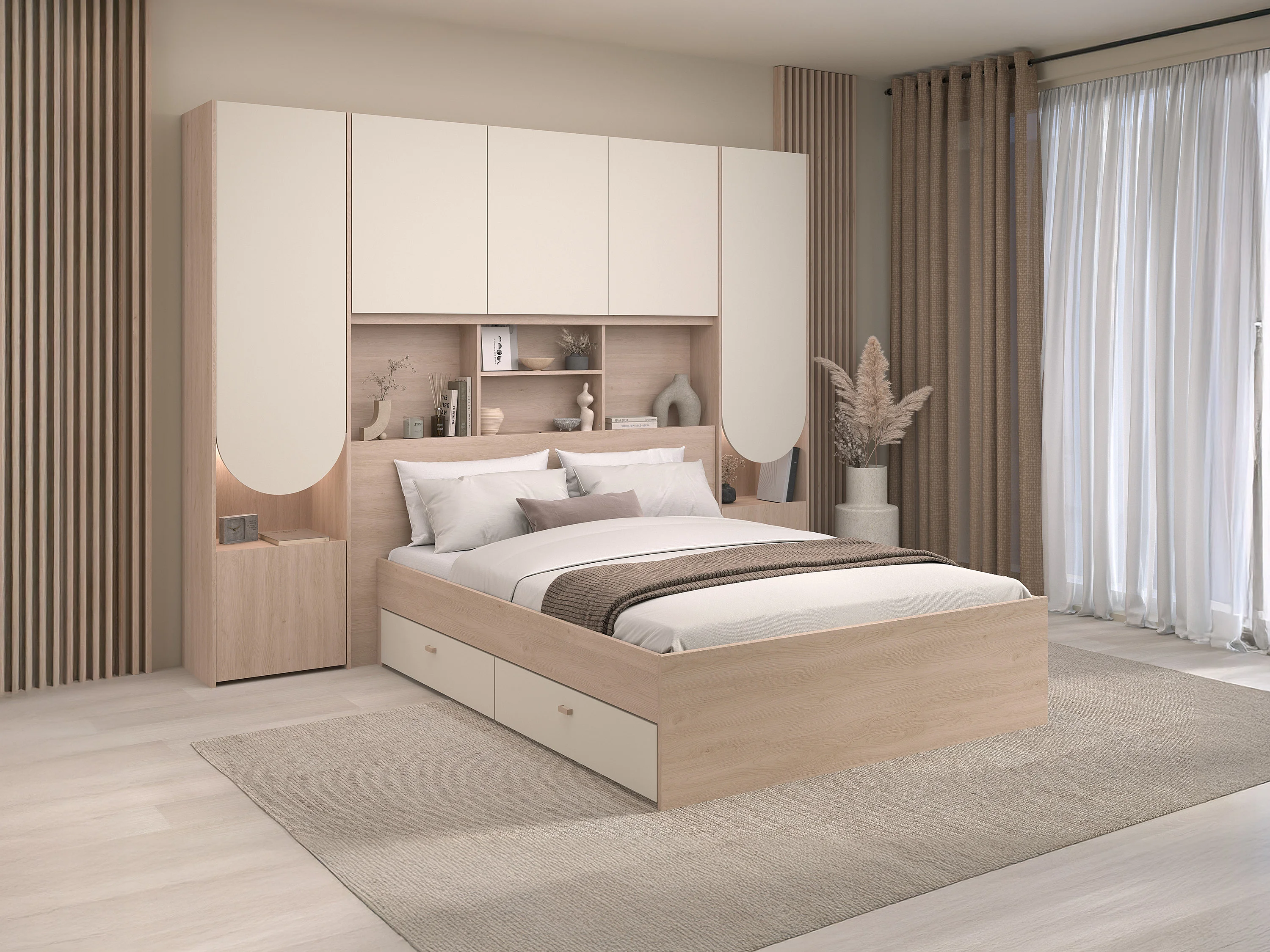 Lit pont 160 x 200 cm avec rangements - Avec LEDs - Coloris : Beige et naturel + Sommier - DOMELITO