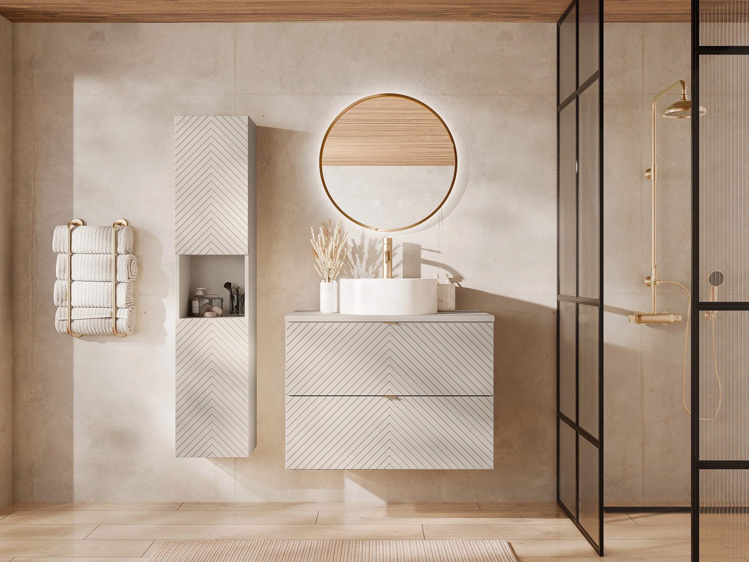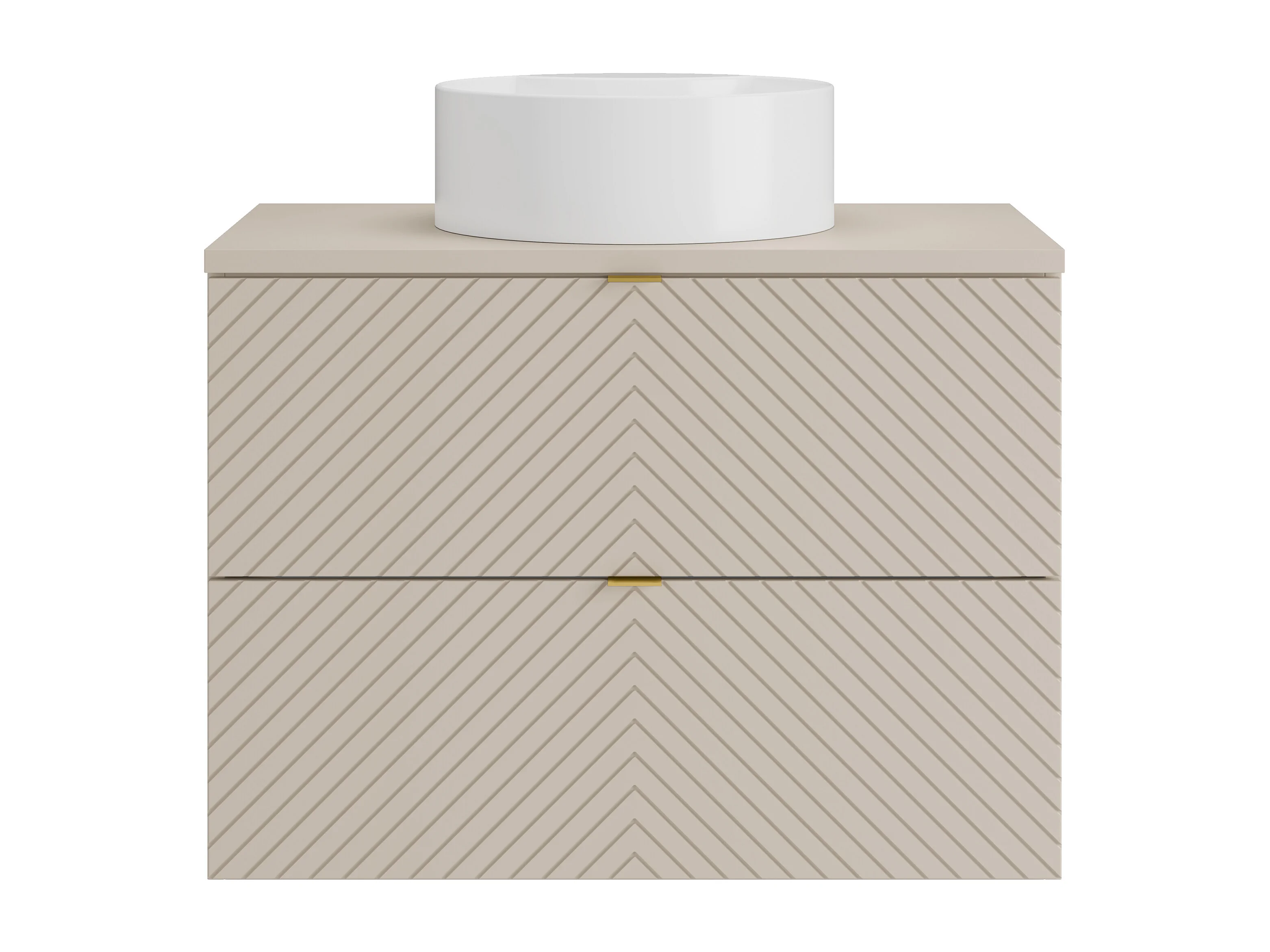 Meuble de salle de bain suspendu en chevrons avec vasque à poser ronde et colonne - Beige - 80 cm - DORIONI