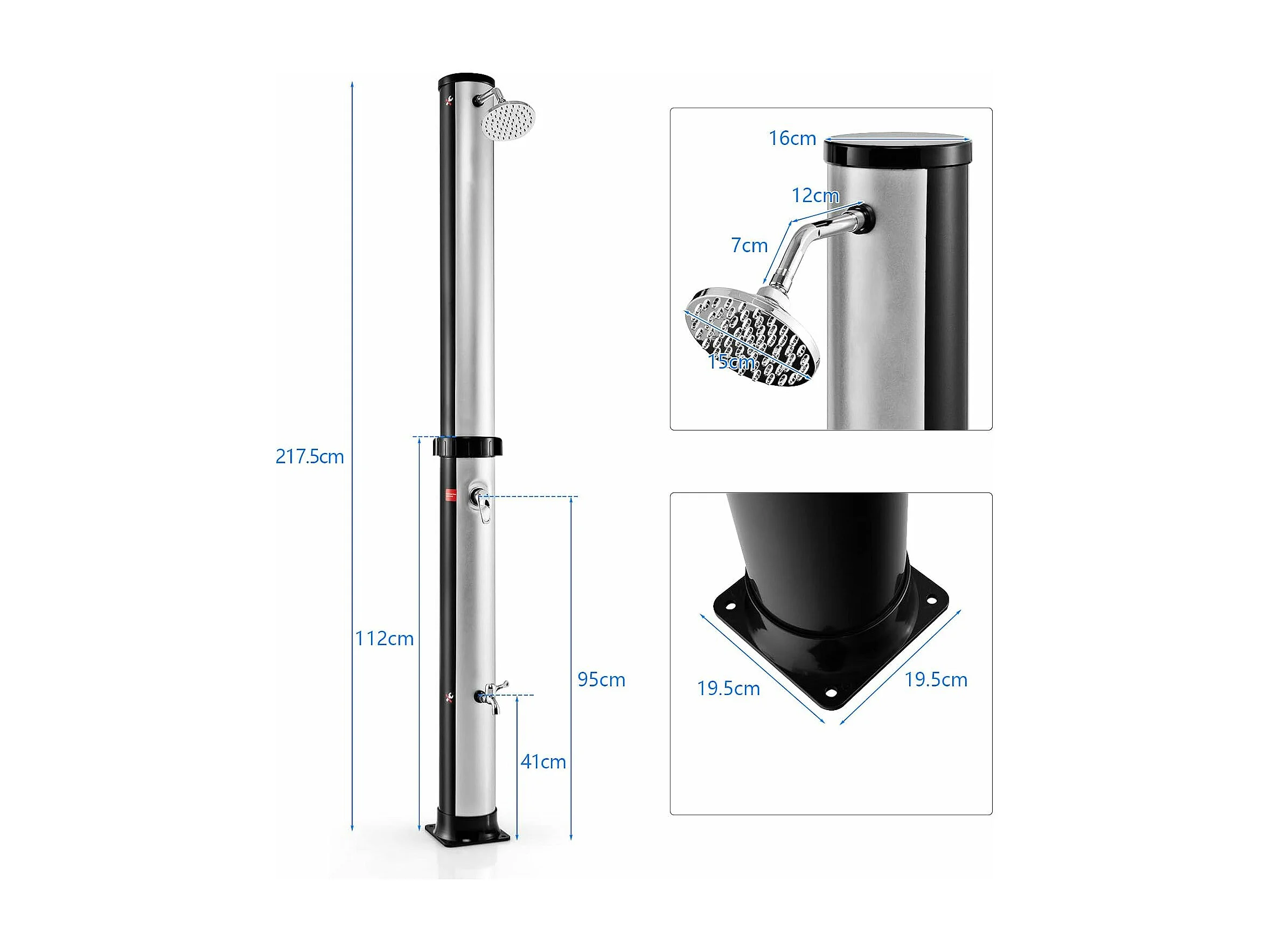 Douche Solaire de Jardin 38L 217,5cm avec Pommeau de Douche à Rotation Libre Température et Pression Robinet Réglable Argent