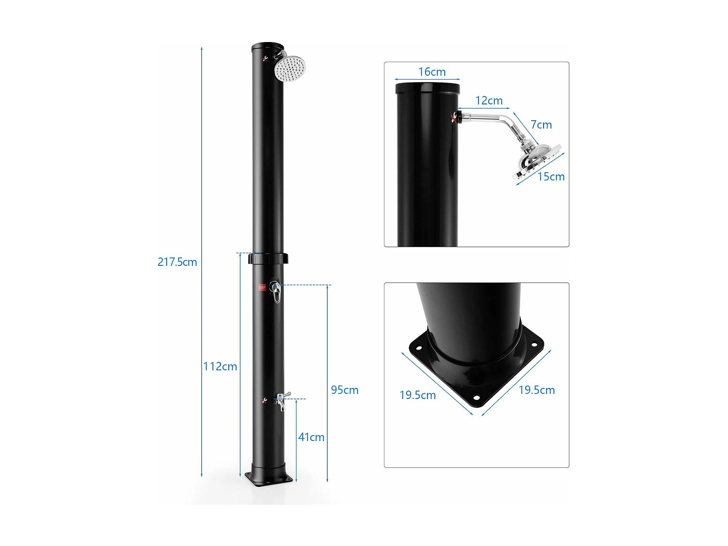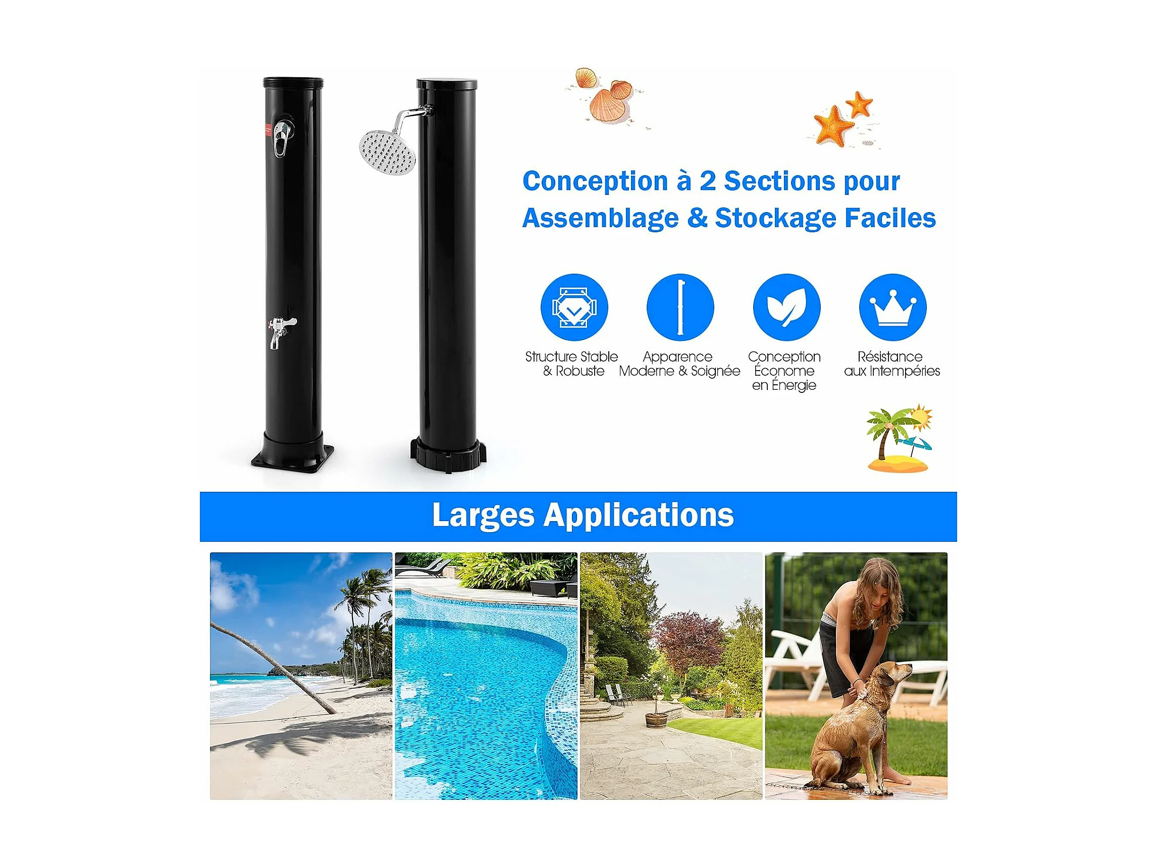 Douche Solaire de Jardin 38L 217,5cm avec Pommeau de Douche à Rotation Libre Température et Pression Robinet Réglable Noir
