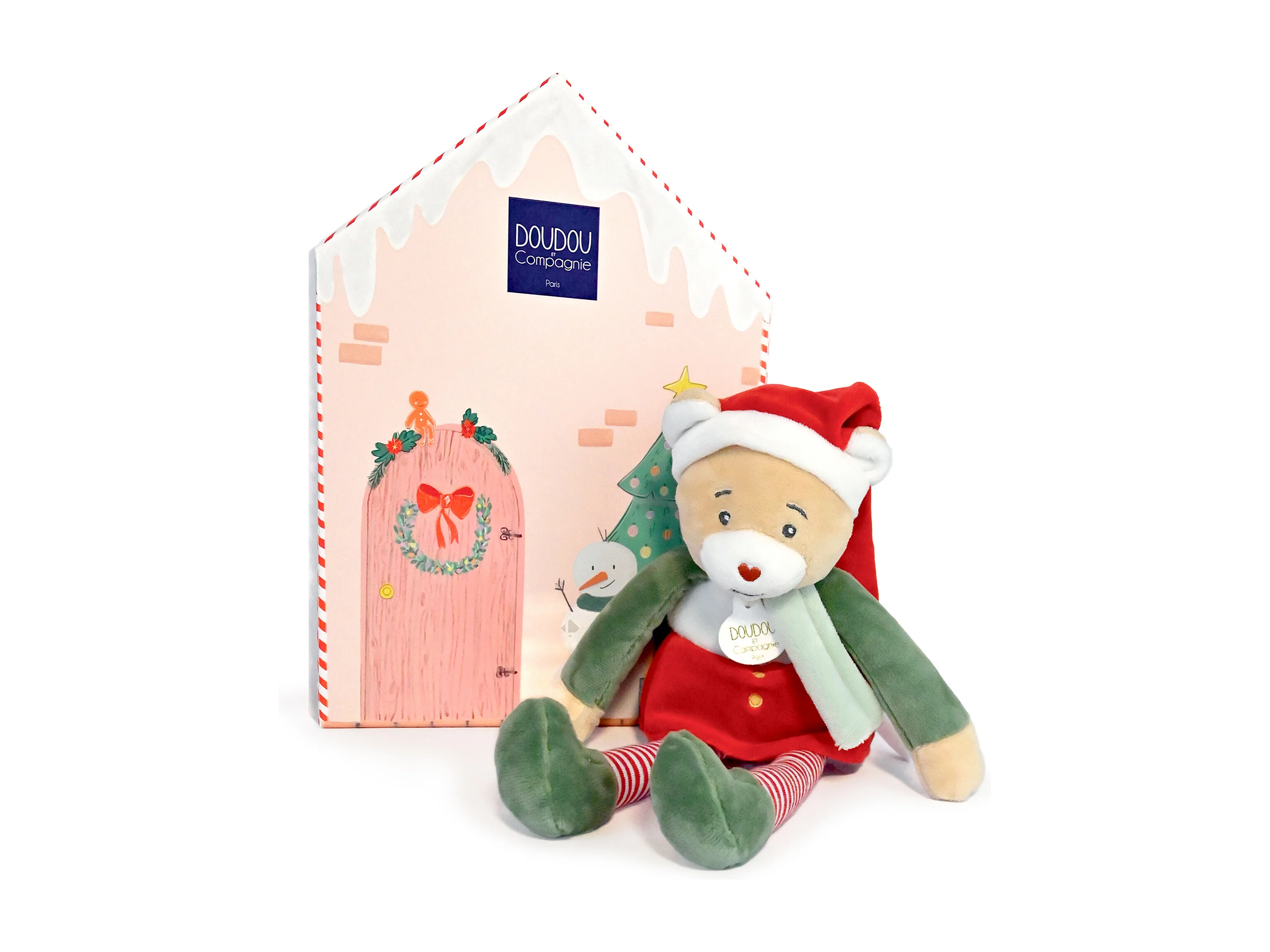 Doudou ours 27 cm collection DOUDOU FARCEUR Cannelle rouge et vert