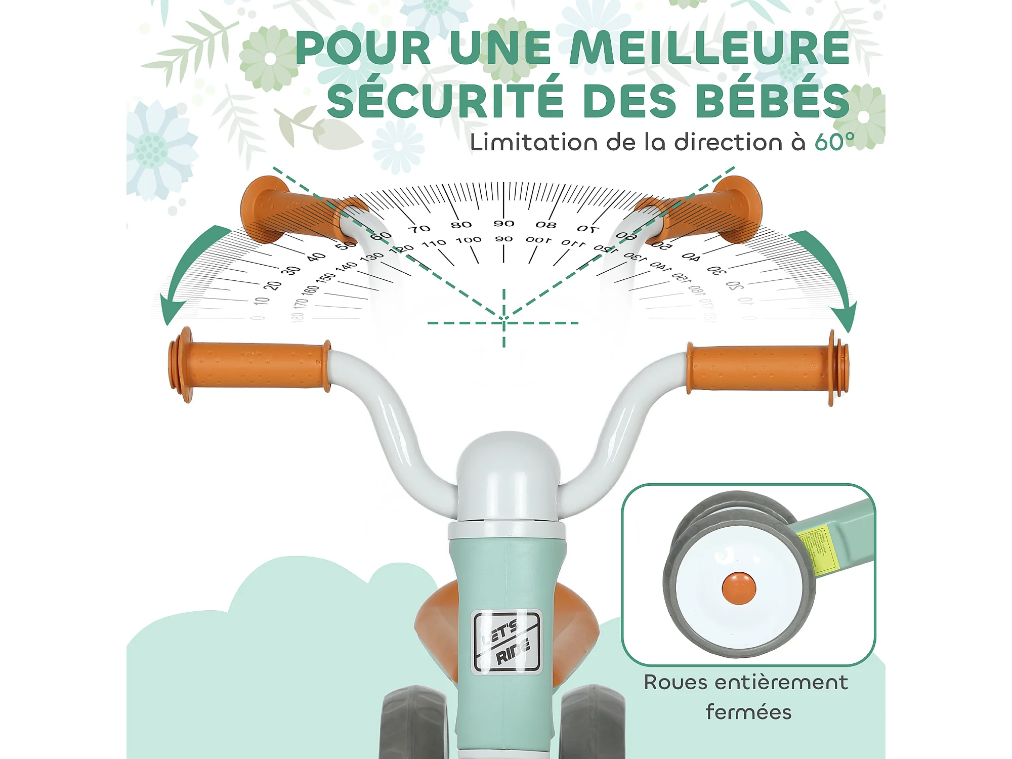 Draisienne 3 roues enfant 12-36 mois pneu EVA silencieux grande selle métal vert d'eau