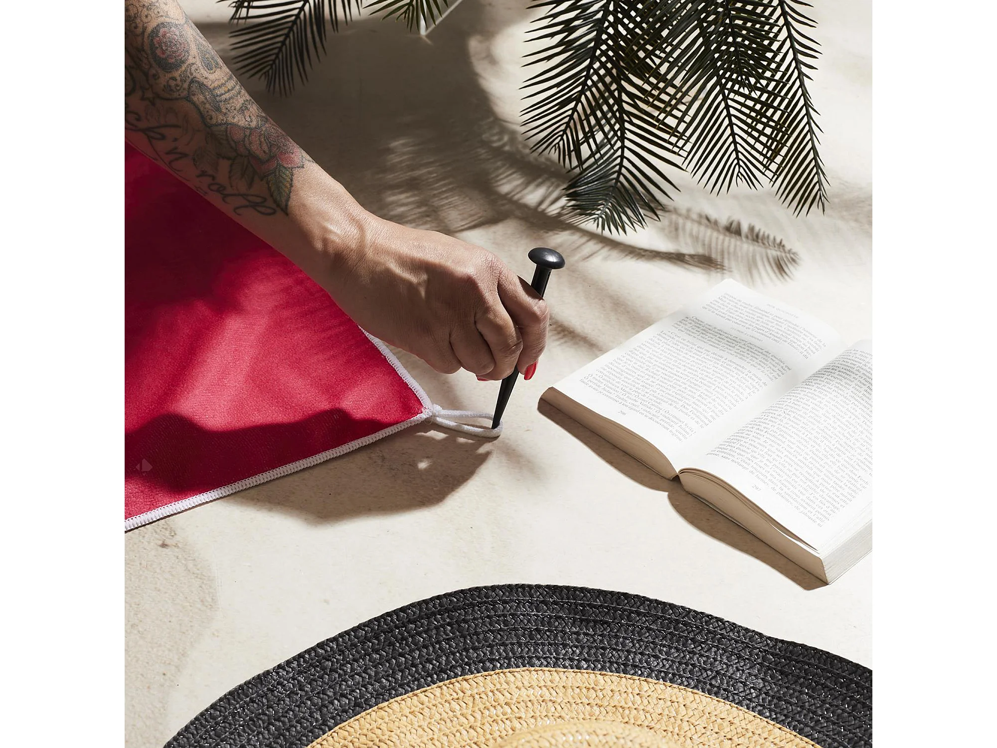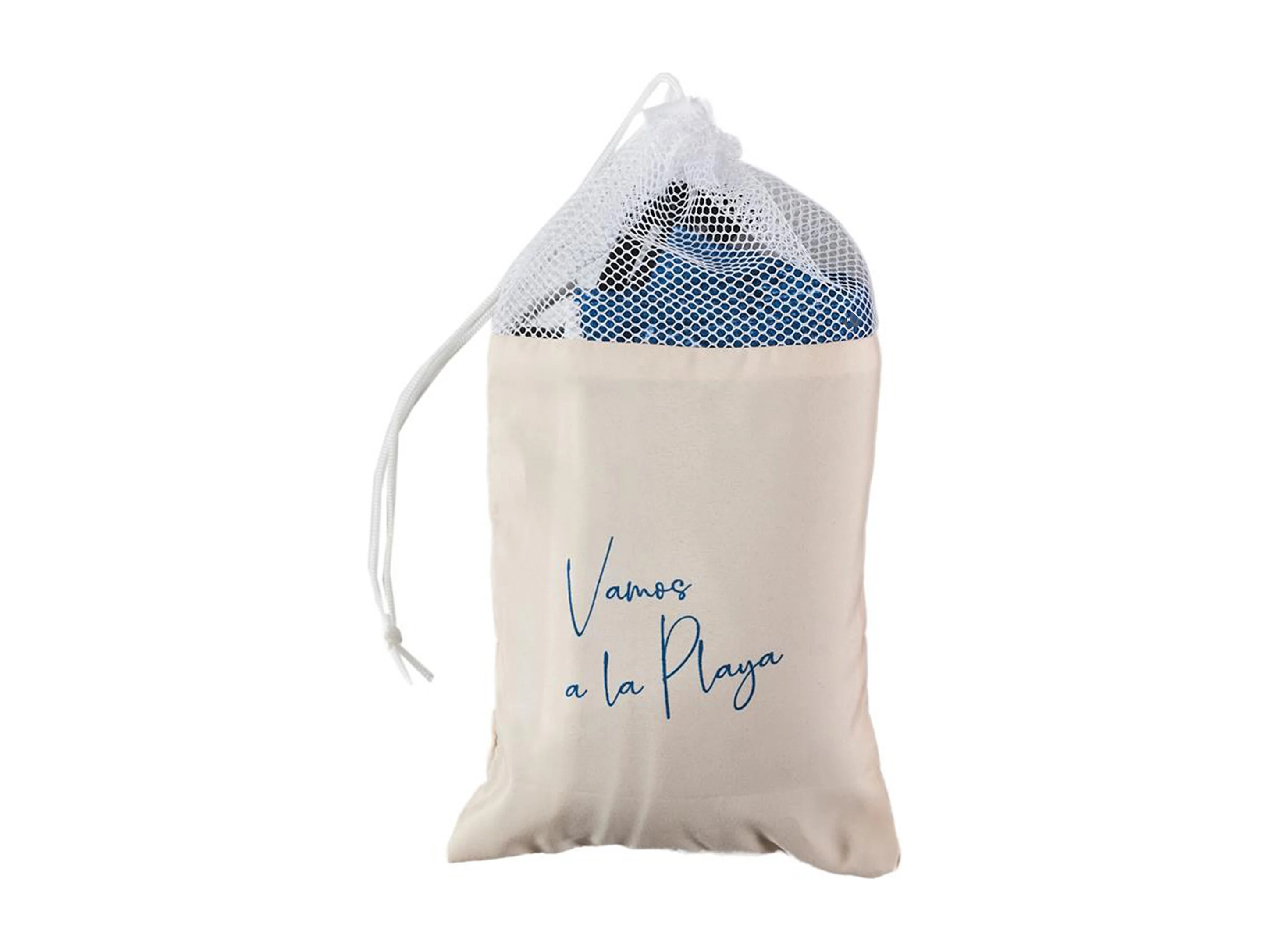 Drap de plage 70x140 cm en microfibre avec ses piquets et son sac PLAYA modèle "Vamos a la playa" bleu
