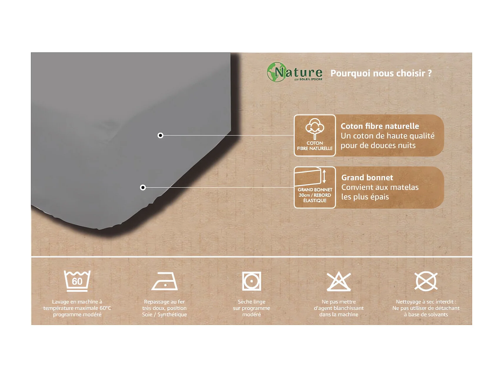 Drap housse en coton 90x190 cm PERCALE gris, par Soleil d'ocre