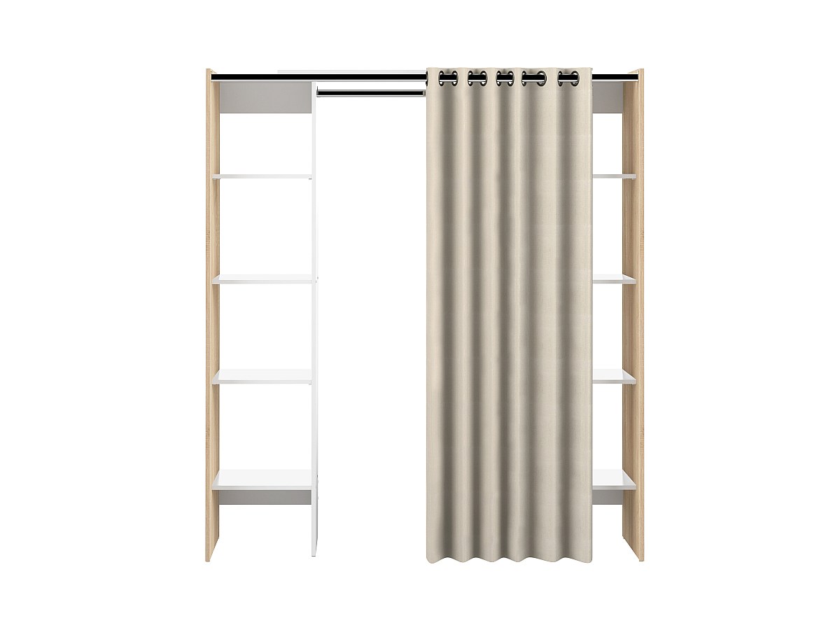 Les deux colonnes composées de nombreuses étagères vous permettront de ranger selon vos envies habits, chaussures ou encore boites. Quant à vos vestes, robes et costumes, ils trouveront leur place dans la grande penderie centrale. Le rideau couleur taupe ou anthracite apportera la touche finale à ce dressing aussi pratique qu'élégant.