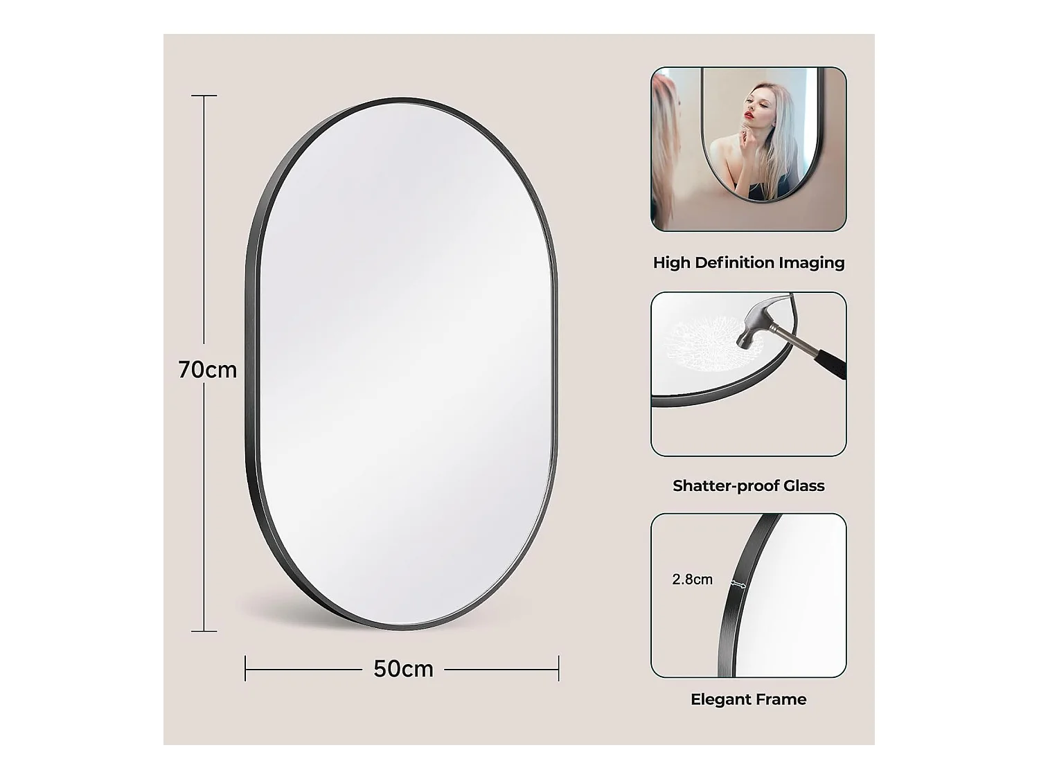 Dripex Miroir Mural 70x50cm Ovale Miroir de Maquillage avec Cadre en Alliage dAluminium Miroir de Dcoration pour Entre Chambre Sal