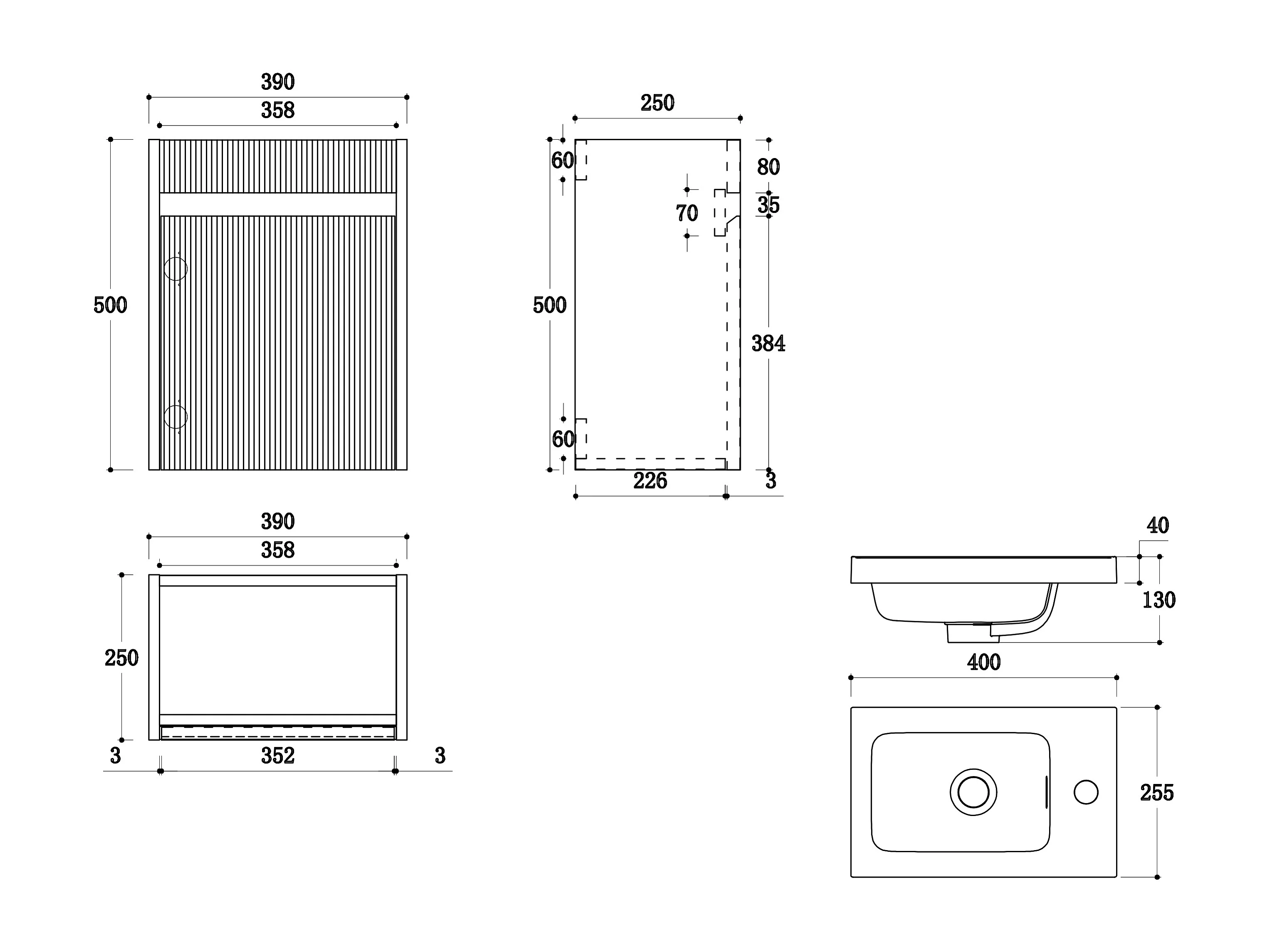 Meuble lave main suspendu strié en bois de frêne avec vasque en résine blanc mat - Naturel clair - 40 x 25.5 x 54 cm - DROVI