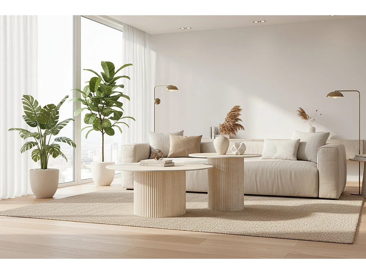 Lot 2 Tables Basses Gigognes MINA Effet Travertin Plateau Céramique Travertin D80xH38cm/D60xH45cm