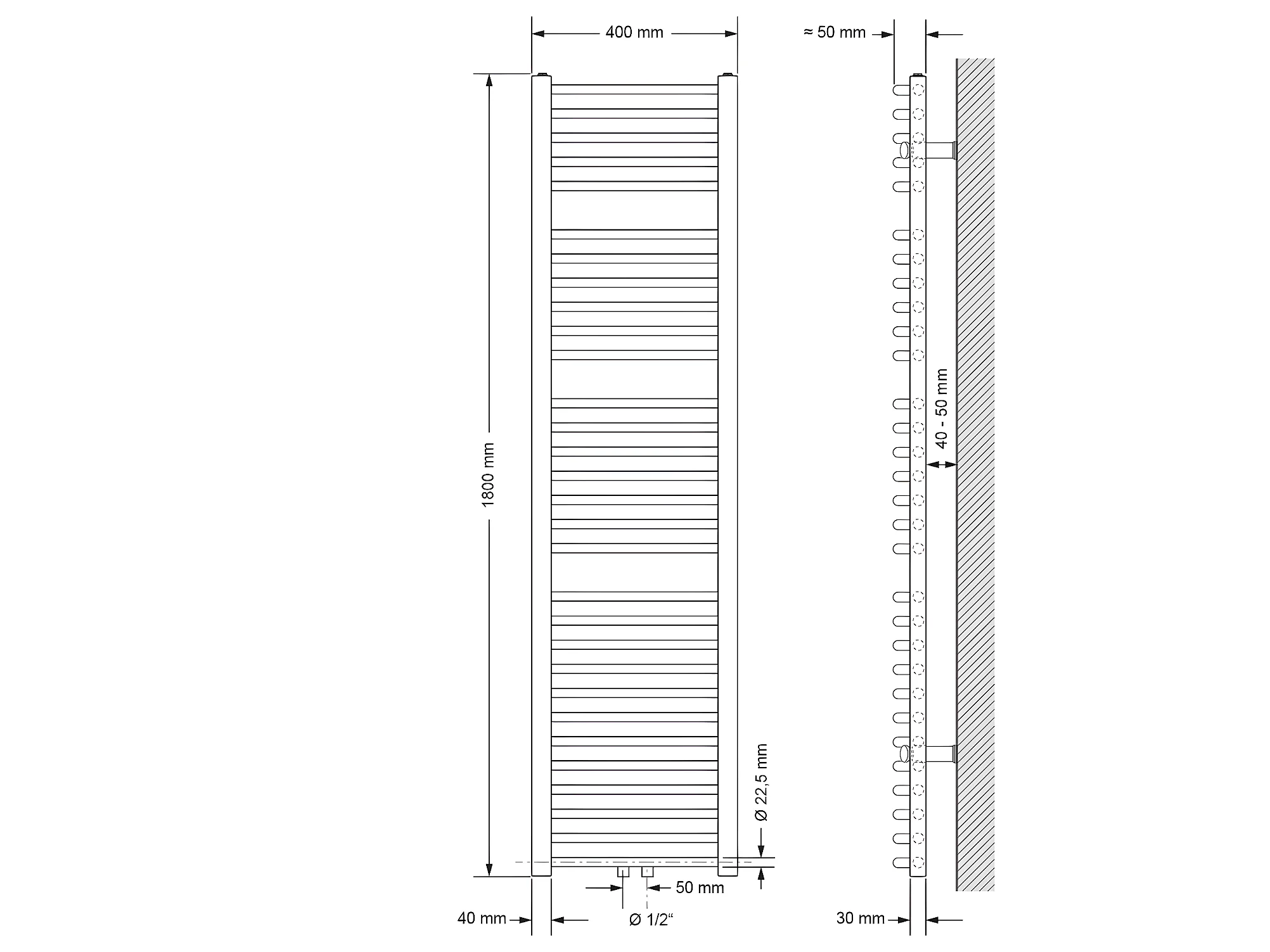 Radiateur sèche-serviette salle de bain droite blanc connexion central 40x180 cm