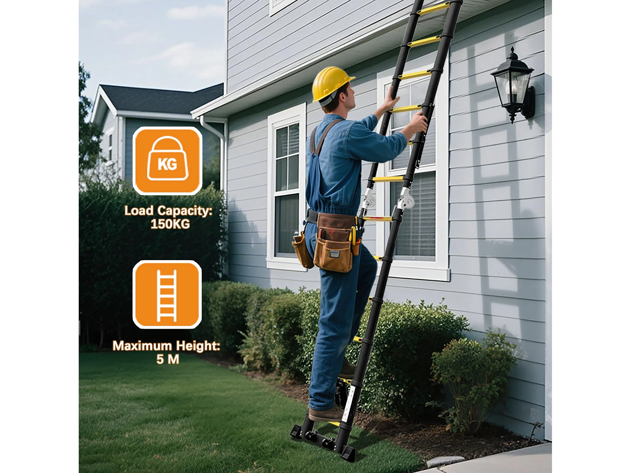 Échelle télescopique de 3.8 m (1,9+1,9), échelle pliante avec poulies en bas, capacité de charge de 150 kg, noir