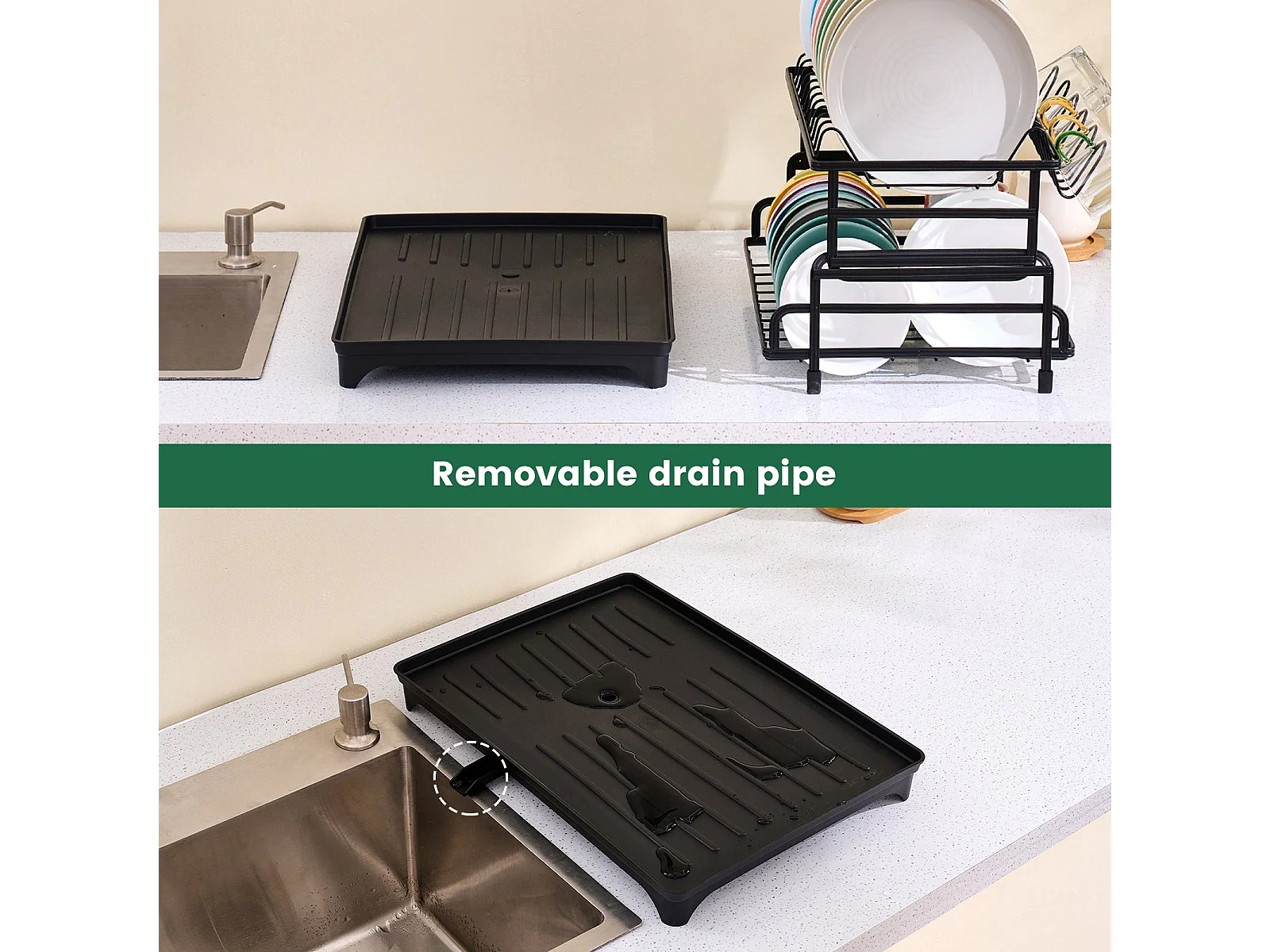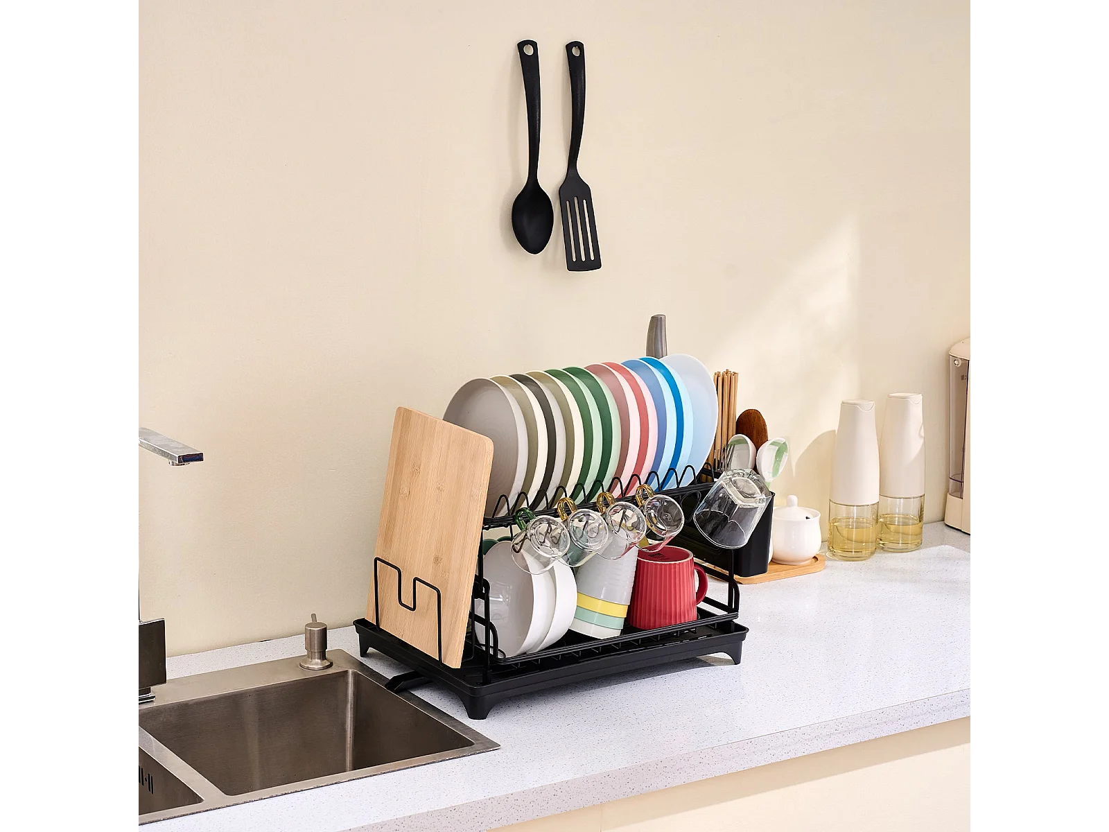 Égouttoir à Vaisselle Noir 2 Niveaux avec Porte-Ustensiles et Bac d'Égouttement – Design Pratique, Séchage Rapide et Hygiénique