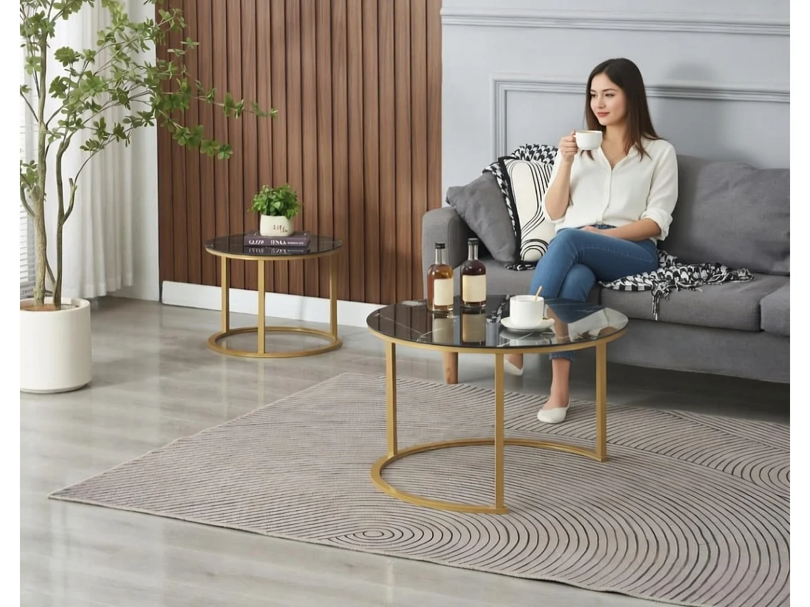 EleganceEssentials – Tables basses rondes – Set de 2 – Table basse ronde – Ø70 & Ø50 cm – Verre trempé effet marbre noir – Pieds dorés mats – Table d’appoint – Tabl