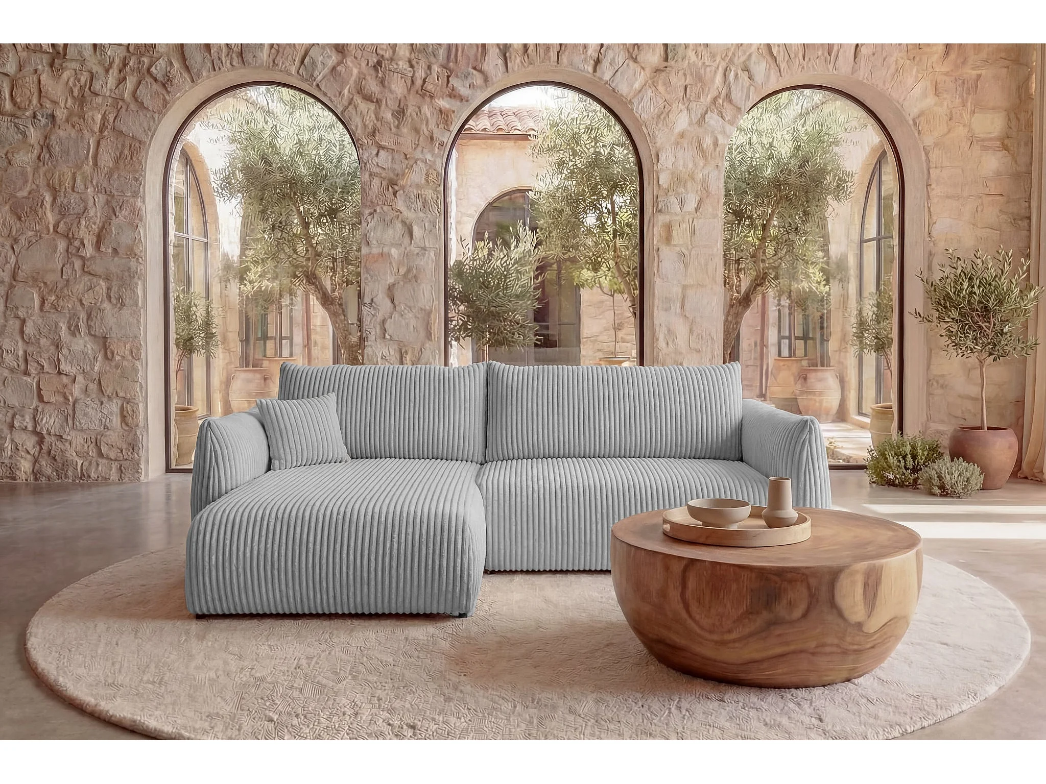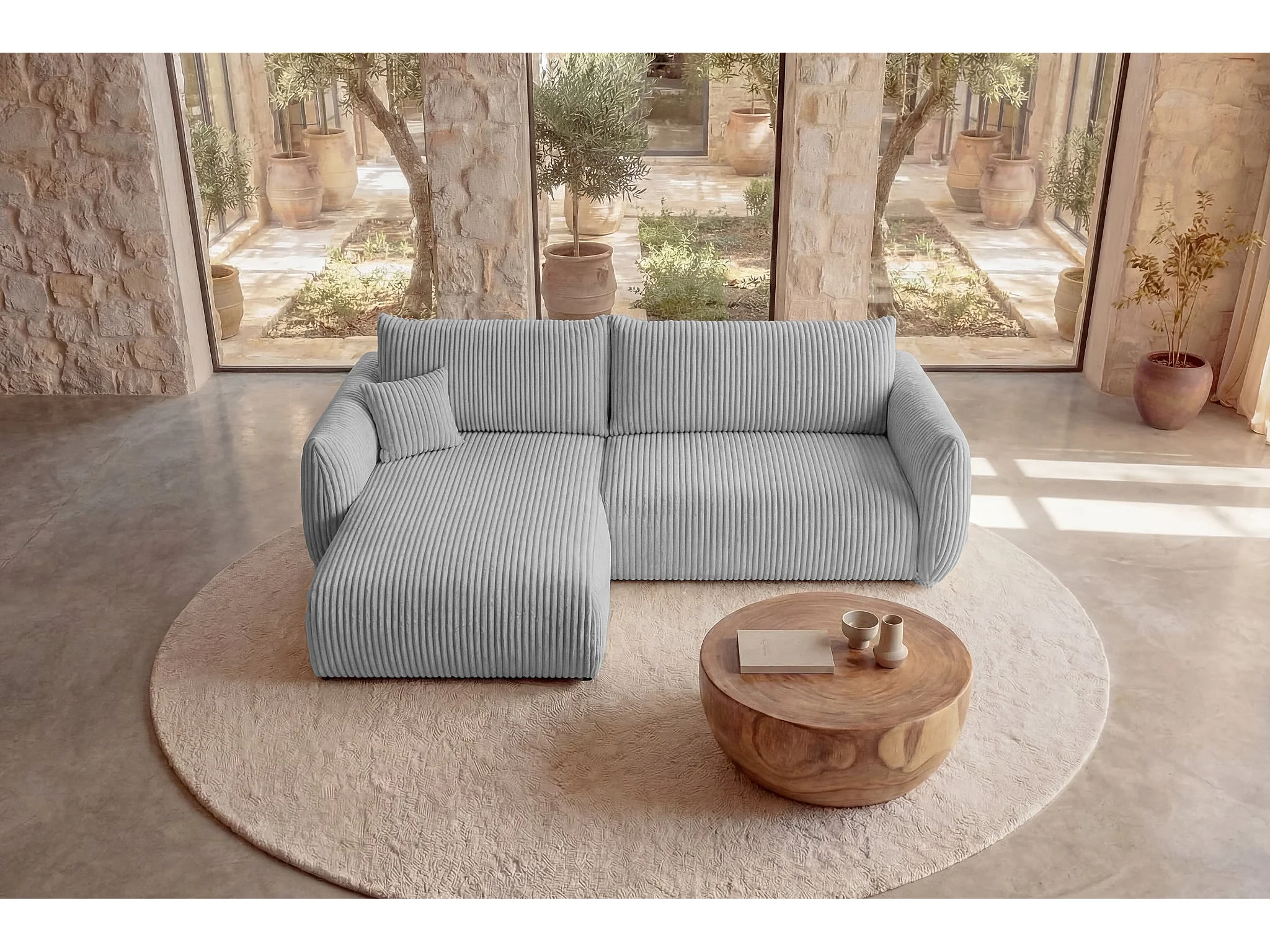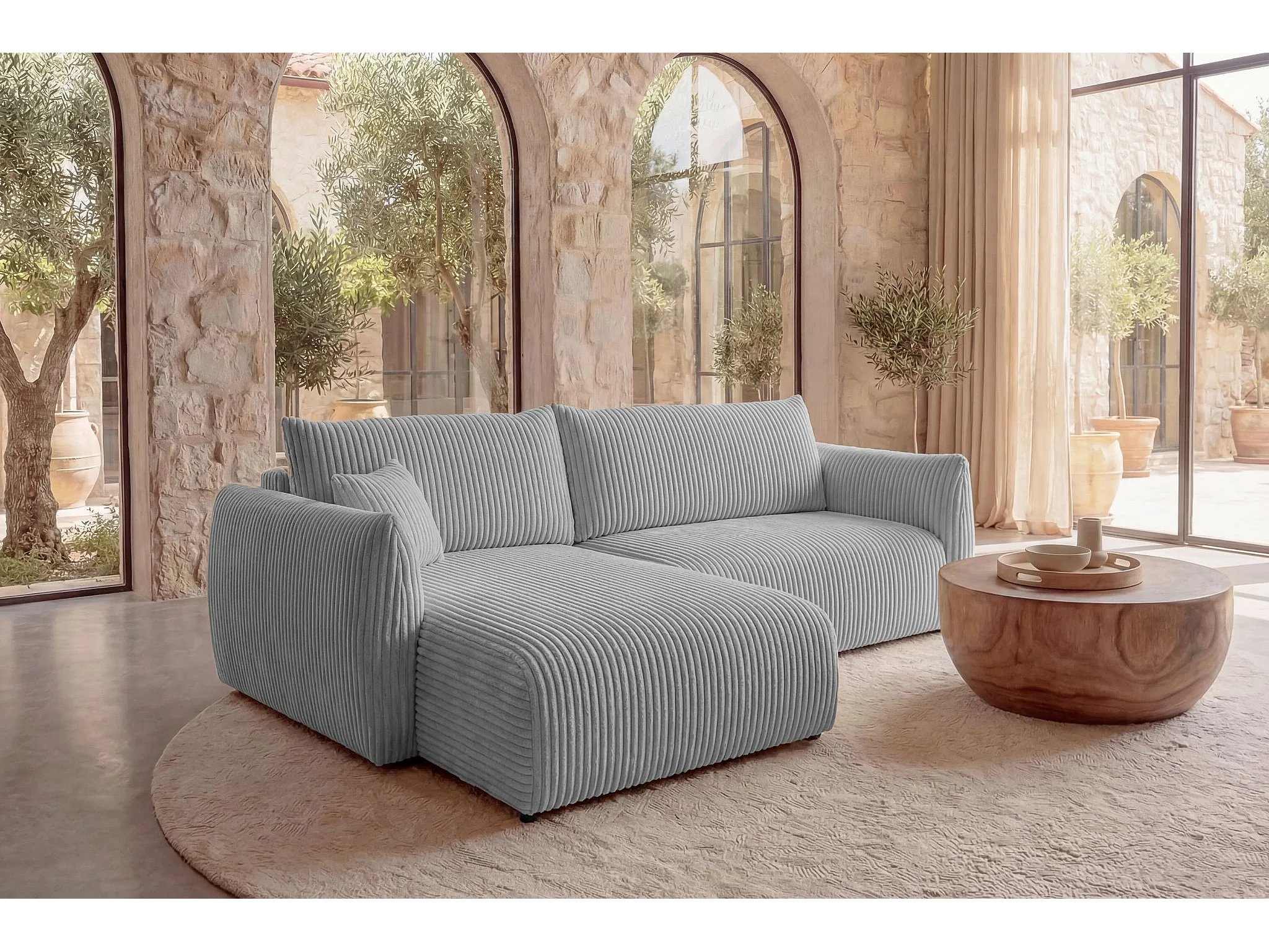 ELIO - Canapé d'angle convertible gros velours côtelé - Gris clair